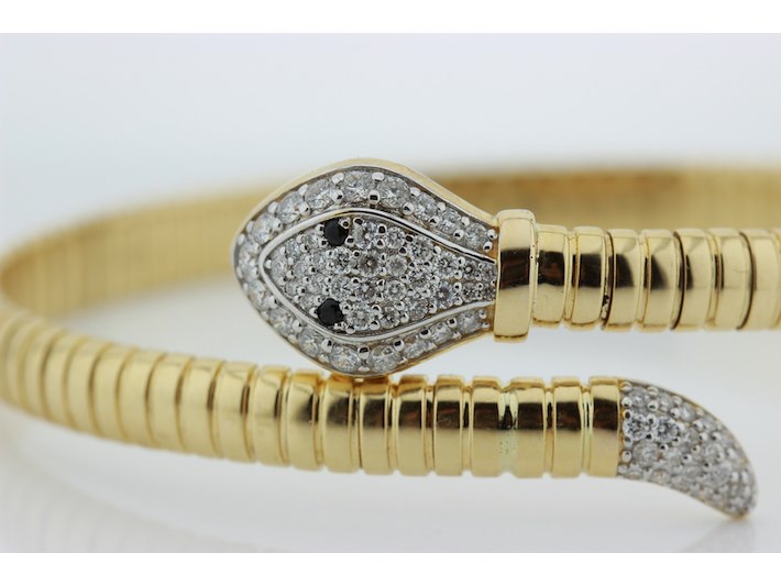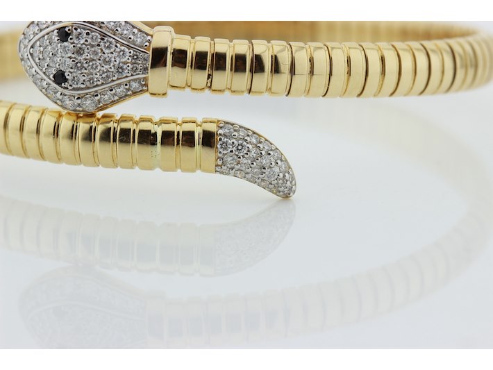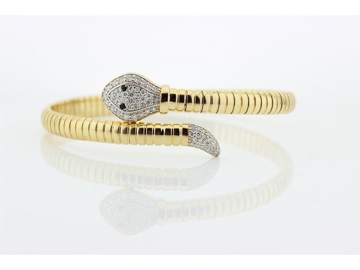 Product: Dames armband Materiaal: 18 karaat geelgoud Afmeting: 17 gram Conditie: nieuw Specificaties: 18 karaats geelgouden flexibele slangen armband gezet met 70 briljant geslepen diamanten met een gewicht van 0,75 crt. Inclusief een armbanden doos en een taxatierapport met een verzekeringswaarde van € 3950,-- afgegeven door een gediplomeerd taxateur. Edelsteen: Natuurlijke diamant Aantal: 70 stuks Slijpvorm: Briljant geslepen Gewicht: 0,75 karaat Kleur: G Zuiverheid: SI