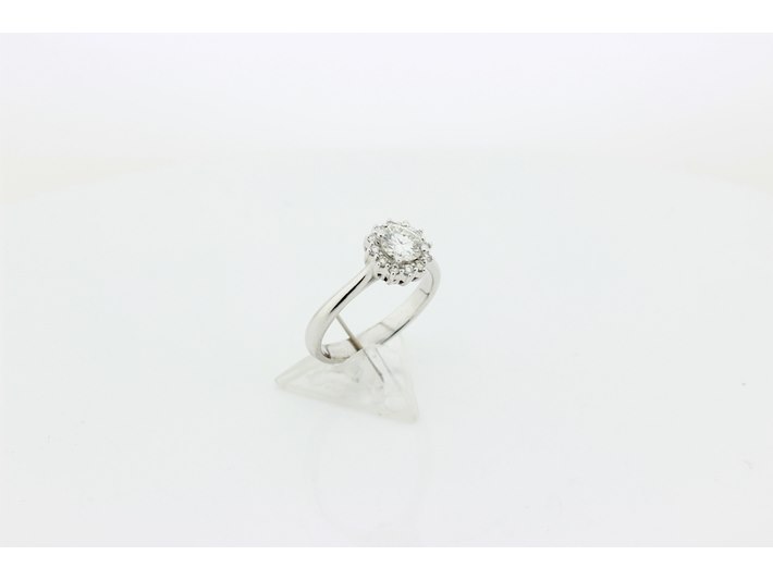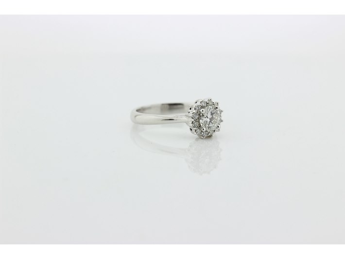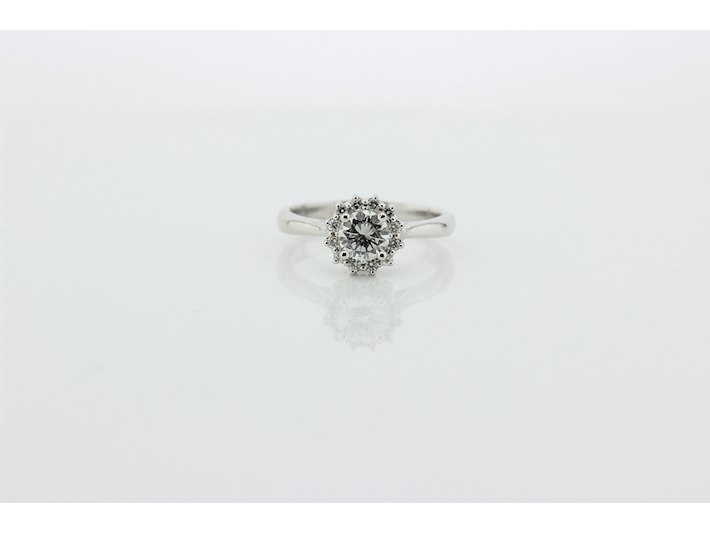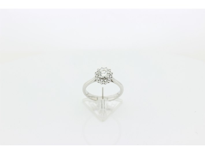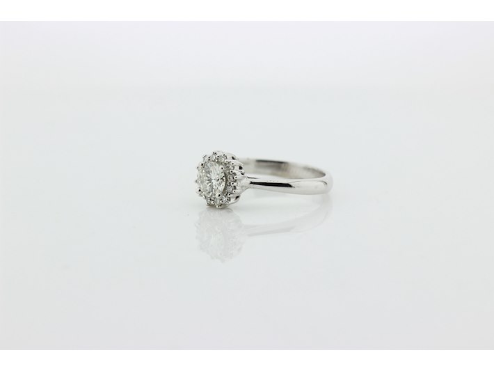 Product: Dames ring Materiaal: 14 karaat witgoud Afmeting: 3,7 gram Conditie: nieuw Specificaties: Solitair gezet met 1 briljant geslepen diamant met een gewicht van 0,51 crt. Kleur G en kwaliteit SI. Hier omheen zijn 12 als briljant geslepen diamanten gezet met een gewicht van 0,14 crt Kleur G en kwaliteit VS. Inclusief een ringen doos en een taxatierapport met een verzekeringswaarde van € 2950,-- afgegeven door een gediplomeerd taxateur. Edelsteen: Natuurlijke diamant Aantal: 1/12 Slijpvorm: Briljant geslepen Gewicht: 0,51 karaat, 0,14karaat Kleur: G Zuiverheid: SIVS ringmaat: 16,5