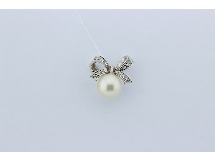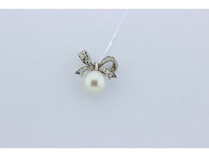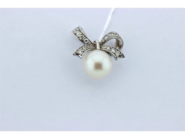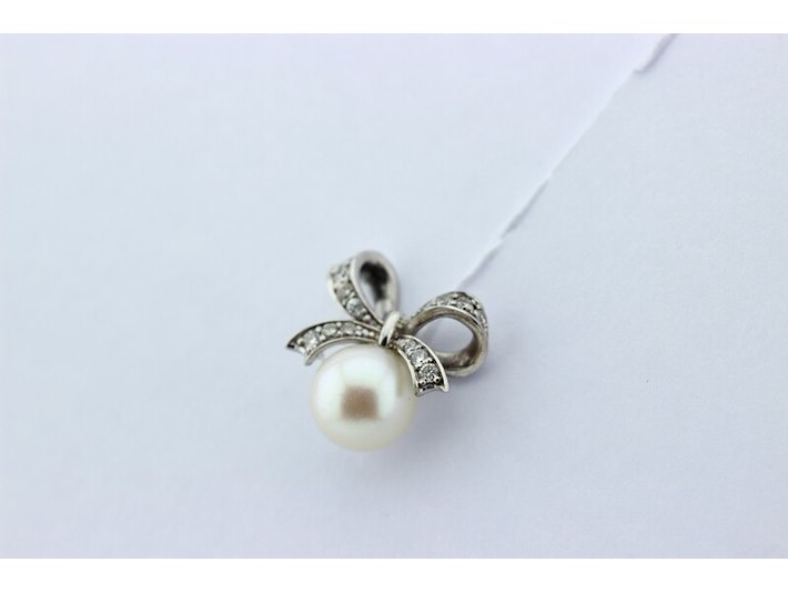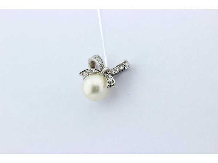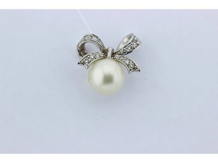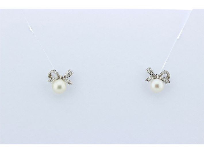 Product: Dames oorbellen Materiaal: 14 karaat witgoud Afmeting: 2,4 gram Conditie: nieuw Specificaties: 14 karaats witgouden oorstekers in de vorm van een strik gezet met 28 als briljant geslepen diamanten met een gewicht van 0,15 crt. Kleur G en kwaliteit VS. Hieronder een cultive zoutwater parel met een diameter van 6,5 mm. Inclusief een oorbellen doos en een taxatierapport met een verzekeringswaarde van € 975,-- afgegeven door een gediplomeerd taxateur. Edelsteen: Natuurlijke diamant Aantal: 28 stuks Slijpvorm: briljant geslepen Gewicht: 0,15 karaat Kleur: G Zuiverheid: VS