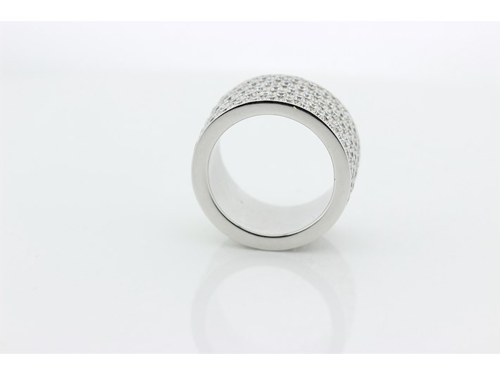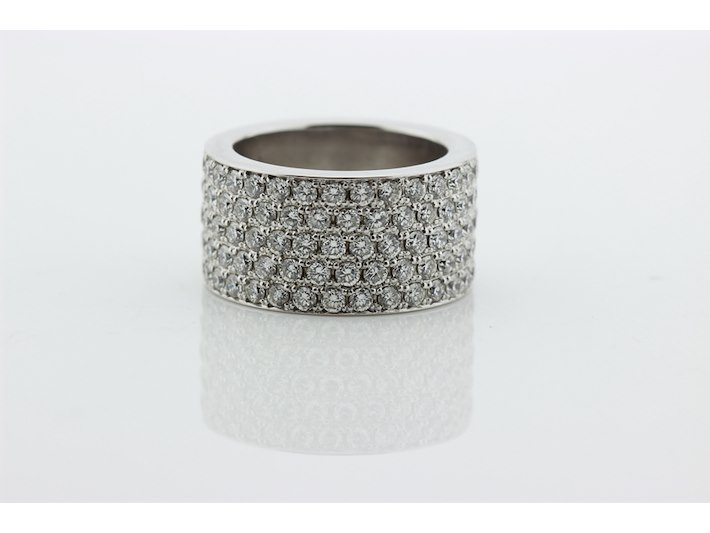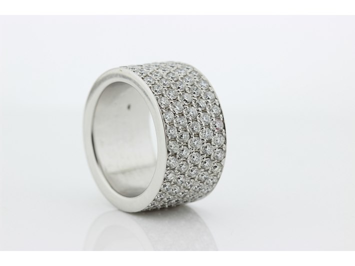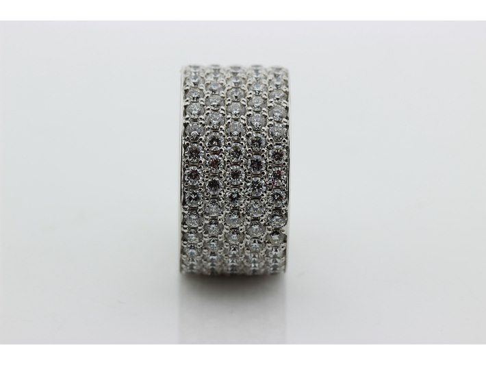 Product: Dames ring Materiaal: 14 karaat witgoud Afmeting: 12,7 gram Conditie: gebruikt Specificaties: 14 karaats brede (13mm) pavering gezet met 150 briljant geslepen diamant met een gewicht van 7,50 crt, Kleur G en kwaliteit VS. Inclusief een ringen doos en een taxatierapport met een verzekeringswaarde van € 14250,-- afgegeven door een gediplomeerd taxateur. Edelsteen: Natuurlijke diamant Aantal: 150 Slijpvorm: Briljant geslepen Gewicht: 7,50 crt Kleur: G Zuiverheid: VS Ringmaat 19