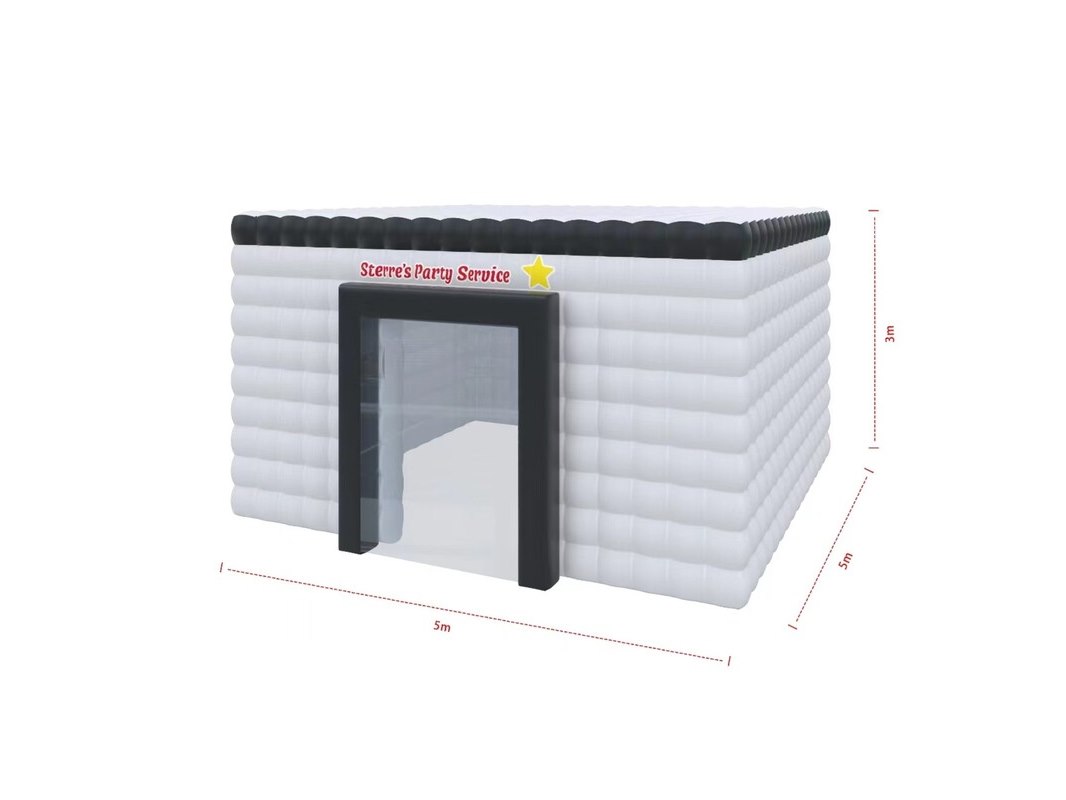 Product: Opblaasbare tent Kleur: Wit / Zwart Afmeting: 500 x 500 x 300 cm Specificaties: Afmetingen: 500 x 500 x 300 cm Inclusief blower.