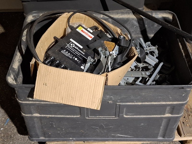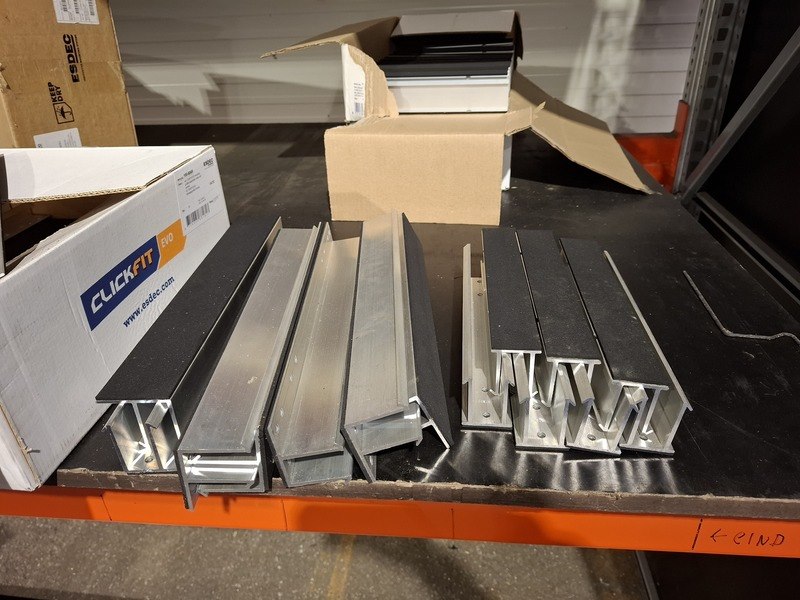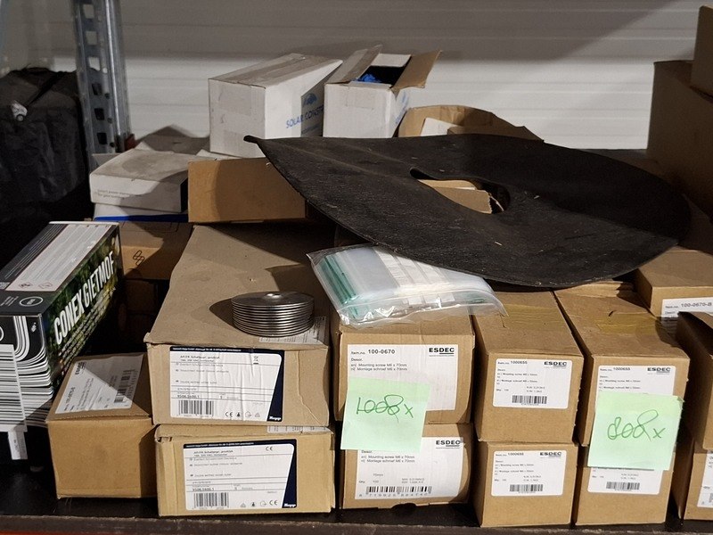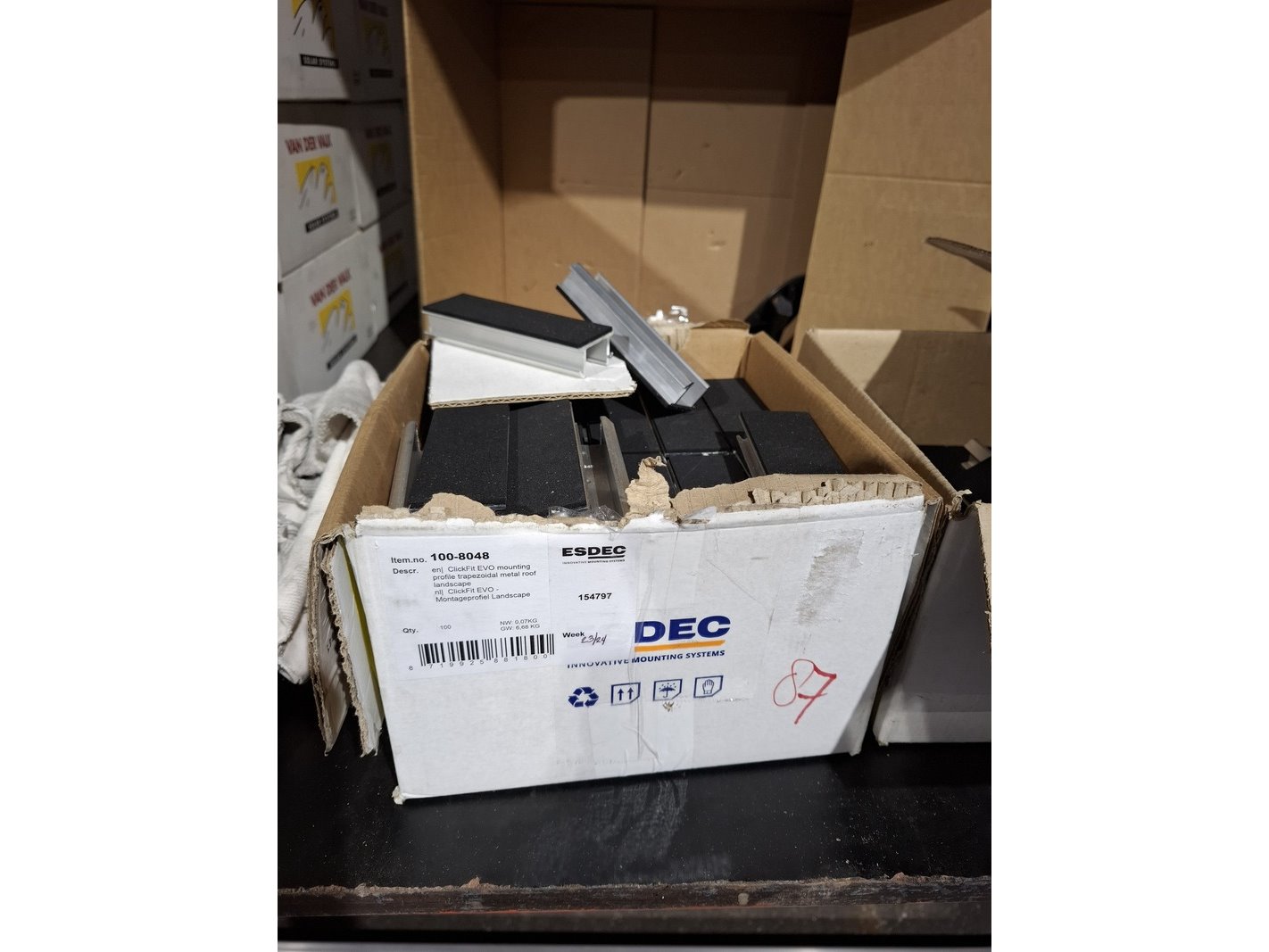 Product: Partij zonnepaneel toebehoren Specificaties: o.a. montagebeugels, schroeven, wcd's, lasdozen, rubber dak plaatjes, aluminium profielen etc.
