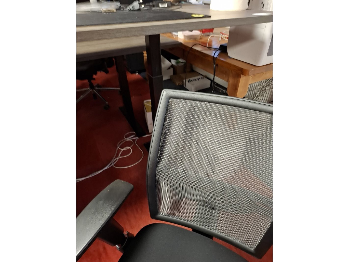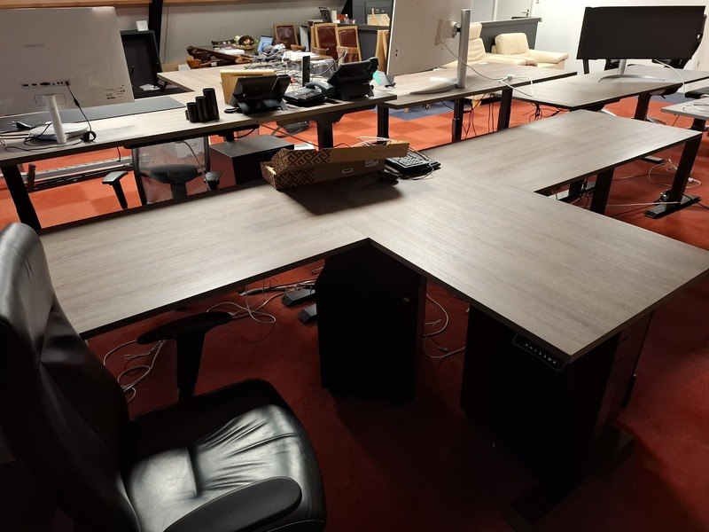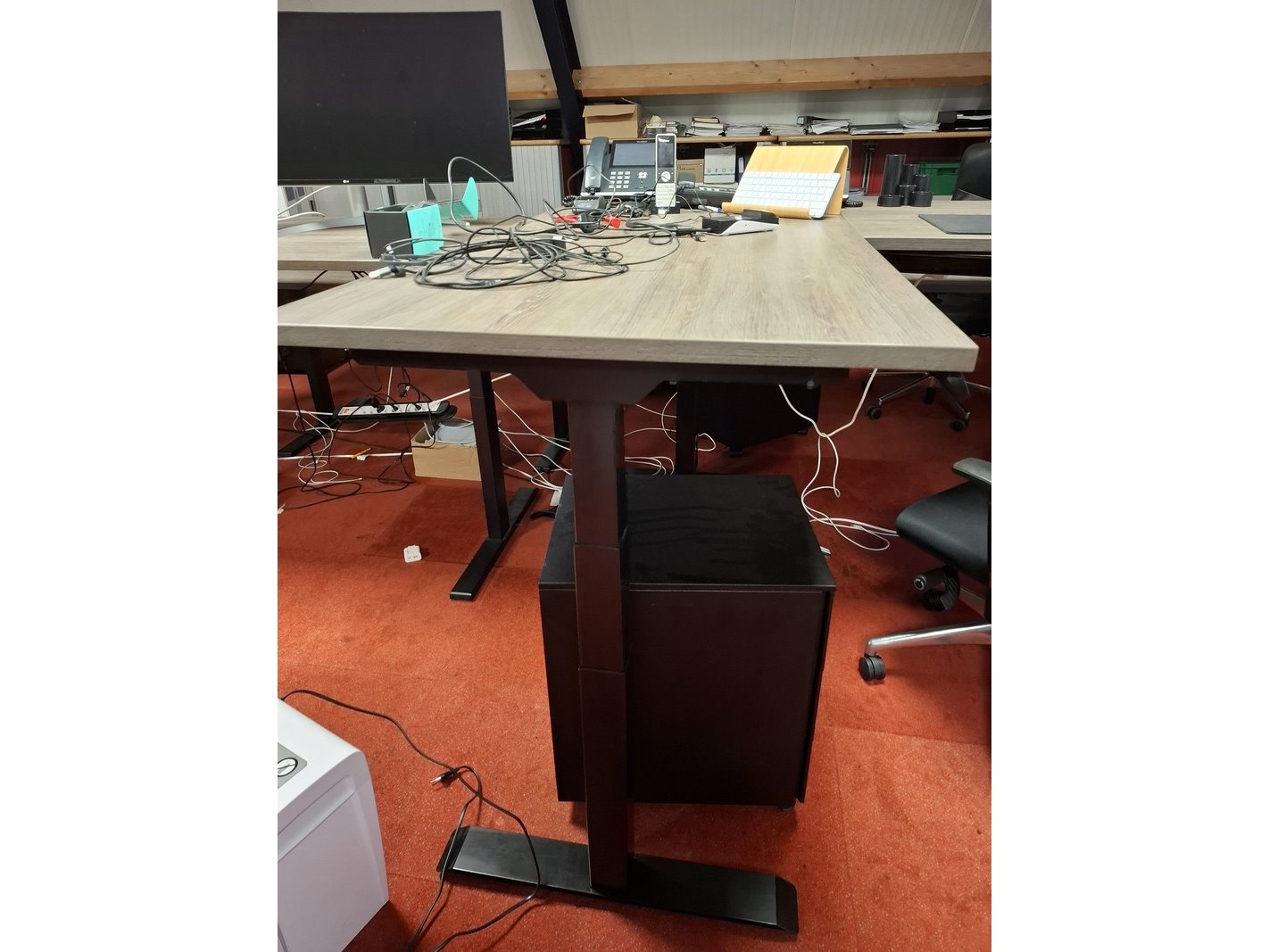 Product: Elektrische sta-zit hoekbureau Afmeting: lxb ca. 220/160x80cm Specificaties: inclusief 3x ladeblok en 2x diverse bureaustoel