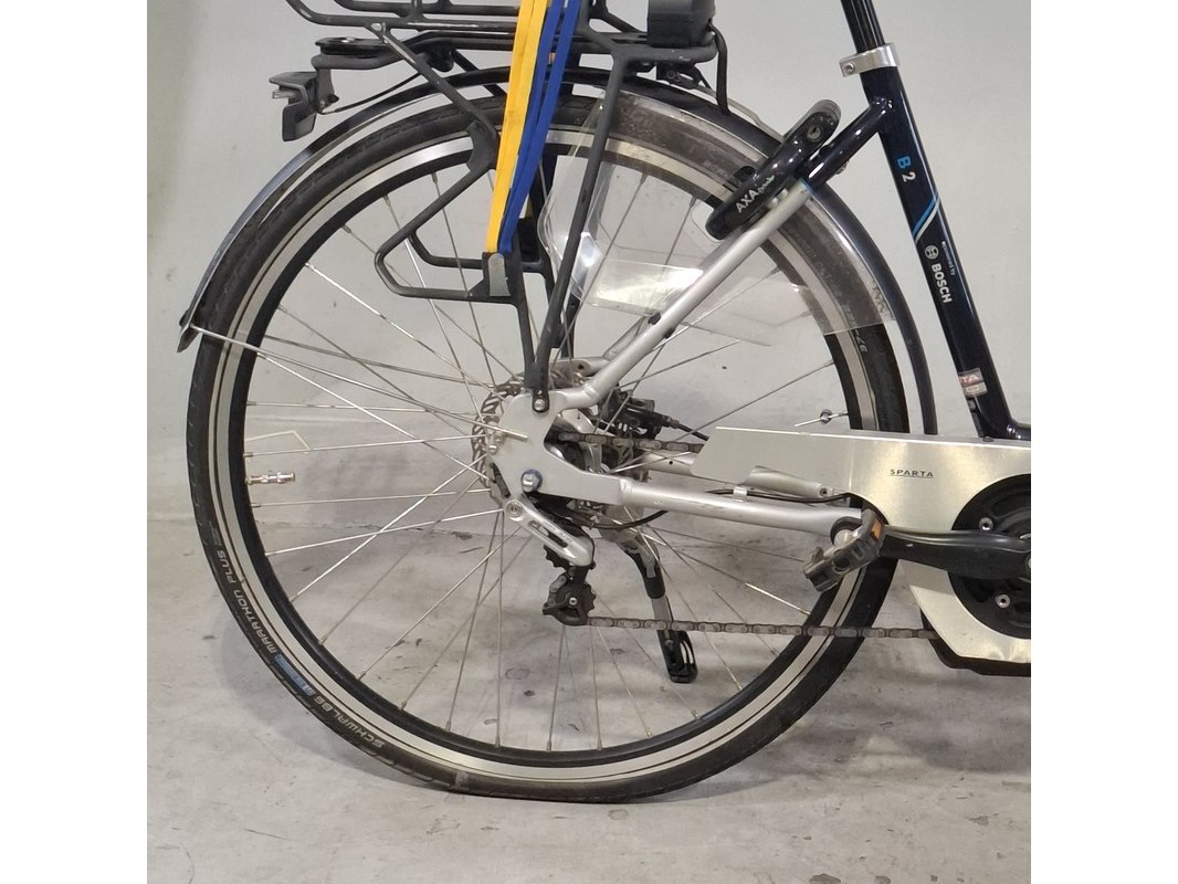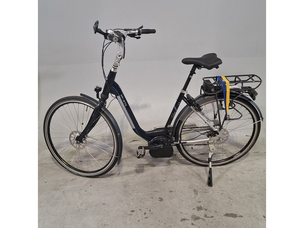 Merk: Sparta Product: Elektrische damesfiets Afmeting: Framemaat ca. 48 cm Specificaties: 8 versnellingen Geveerde voorvork en zadelpen Bosch middenmotor Exclusief fietscomputer, accu en sleutels. Fiets staat op slot. Acculader ontbreekt.