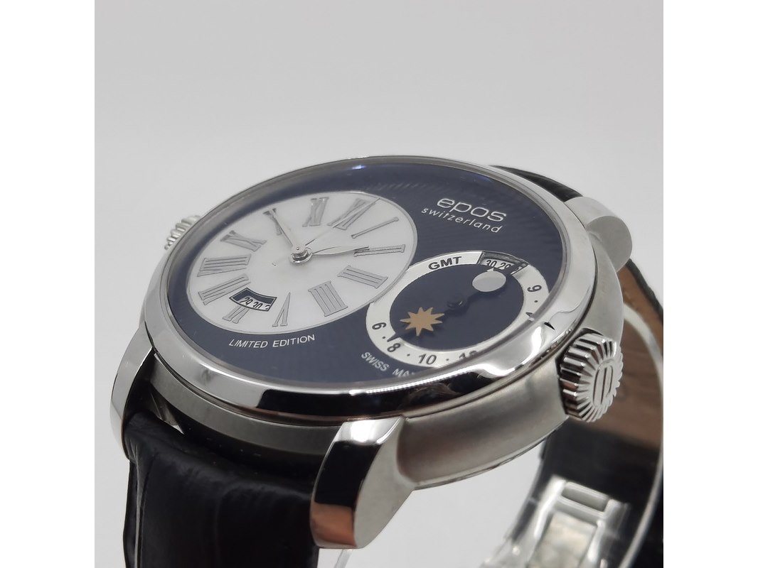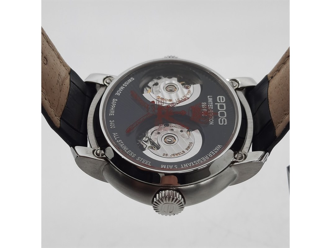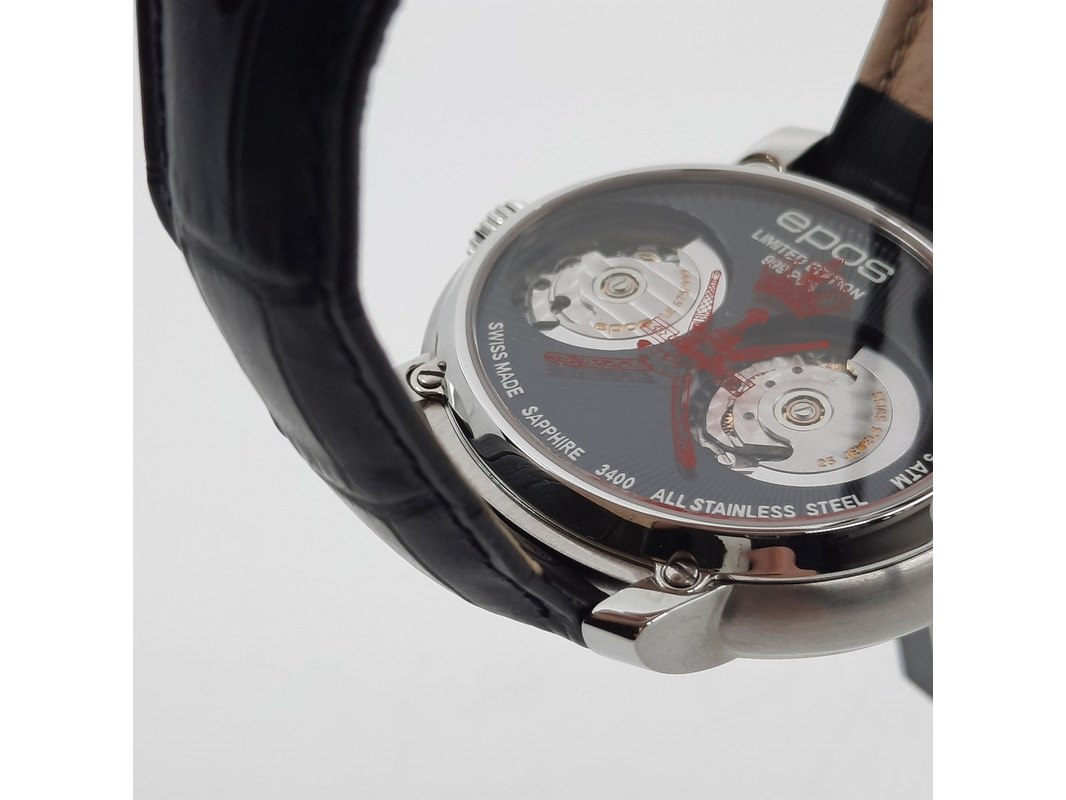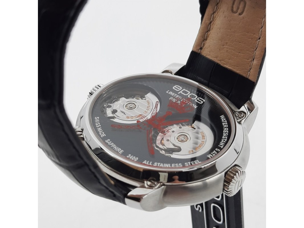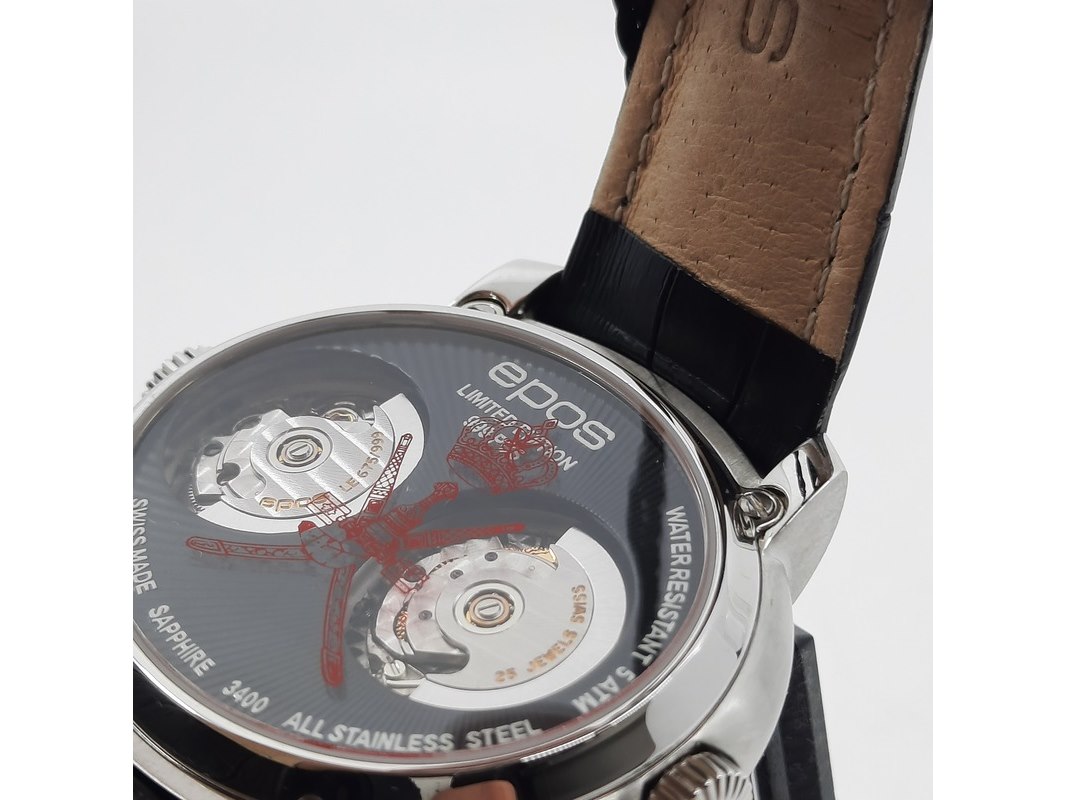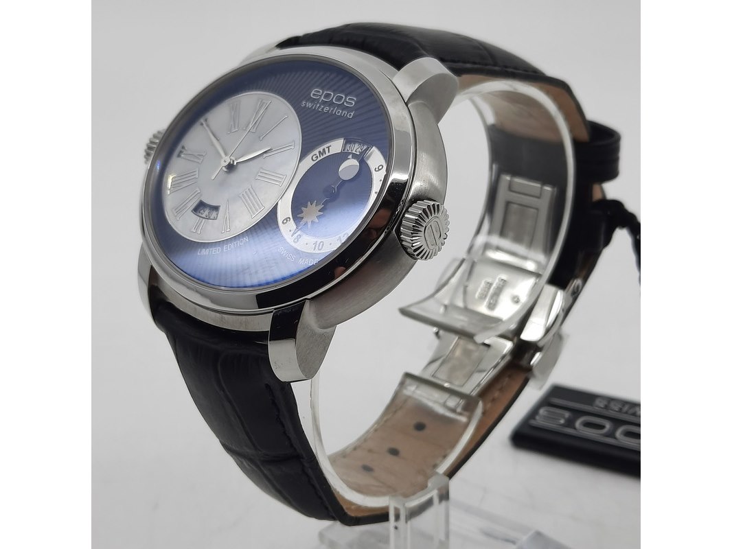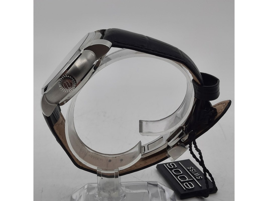 Merk: Epos Product: Heren polshorloge Conditie: gebruikt Specificaties: Een stalen heren polshorloge, Epos 3400. Aan lederen band. Inclusief doos en garantie certificaat.