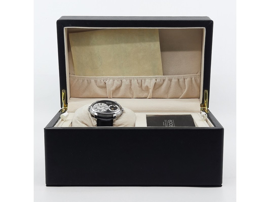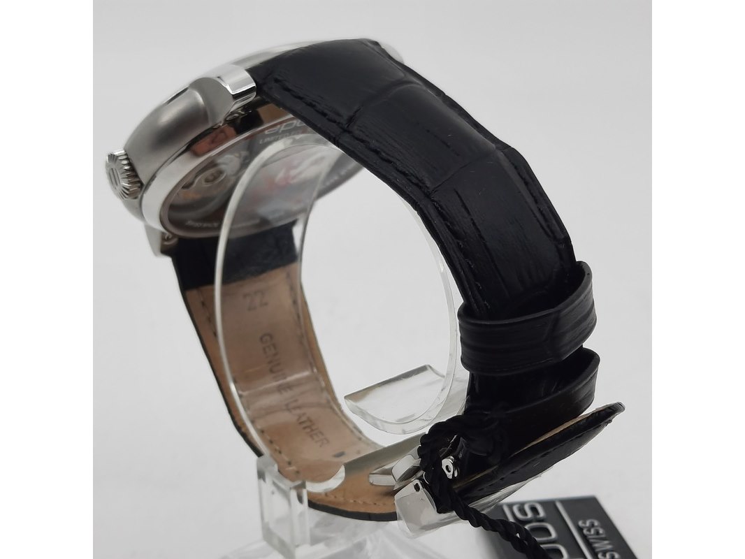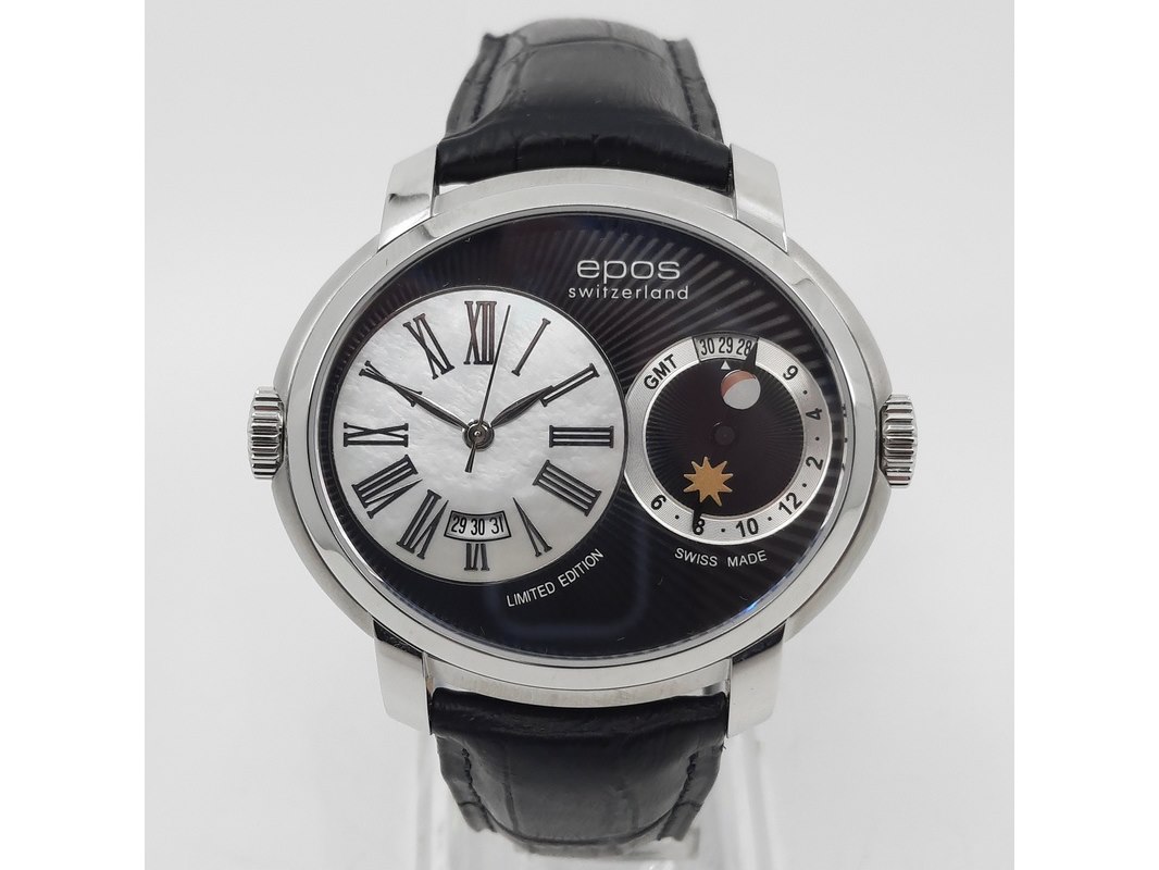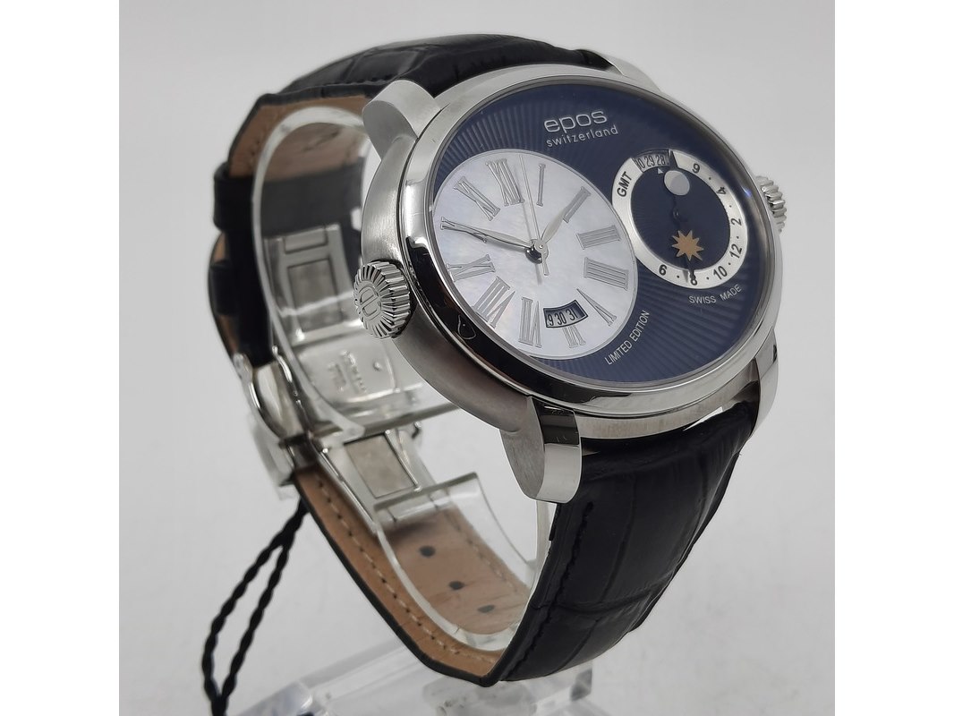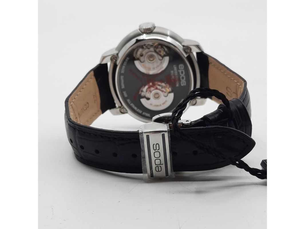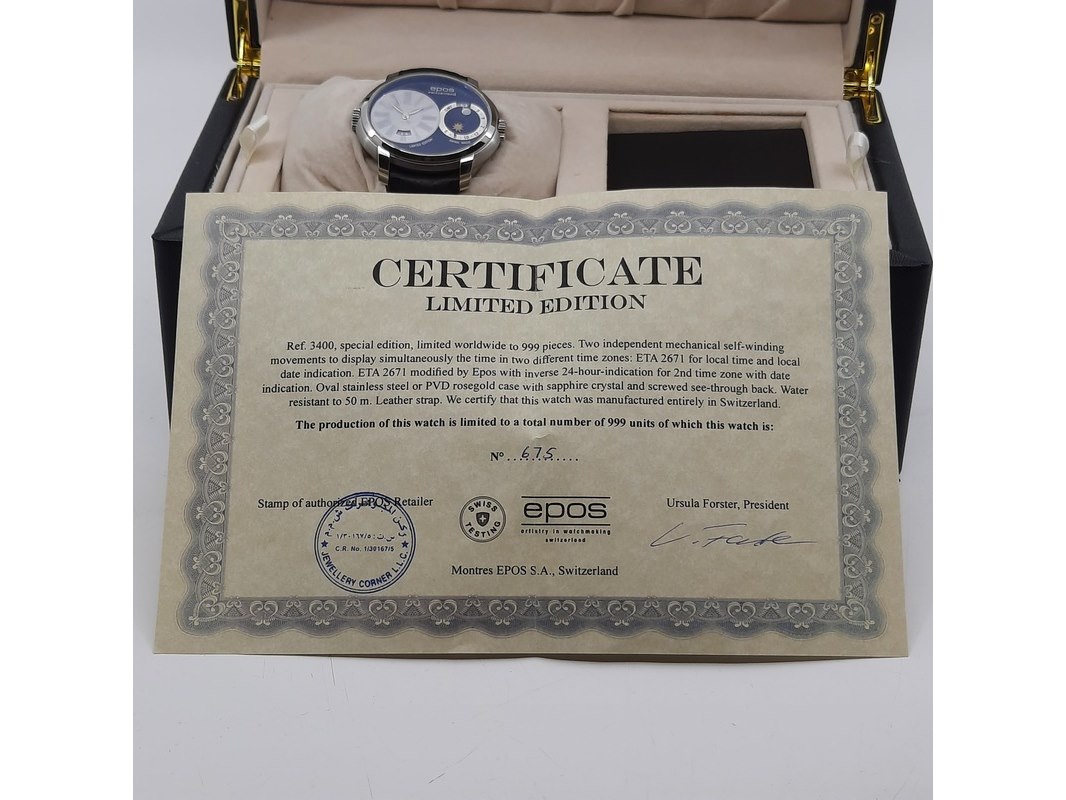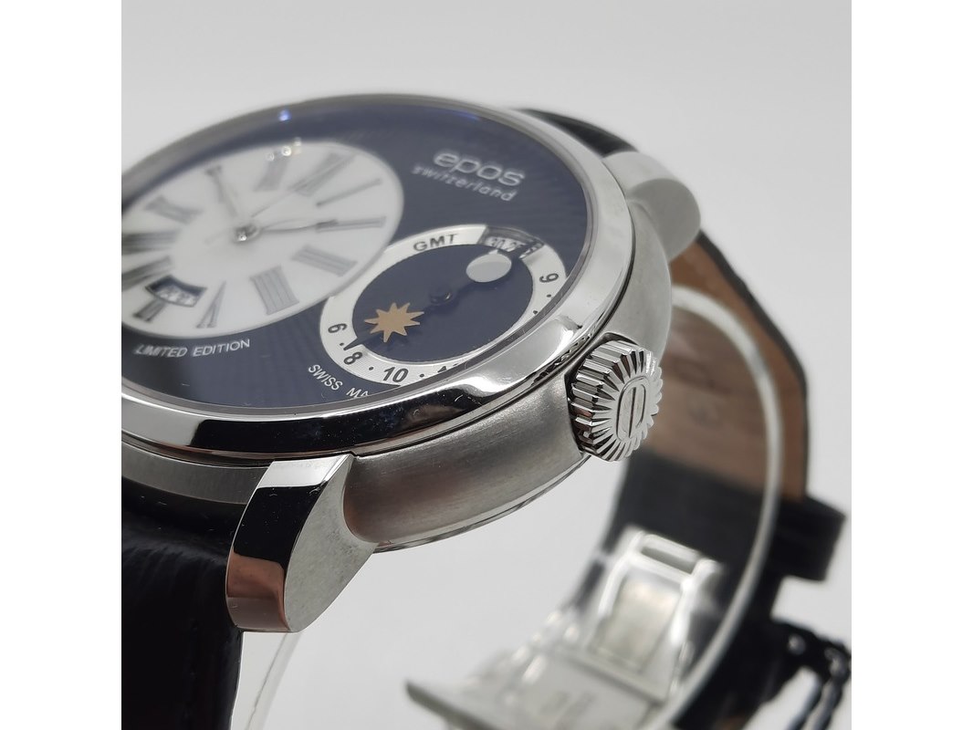 Merk: Epos Product: Heren polshorloge Conditie: gebruikt Specificaties: Een stalen heren polshorloge, Epos 3400. Aan lederen band. Inclusief doos en garantie certificaat.