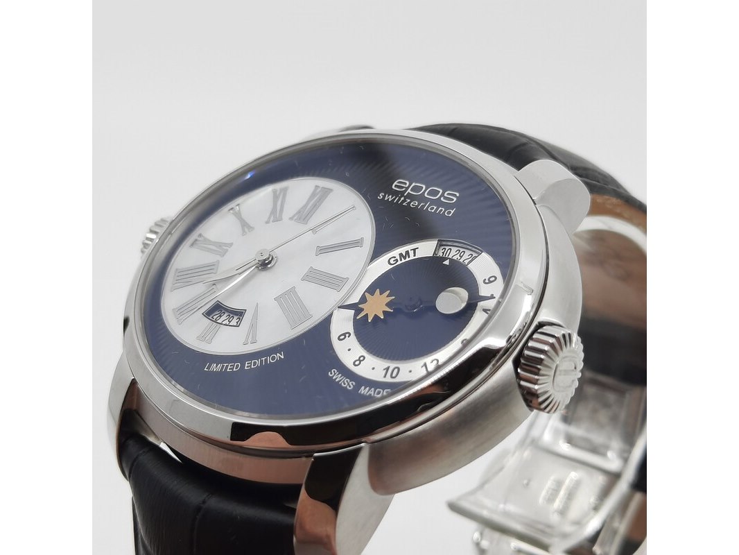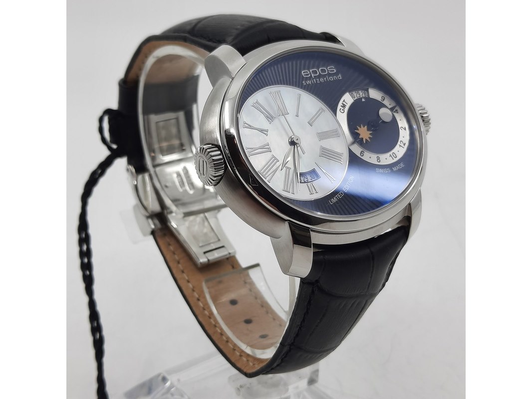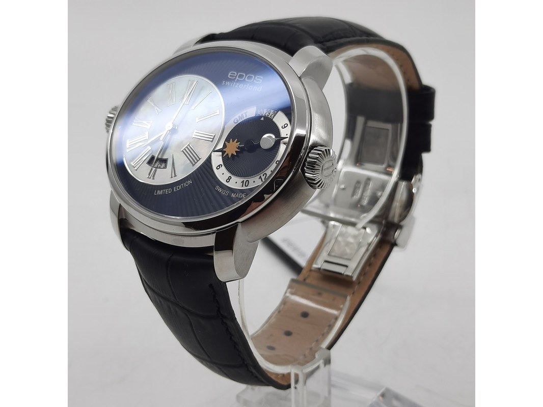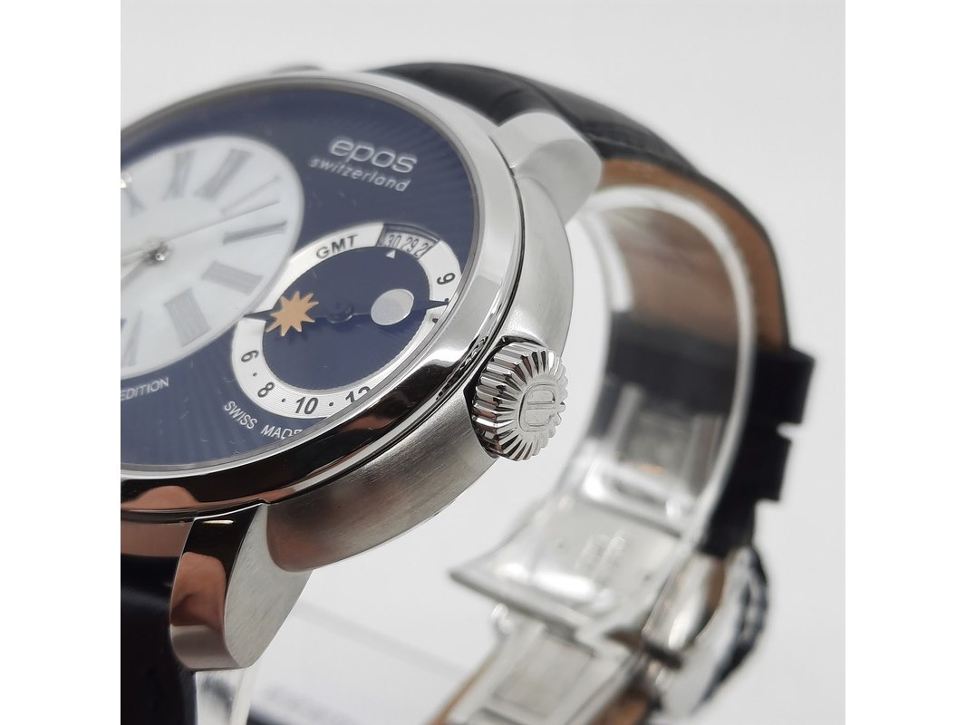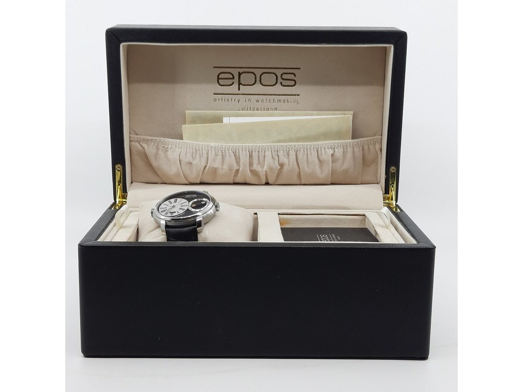 Merk: Epos Product: Heren polshorloge Conditie: gebruikt Specificaties: Een stalen heren polshorloge, Epos 3400. Aan lederen band. Met doos en documentatie.
