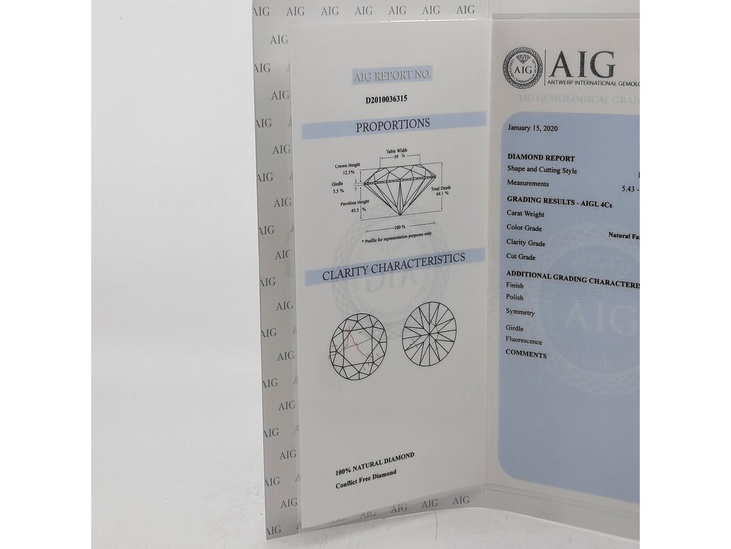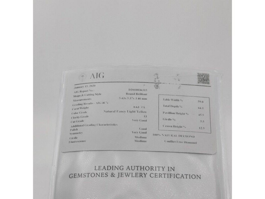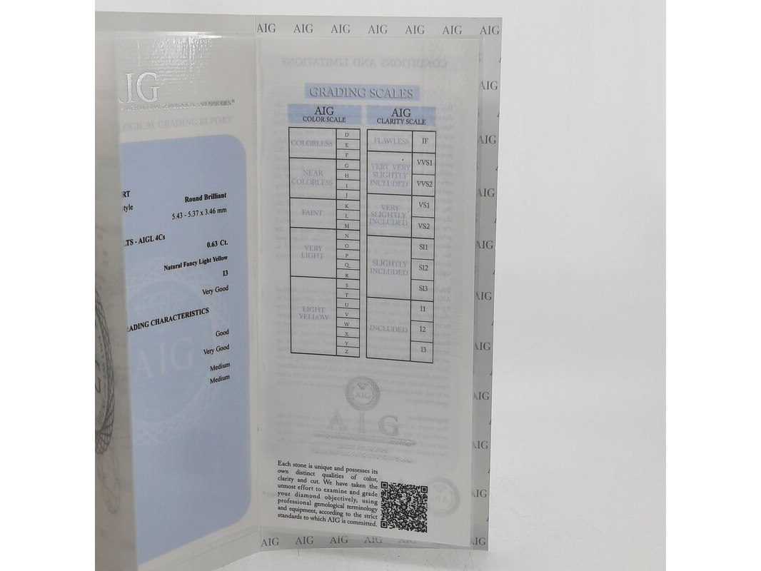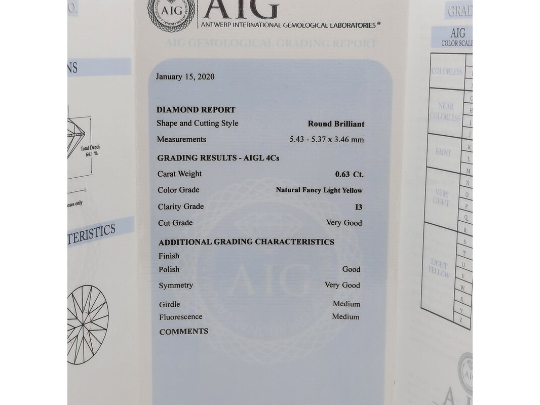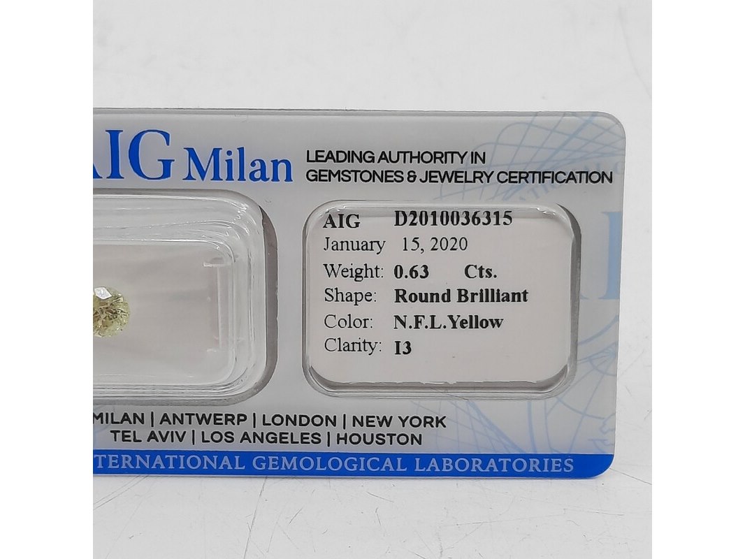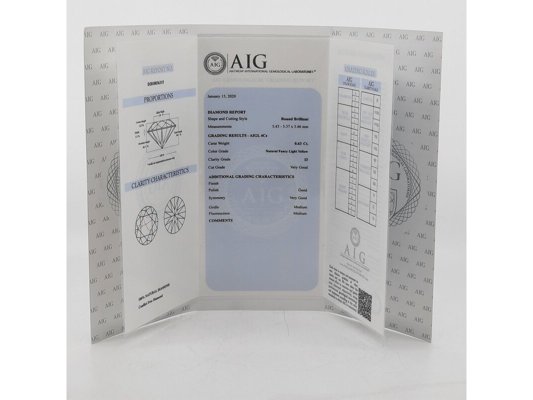 Product: Briljant geslepen diamant, 0.63 karaats (P3) Conditie: gebruikt Specificaties: Een briljant geslepen diamant 0,63 kt, kleur lichtgeel, zuiverheid P3 met AIG certificaat.
