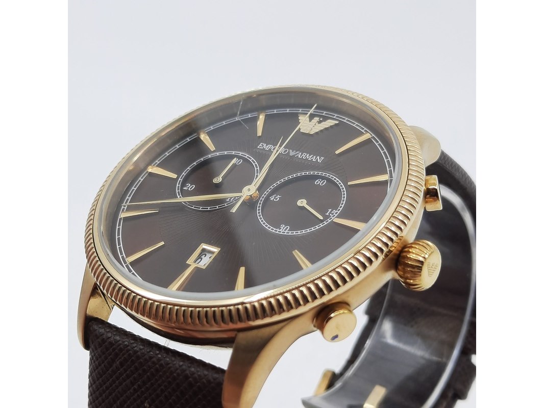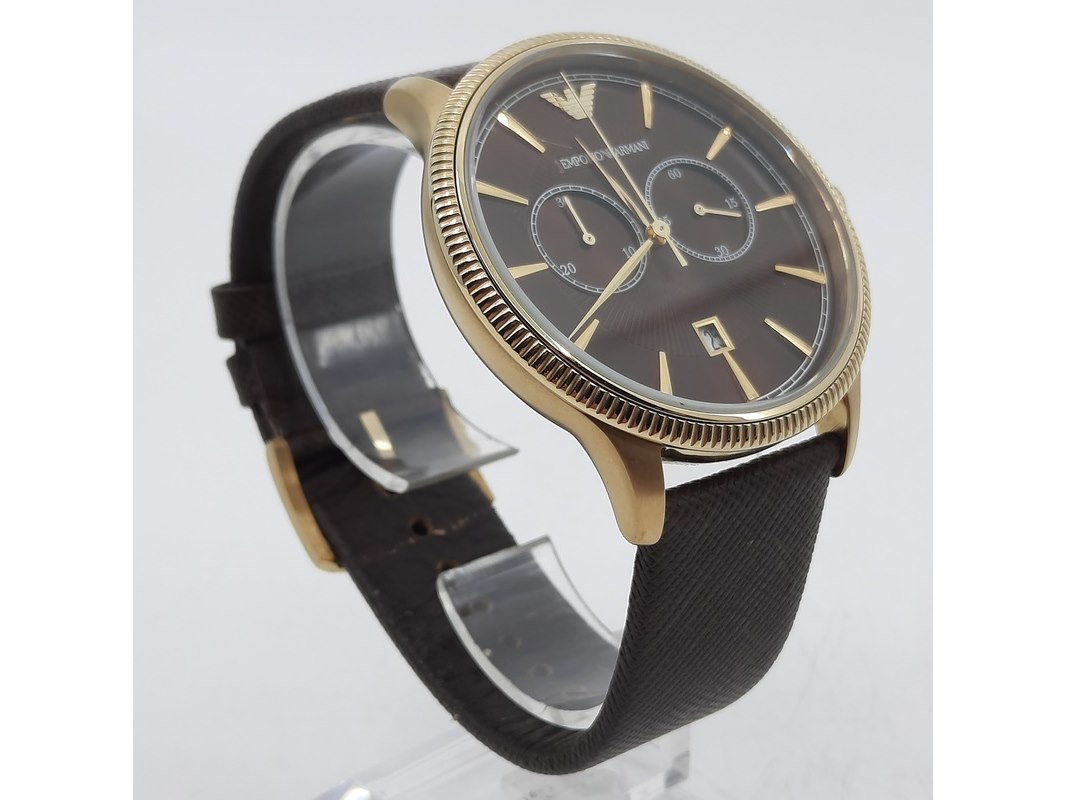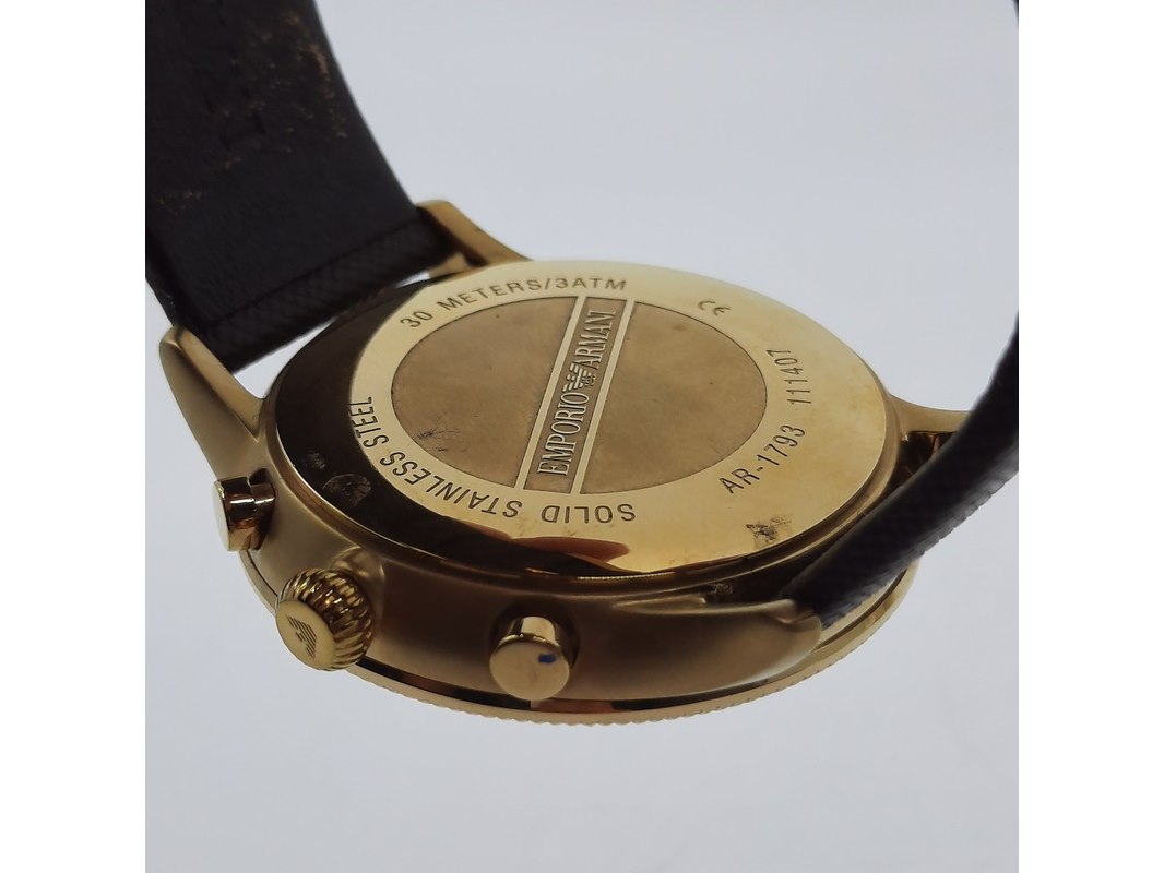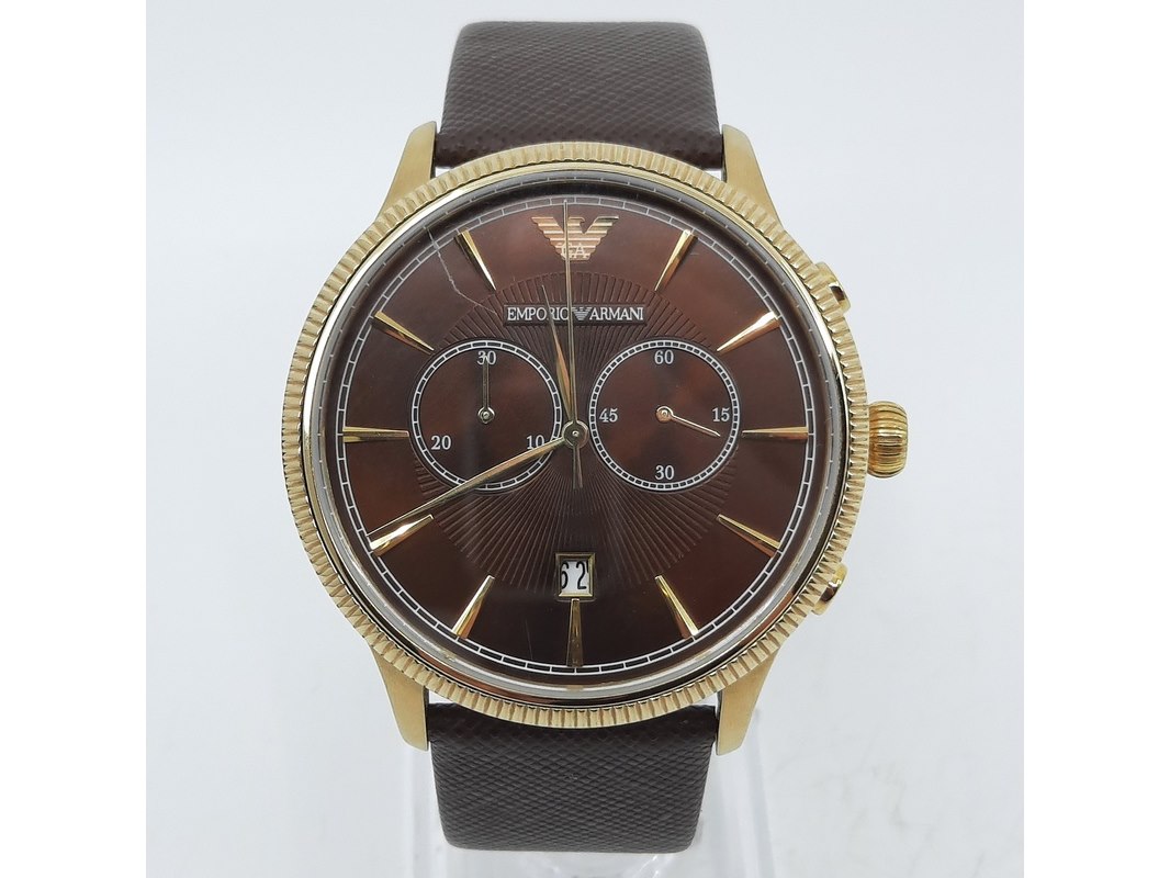 Merk: Armani Product: Heren polshorloge Conditie: gebruikt Specificaties: Een onedel heren polshorloge Armani, model AR 1793, quartz chronograaf met doos. Scharnier doosje afgebroken.