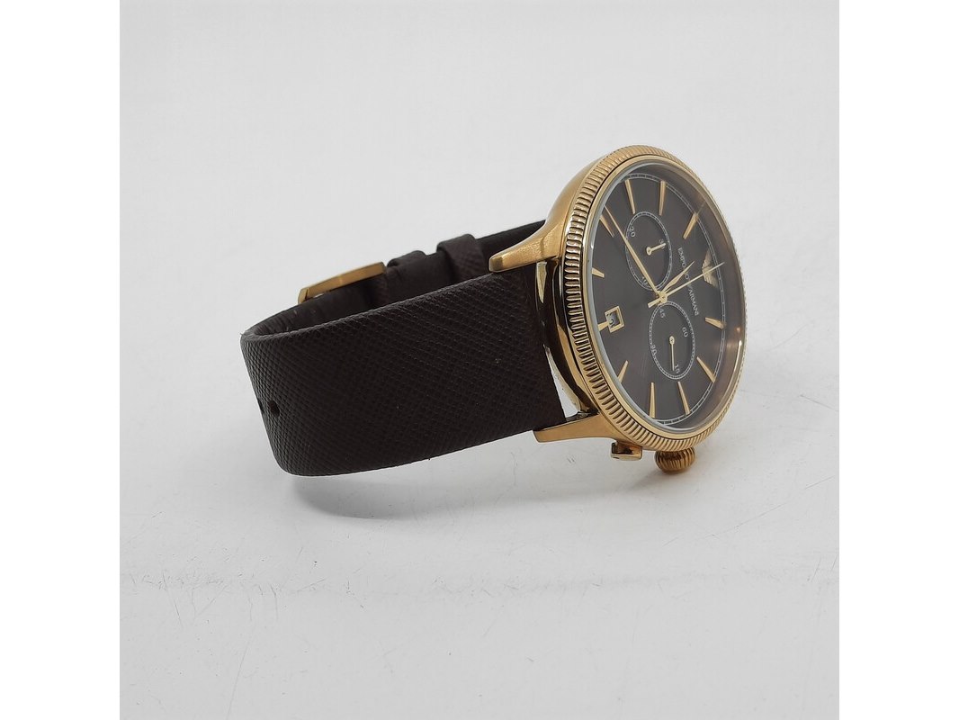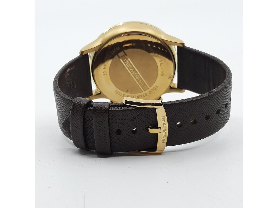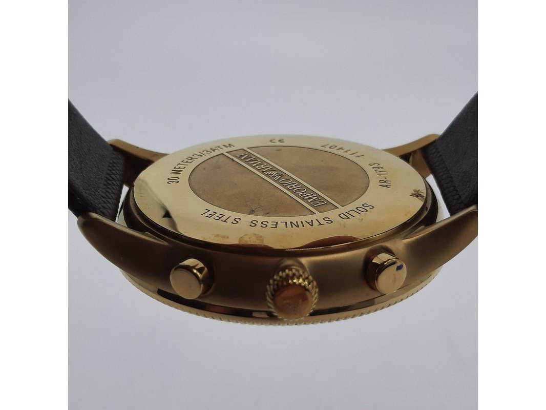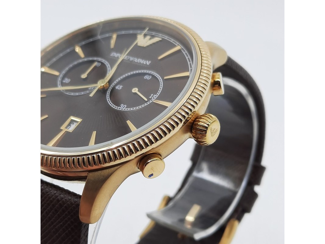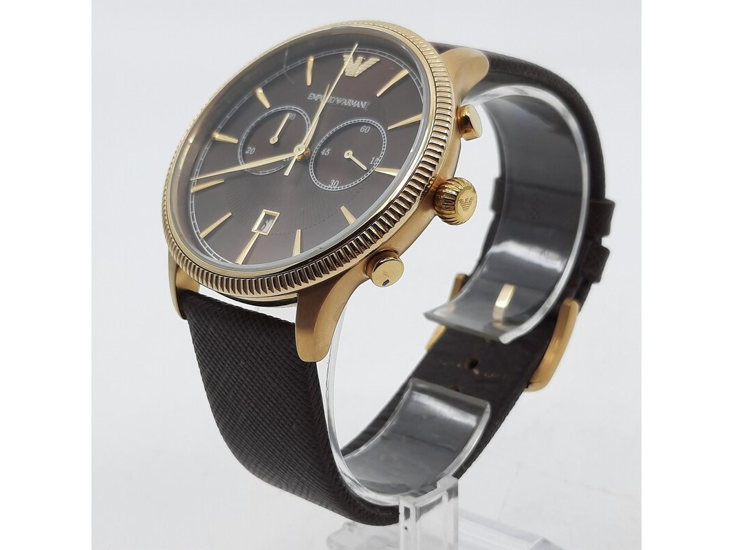 Merk: Armani Product: Heren polshorloge Conditie: gebruikt Specificaties: Een onedel heren polshorloge Armani, model AR 1793, quartz chronograaf met doos. Scharnier doosje afgebroken.