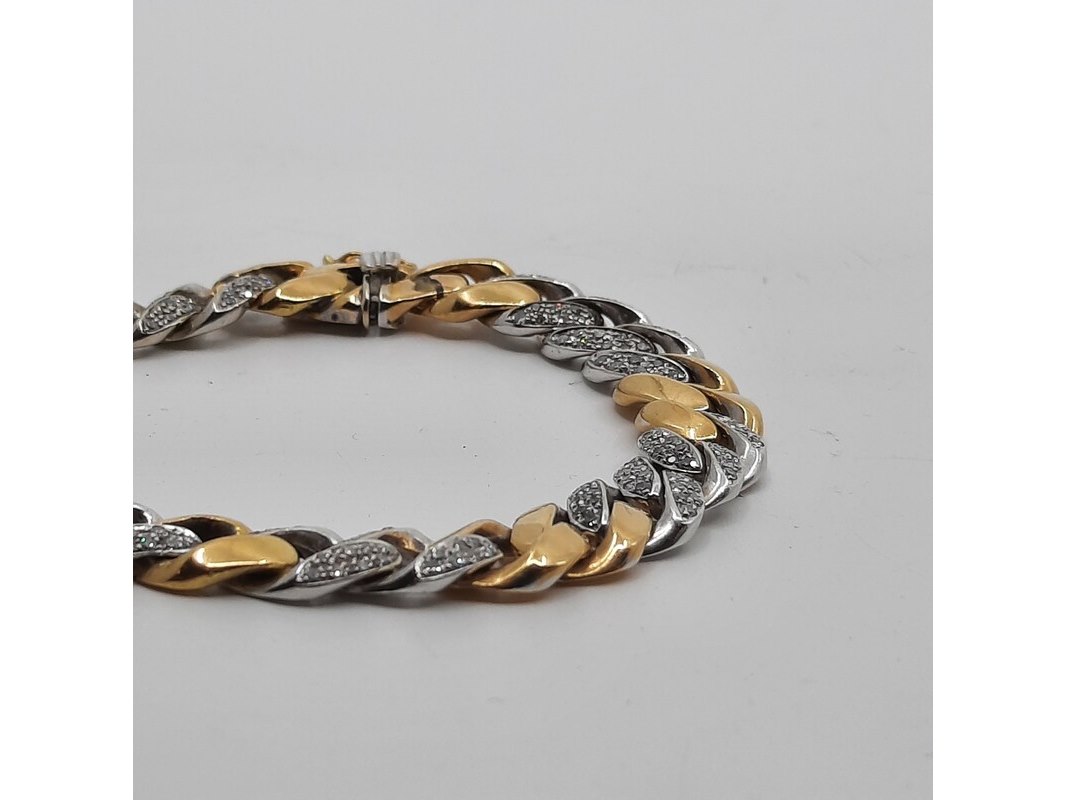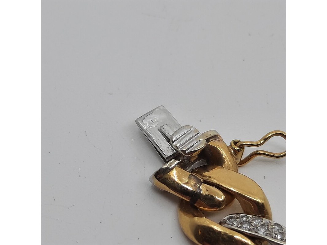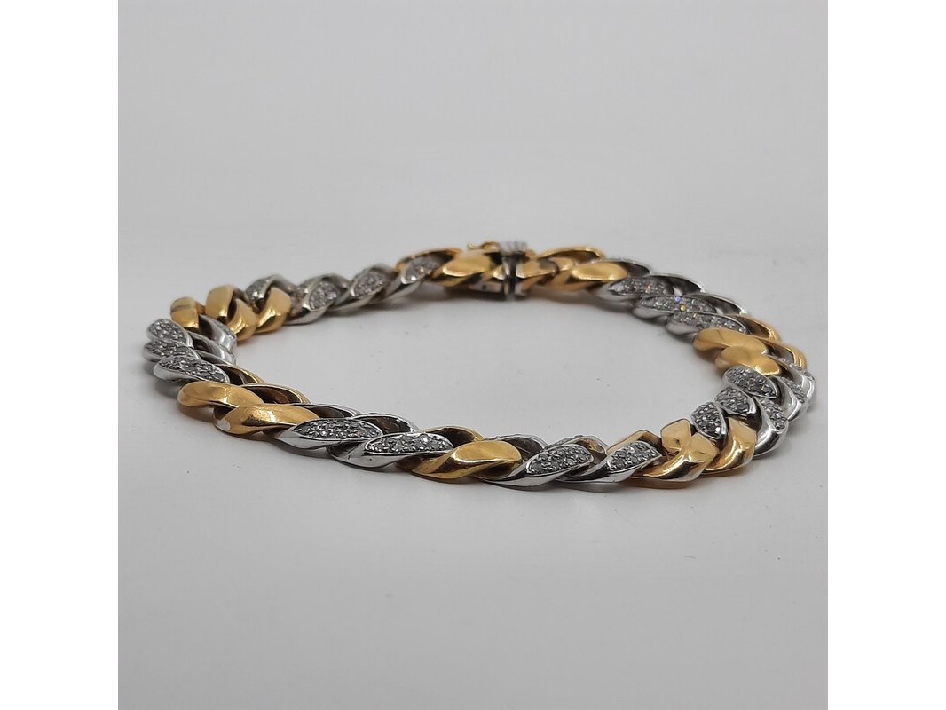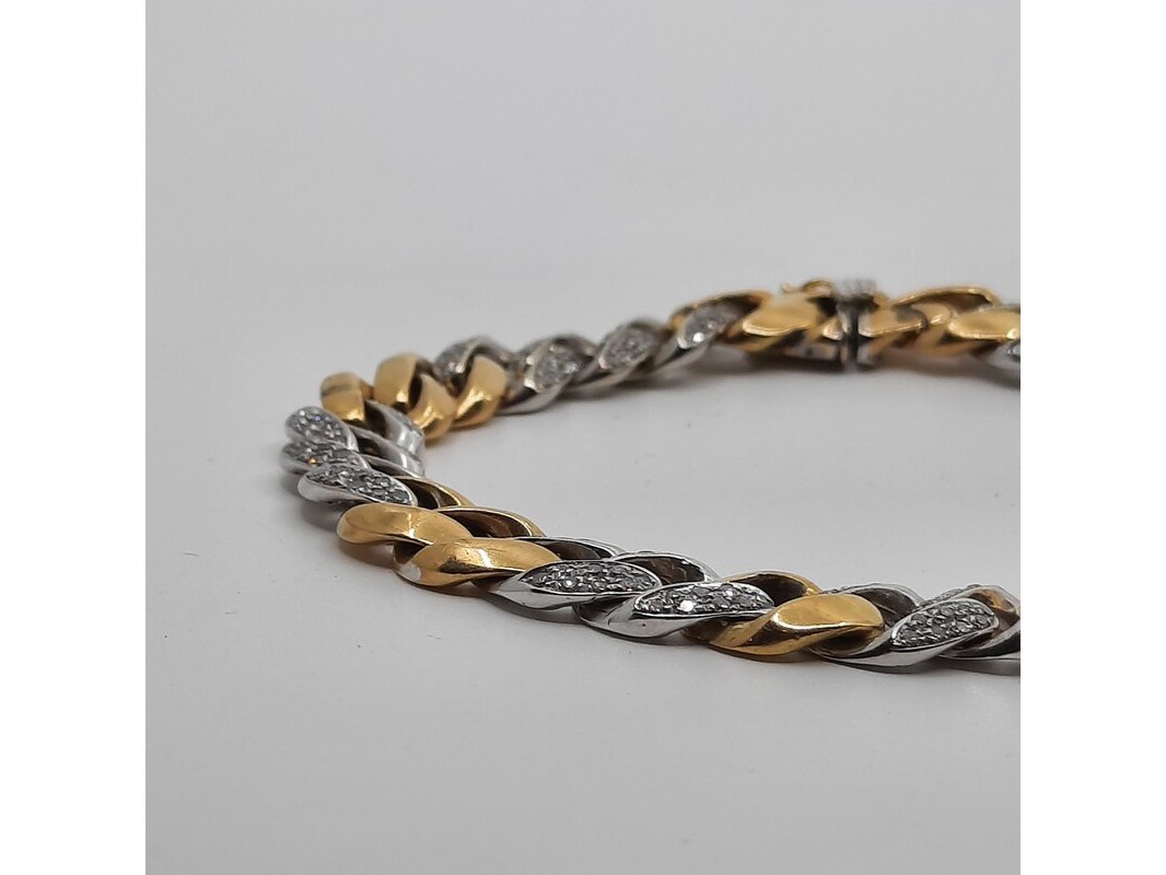 Product: Armband Afmeting: Lengte ca. 20 cm. Conditie: gebruikt Specificaties: Een geel- met witgouden gourmetschakel armband. Deels bezet met achtkant geslepen diamanten à ca 0,015 ct. In etui gemerkt FRED. Gewicht ca. 33,77 gram.