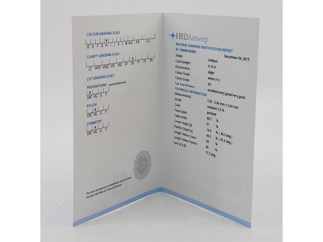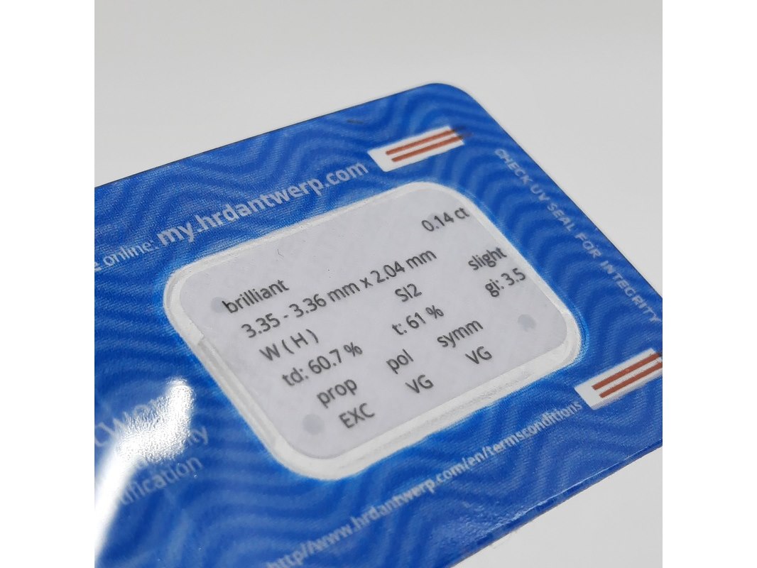 Product: Briljant geslepen diamant, 0,14 karaats (SI2) Conditie: gebruikt Specificaties: Een briljant geslepen diamant van 0,14 kt., kleur H, zuiverheid SI2 met HRD certificaat.