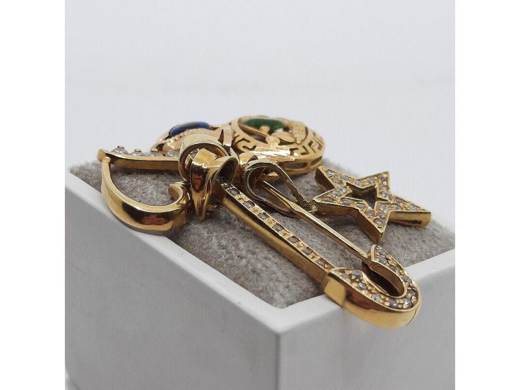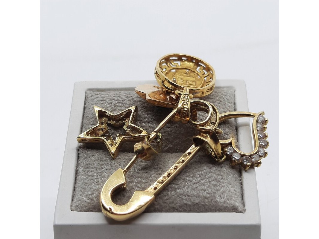 Product: Speld met vier hangers, 18 karaats Conditie: gebruikt Specificaties: Een 18 karaats geelgouden speld met vier hangers met zirkonia. Gewicht ca. 8,69 gram (samen).