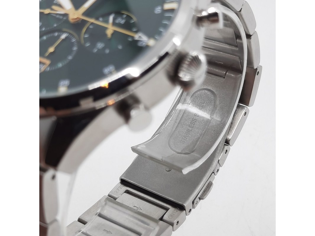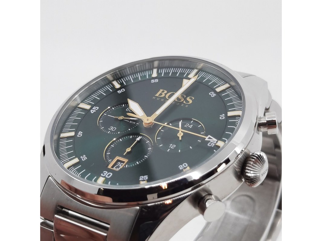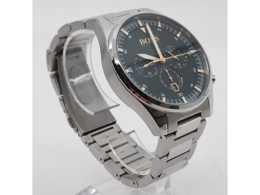 Merk: Hugo Boss Product: Heren polshorloge Conditie: gebruikt Specificaties: Een onedel heren polshorloge, Hugo Boss Chrono. Met groene wijzerplaat en stalen band. In doos.