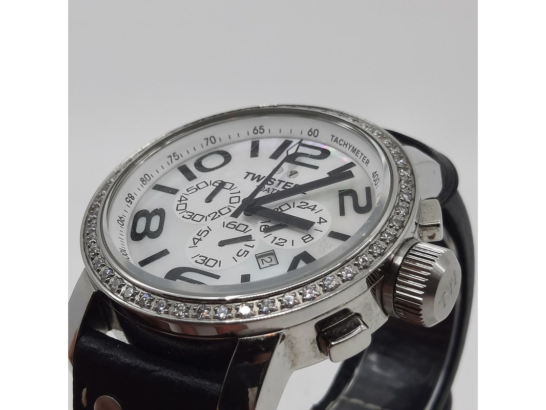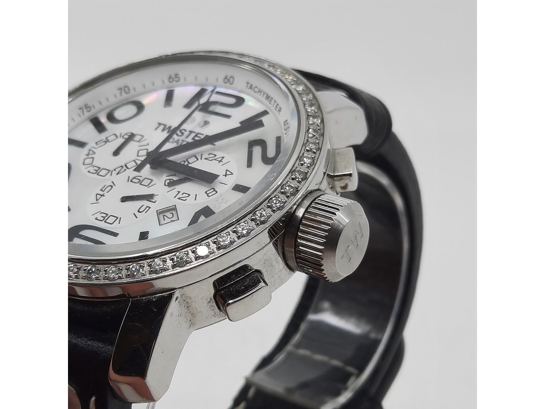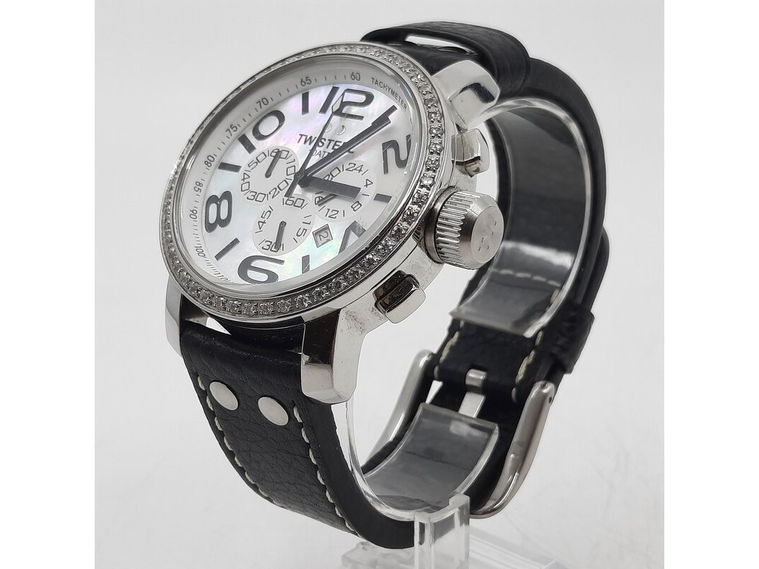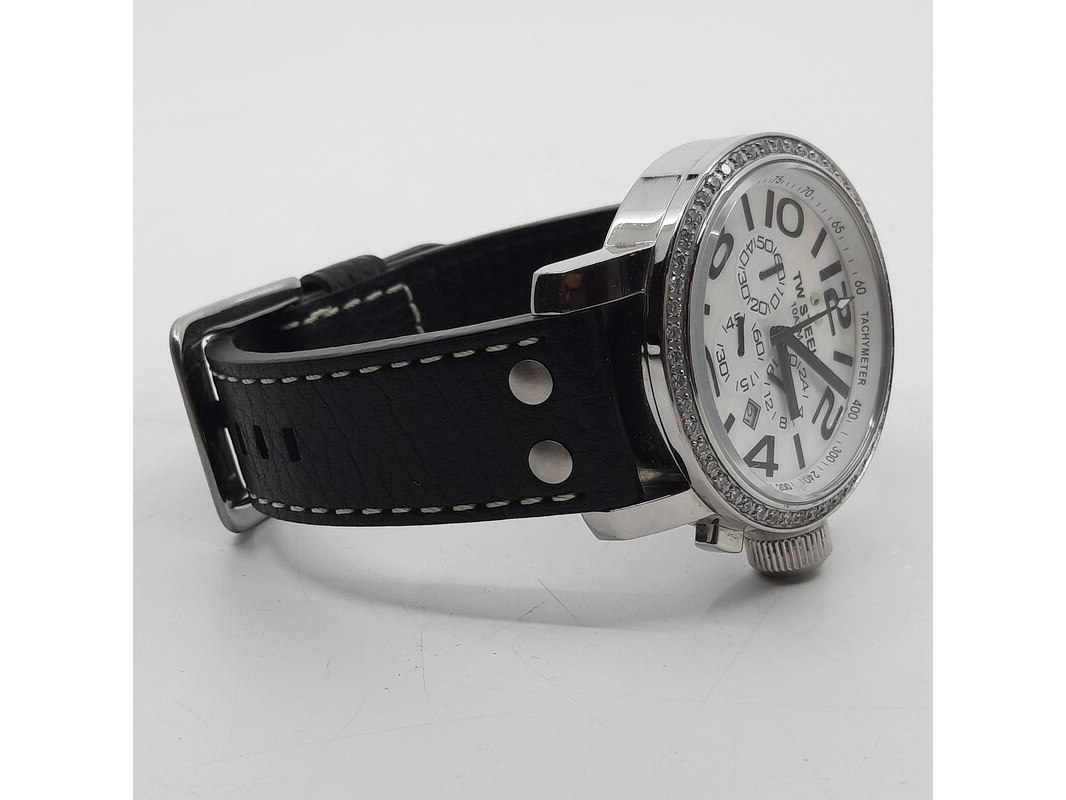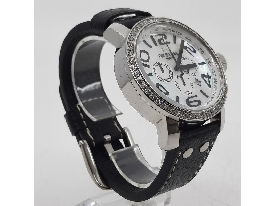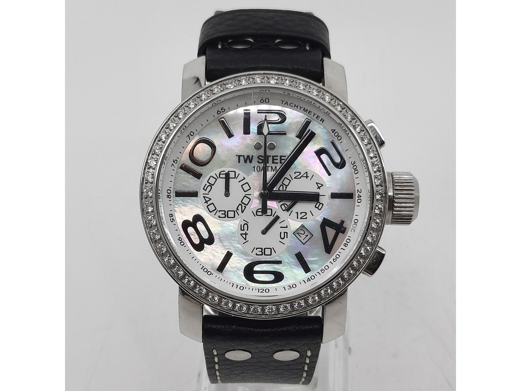 Merk: TW Steel Product: Heren polshorloge Conditie: gebruikt Specificaties: Een onedel polshorloge met parelmoer wijzerplaat. Merk TW Steel, type Grandeur TW54. Lunet bezet met cubic zirkonia. Aan lederen band.