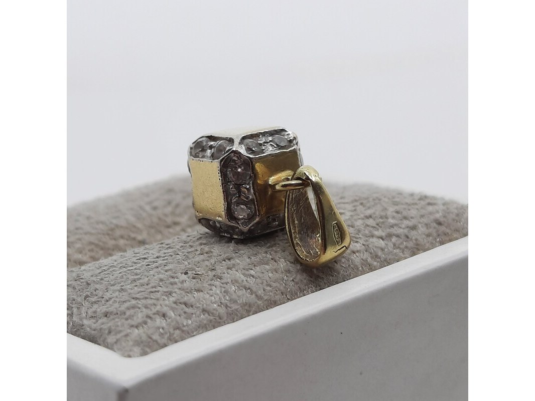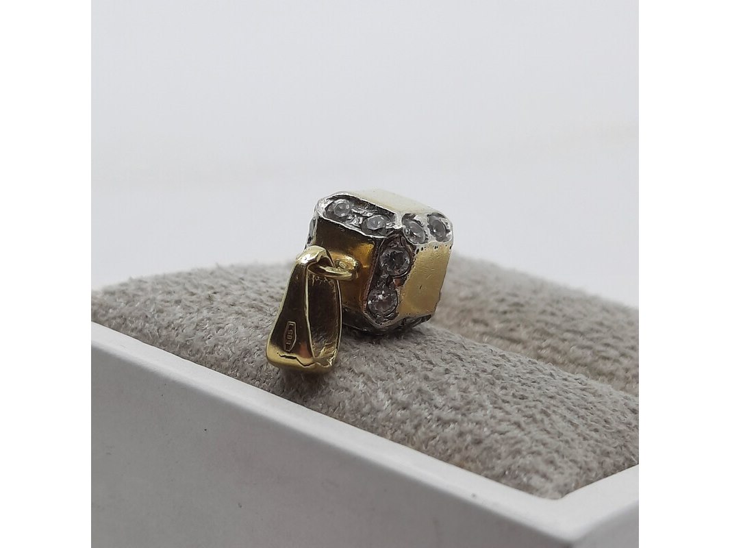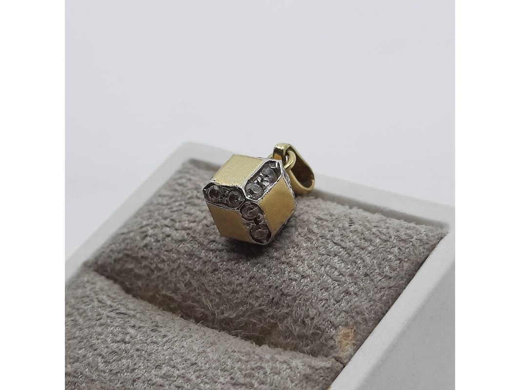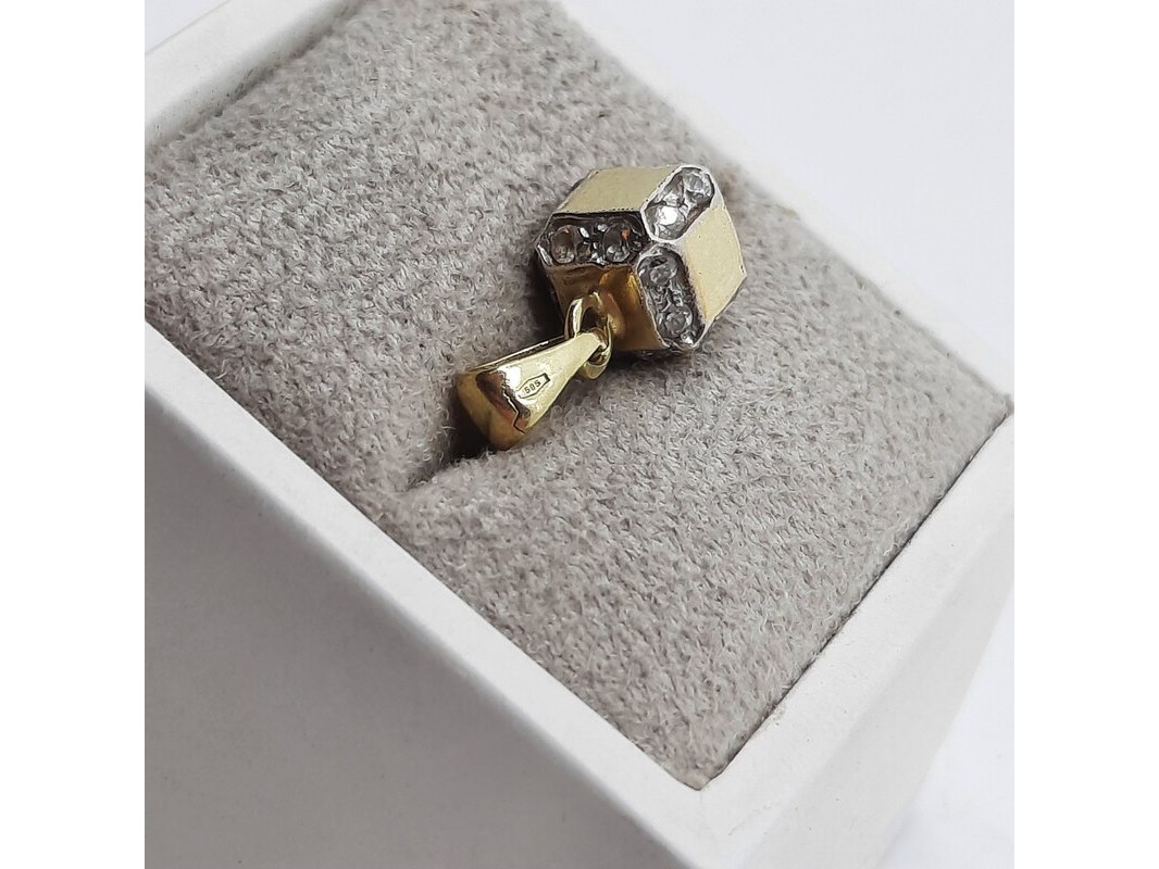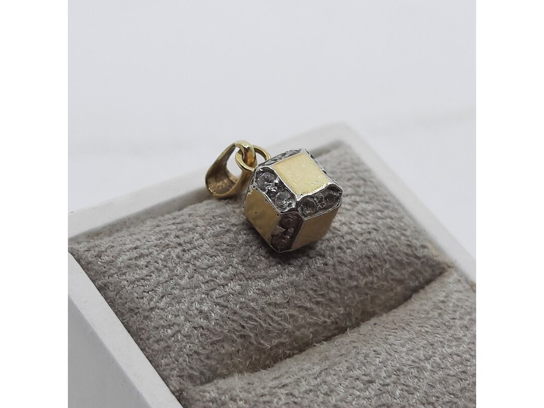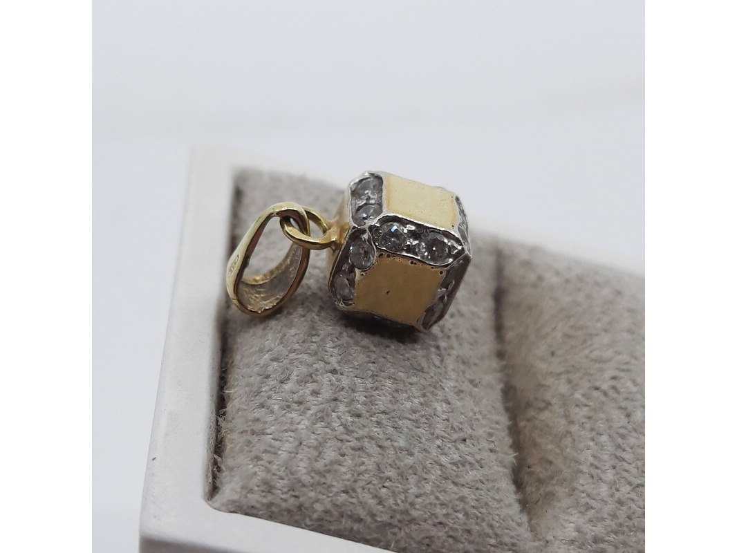 Product: Hanger, 14 karaats Conditie: gebruikt Specificaties: Een geelgouden hanger, kubus. Bezet met cubic zirkonia. Gewicht ca. 2,44 gram.