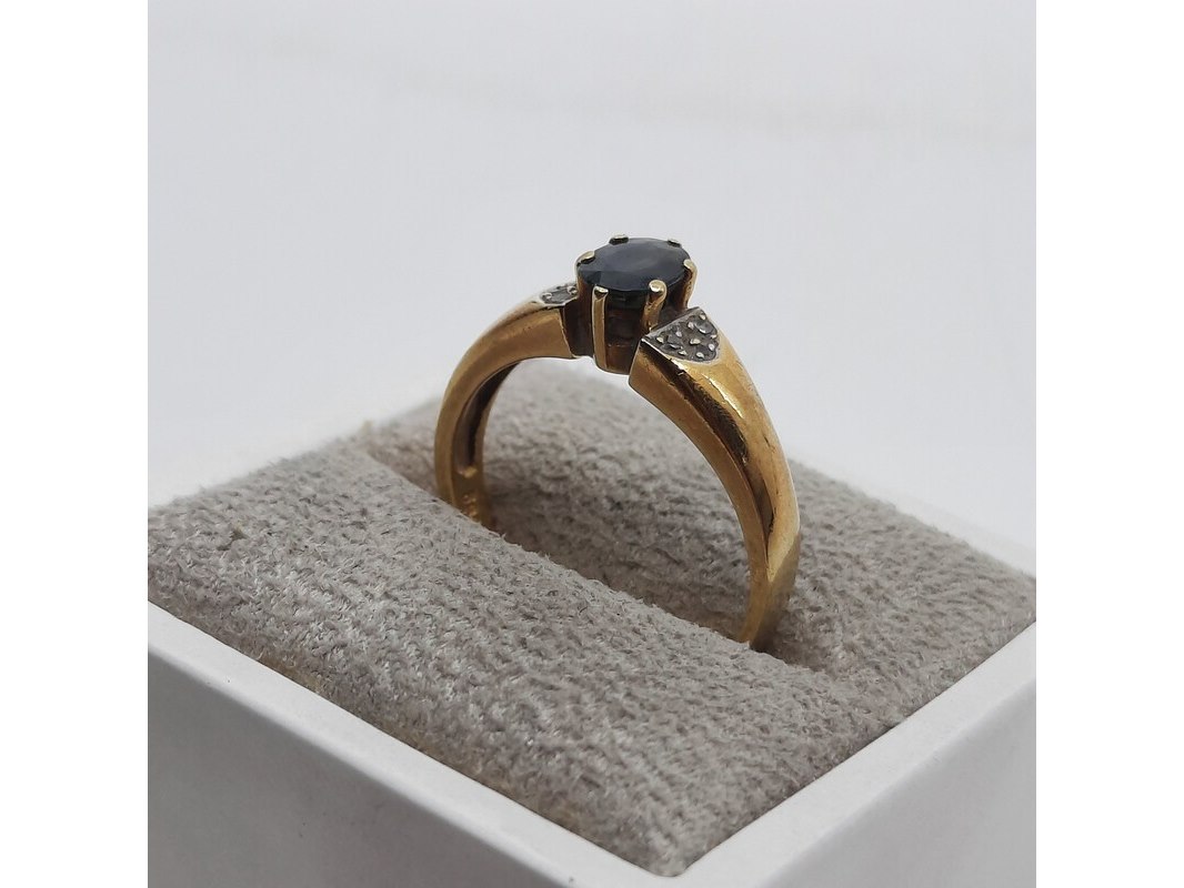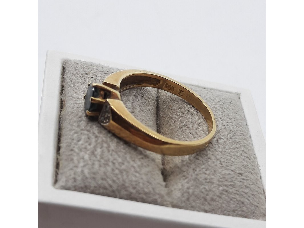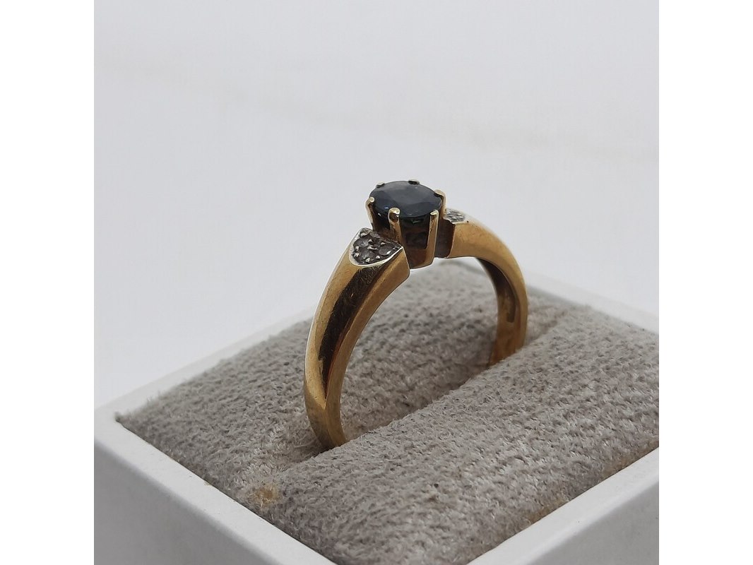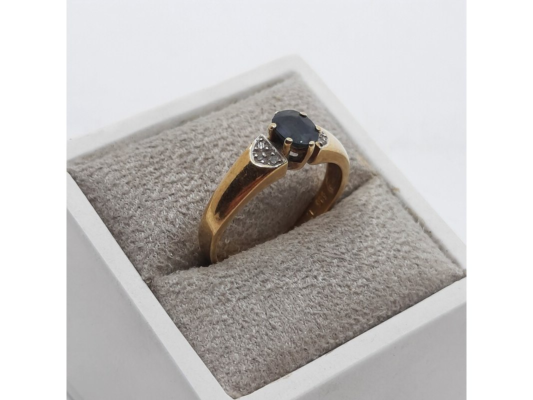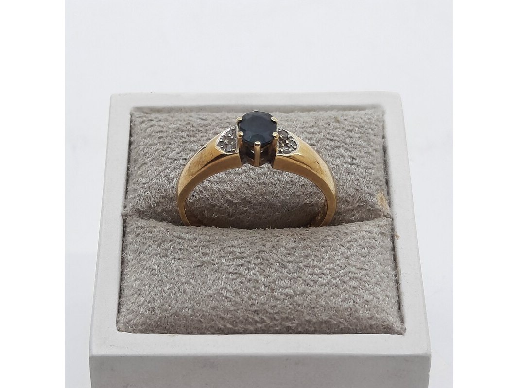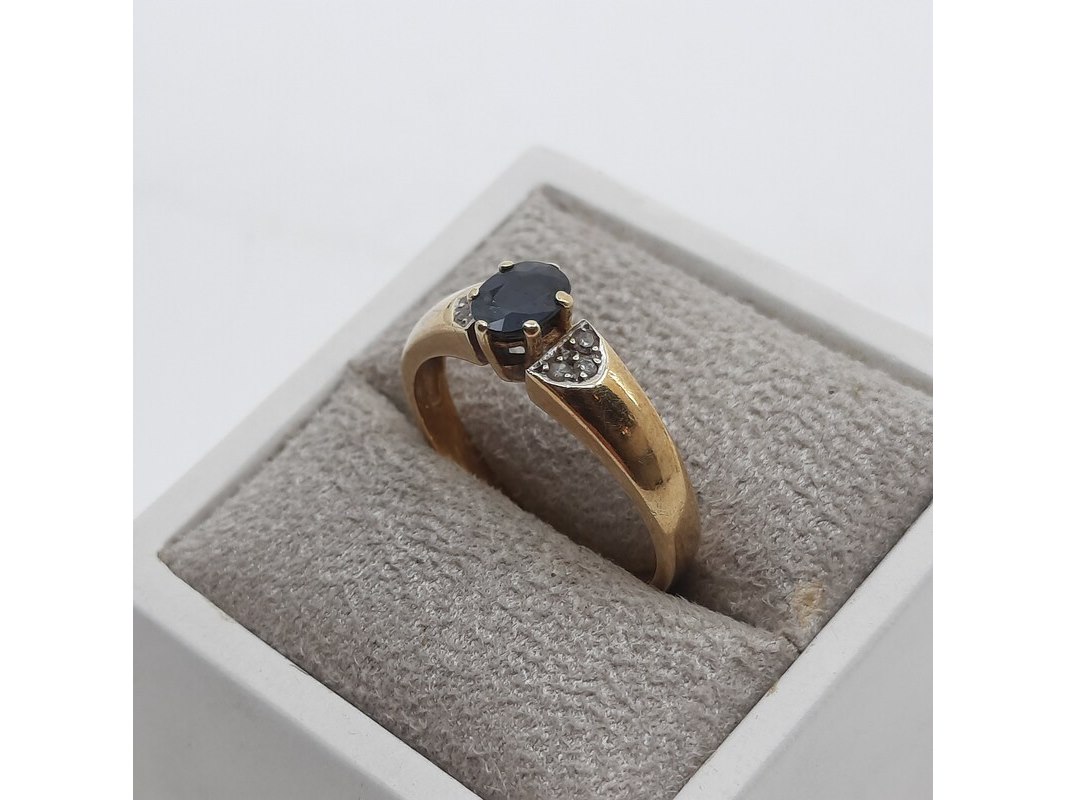 Product: Ring, 14 karaats Afmeting: Ringmaat ca. 17 (55) Conditie: gebruikt Specificaties: Een geelgouden ring, bezet met saffier en diamantjes. Gewicht ca. 3,17 gram.