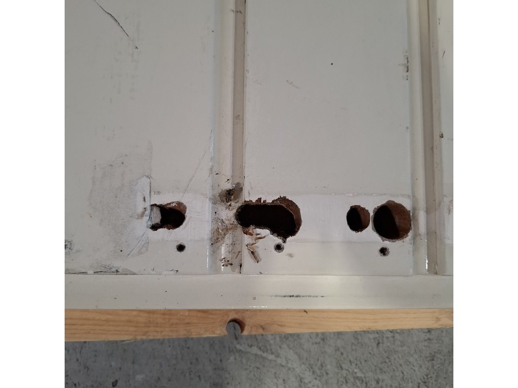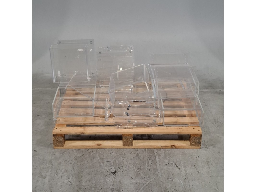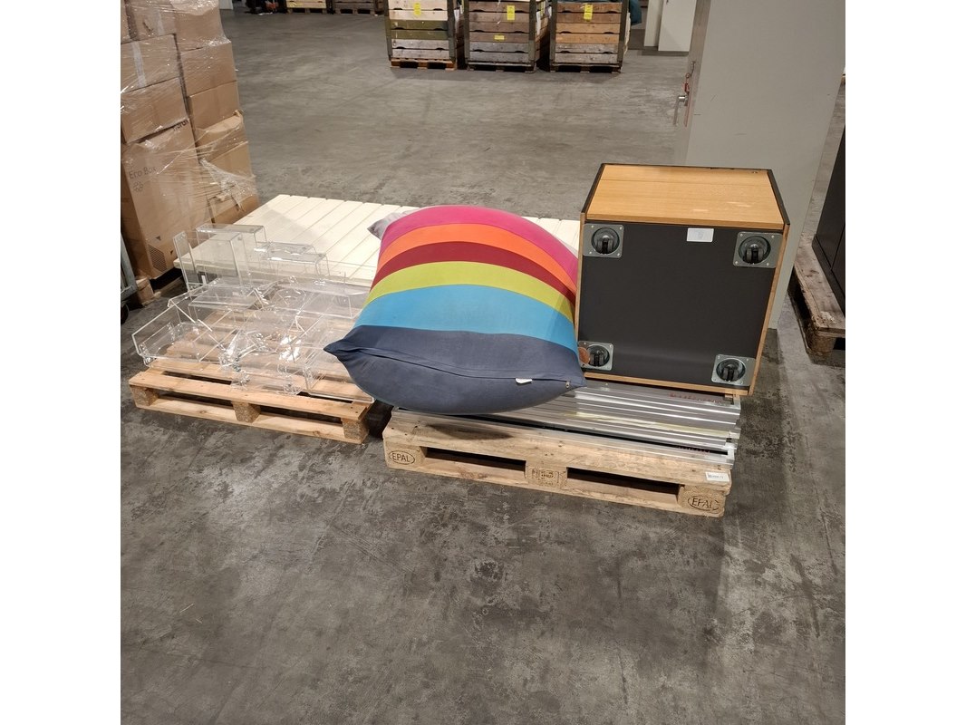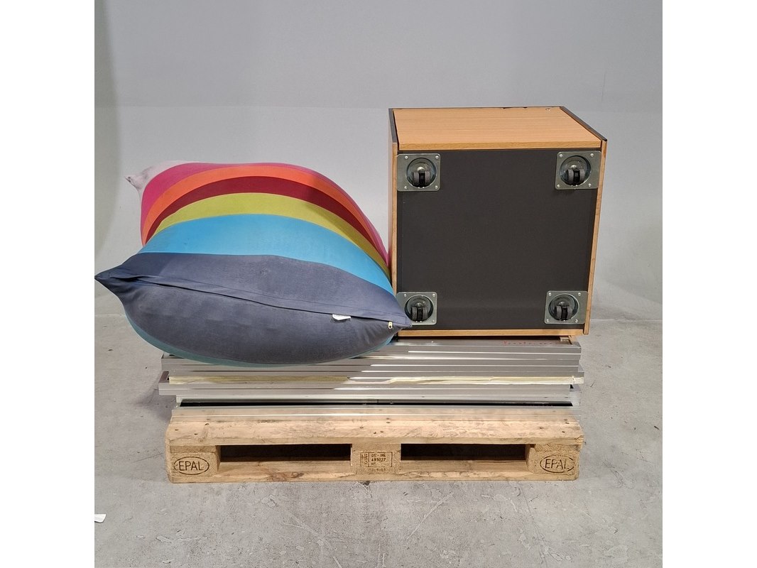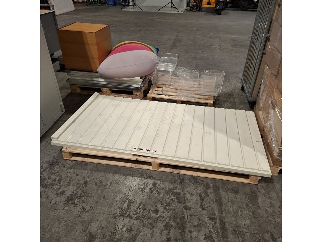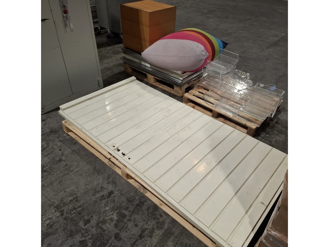 Product: Diverse bedrijfsinventaris Specificaties: Bestaande uit o.a. houten deur lxb ca. 224x114 cm plexi glazen bakjes, zitkussen, ladeblok en mededelingsborden Technische staat en compleetheid onbekend.