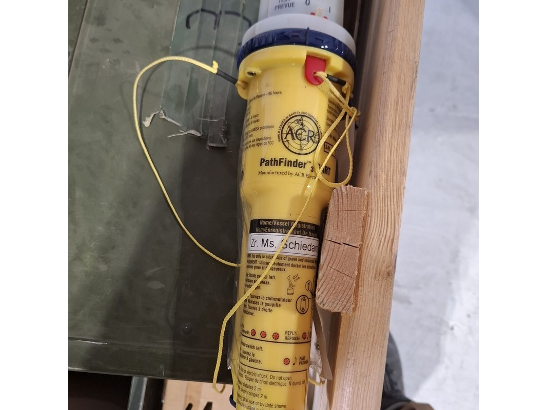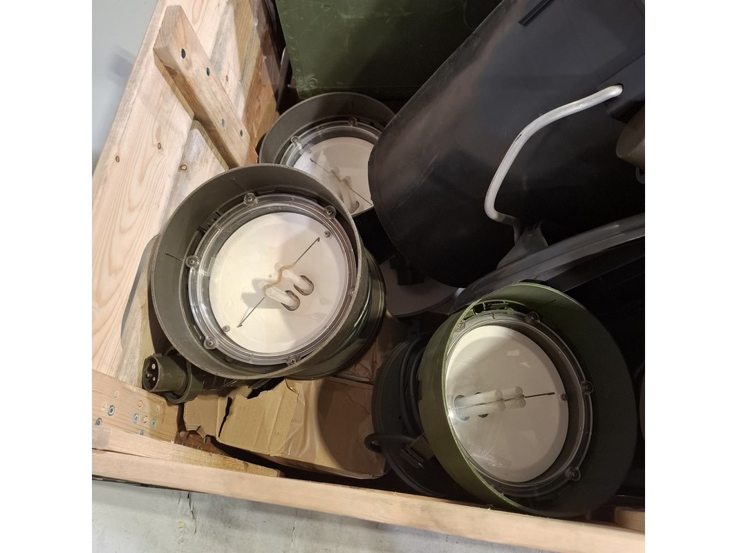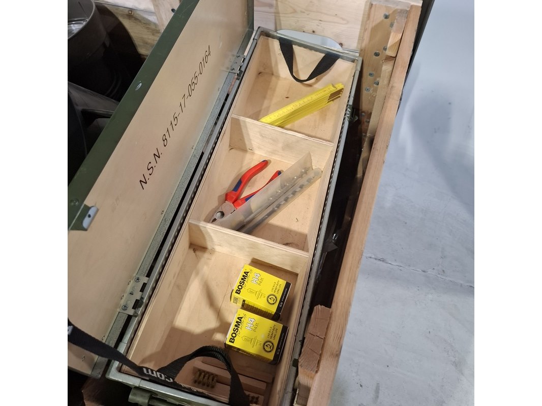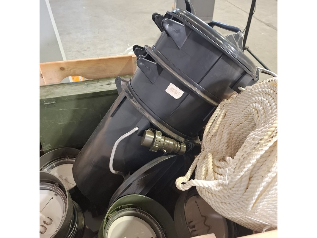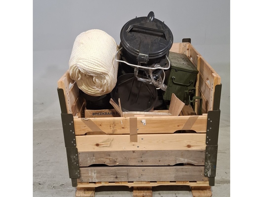 Product: Partij diversen Specificaties: Bestaande uit o.a. prullenbak, lampen, rol touw, duimstok, knipex tang, pathfinder radar transponders, etc Technische staat en compleetheid onbekend. Exclusief palletkist.