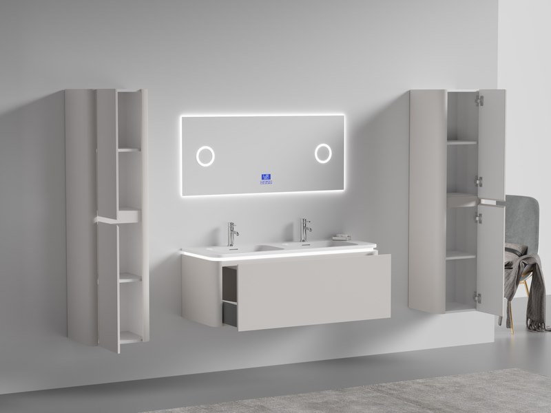 Merk: Vonato Product: Badkamermeubel Kleur: taupe Materiaal: melamine, MDF, metaal Conditie: nieuw Specificaties: Type: BOSTON1201-TA. Afmetingen Complete set: 1 * Wastafelmeubel - 1200x455x400mm, 1 * Dubbele wasbak - 1205x460x190mm, 2 * Zijkast - 1500x350x350mm, 1 * Spiegel- 1200x600mm. Voorzien van: LED verlichting in onderkast - 2 kranen inclusief pop-up afvoer – 1 lade met 2 opbergvakken - Softclose lade systeem - LED spiegel met anti-fog systeem - Voorgemonteerde zijkasten en wastafelmeubel.