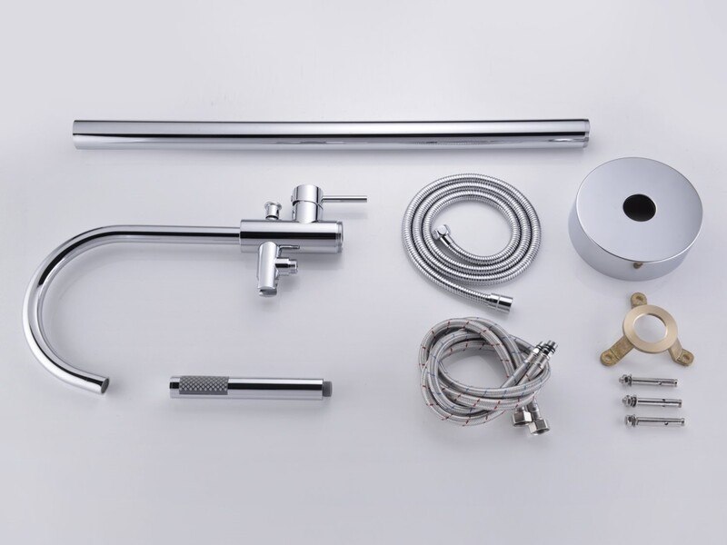 Merk: Vonato Product: Badkraan Kleur: zilverkleurig Materiaal: RVS, messing Conditie: nieuw Specificaties: Type: FAUCET CHROME. Voorzien van: Uitneembare handdouche - Buis, handdouche en beugel van messing - 360 graden draaibare uitloop.