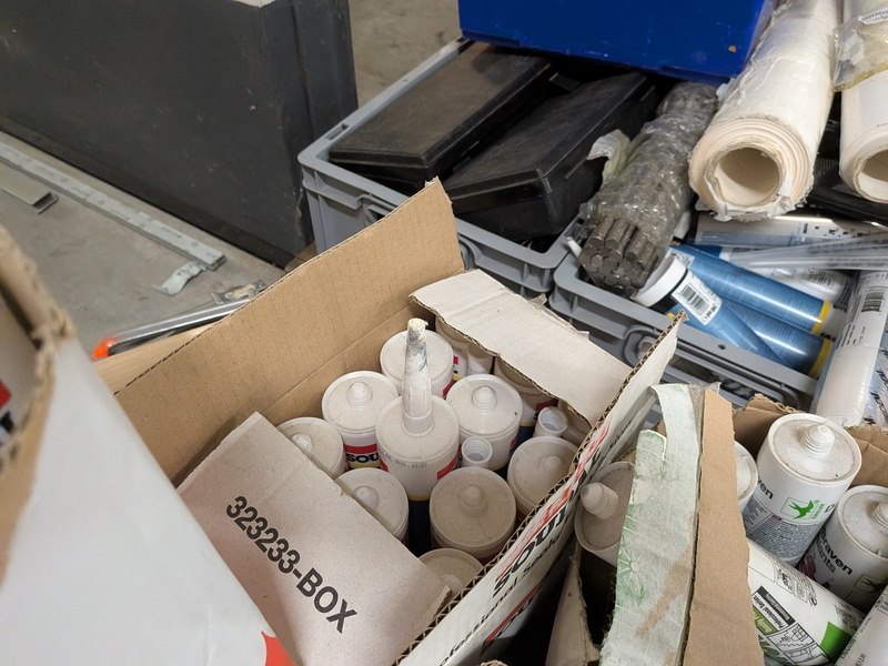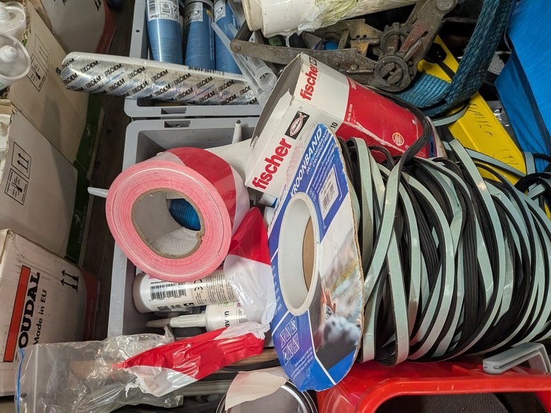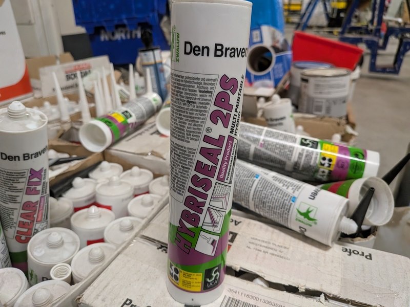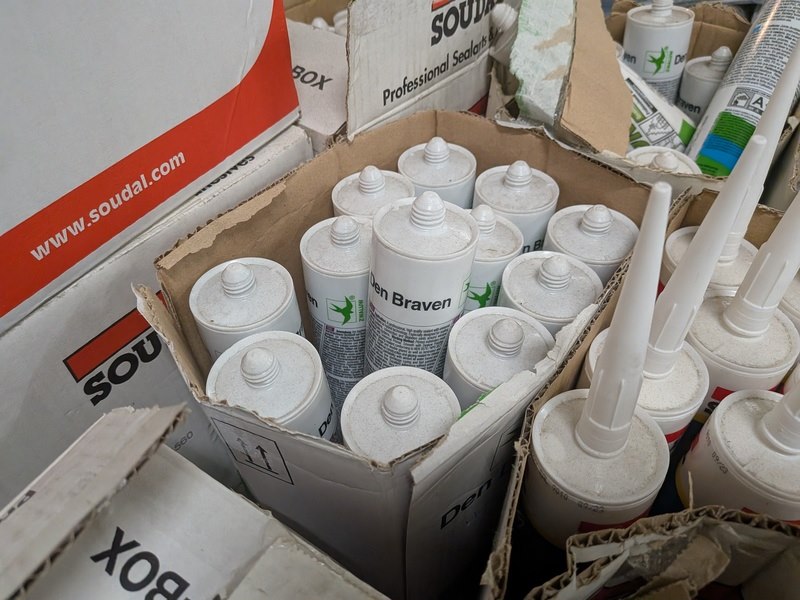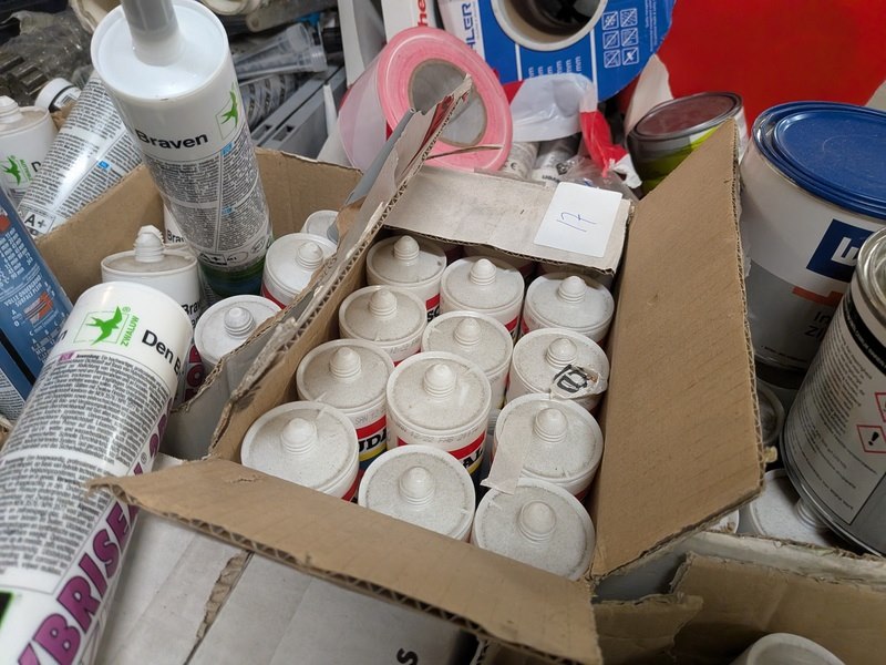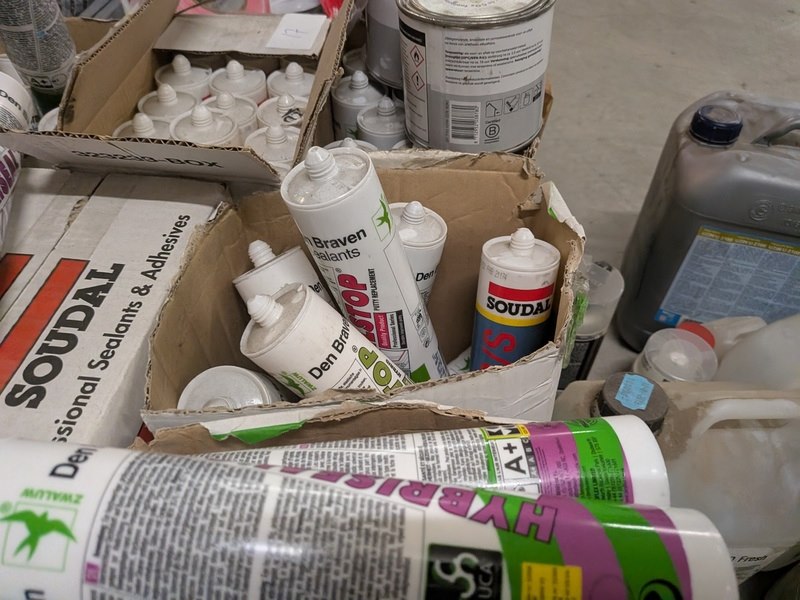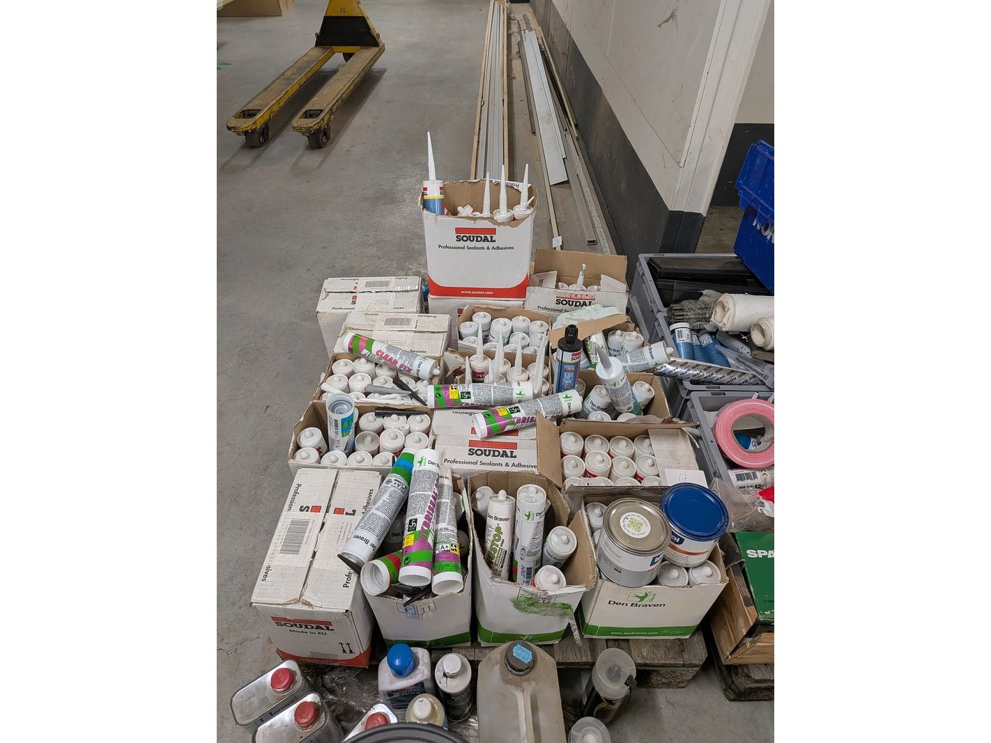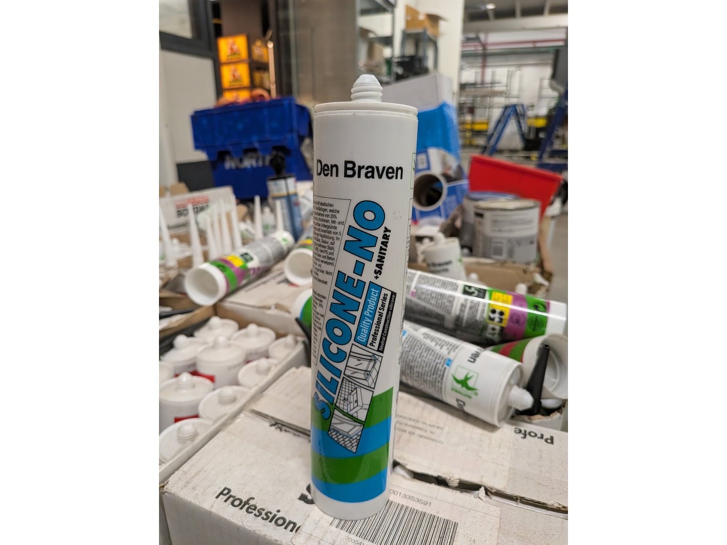 Product: Partij diversen Specificaties: bestaande uit o.a. : diverse kitten (Soudal en Den Braven), schroeven, epoxy, diverse verf restanten, handzagen, ratels, wikkelfolie etc.