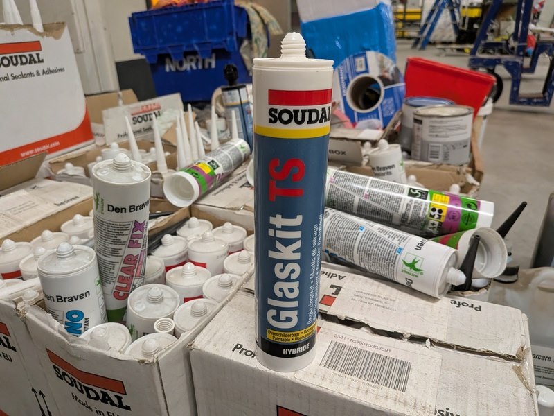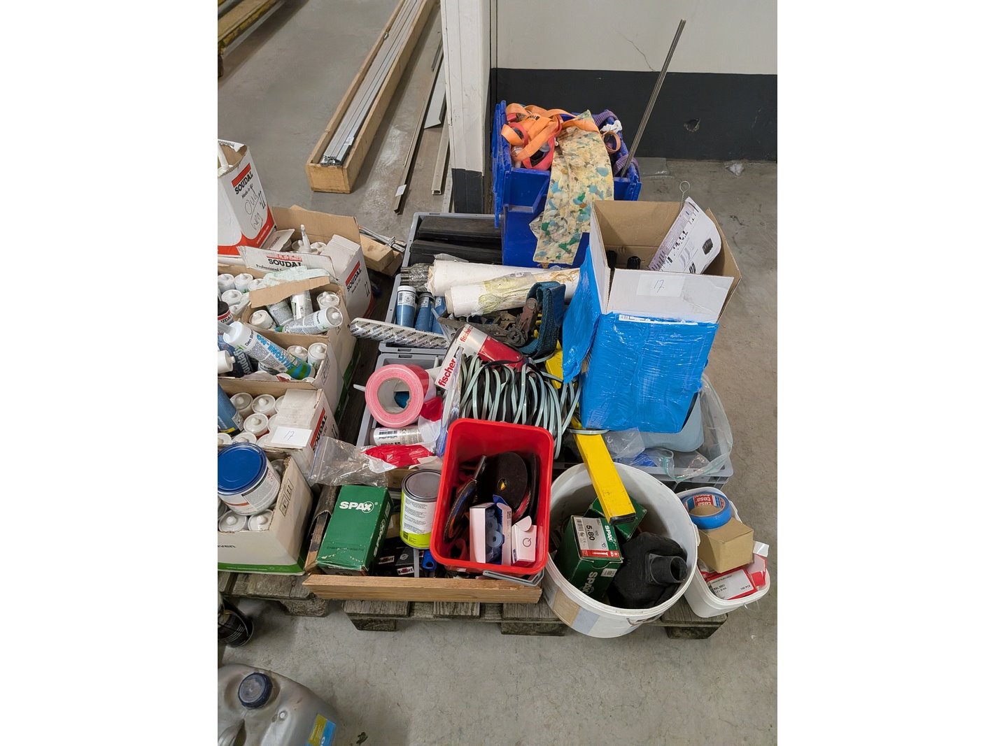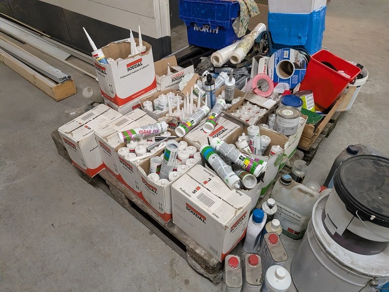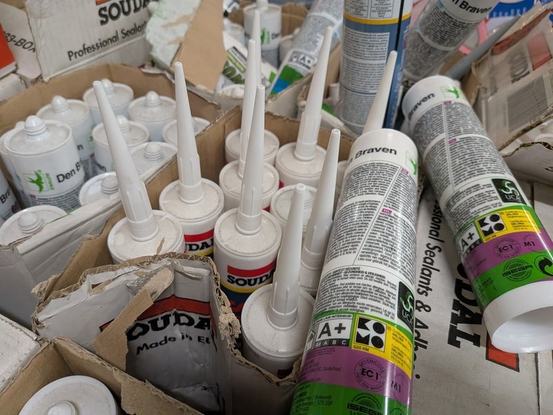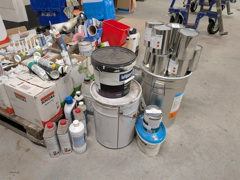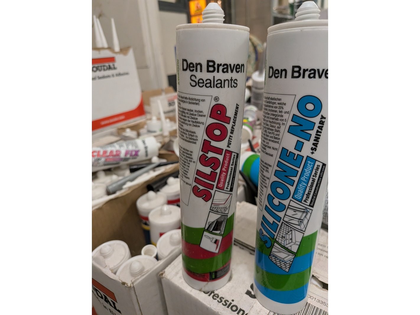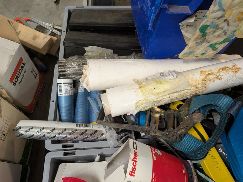 Product: Partij diversen Specificaties: bestaande uit o.a. : diverse kitten (Soudal en Den Braven), schroeven, epoxy, diverse verf restanten, handzagen, ratels, wikkelfolie etc.