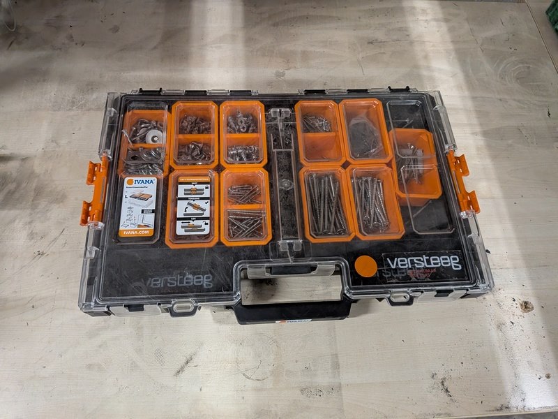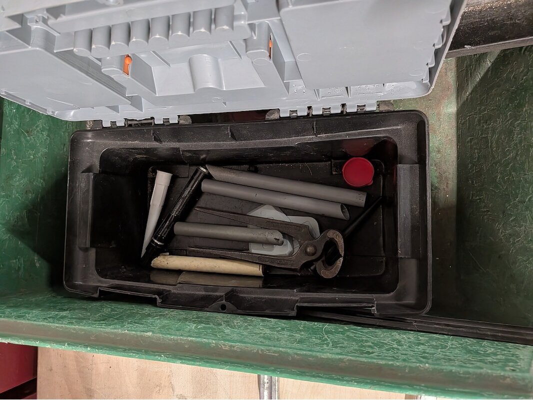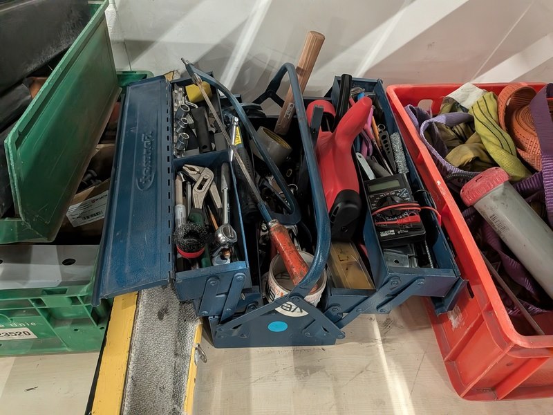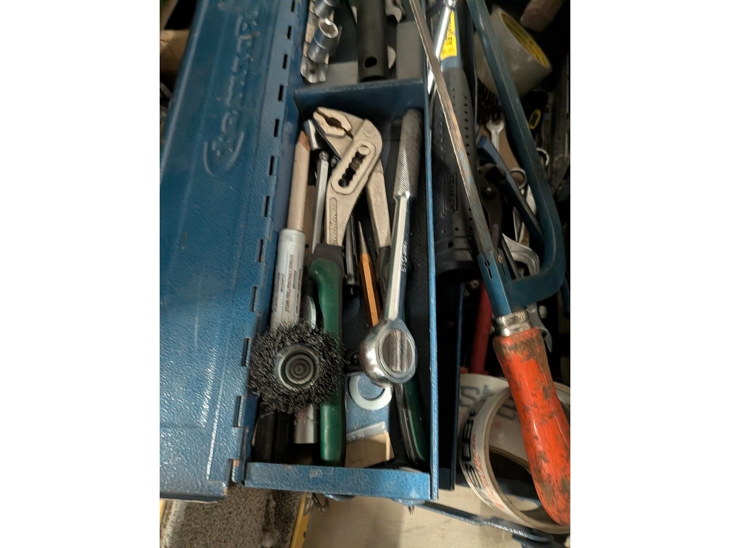 Product: Assortiment gereedschap Specificaties: o.a. lijmklemmen, handzagen, kitspuit, steek-ringsleutels, divers ijzerwaar, spanbanden, bouwradio, 4x afzethek etc.