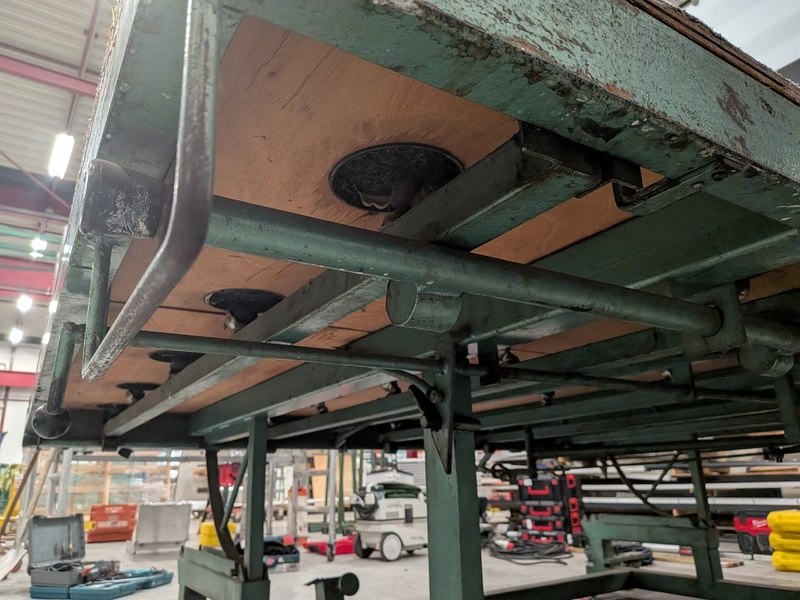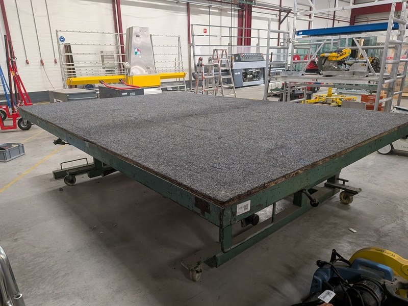 Product: Verrijdbare werktafel Materiaal: metalen onderstel, houten blad Afmeting: lxbxh ca. 320x221x85cm