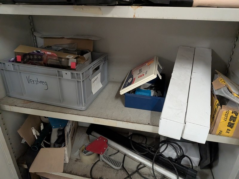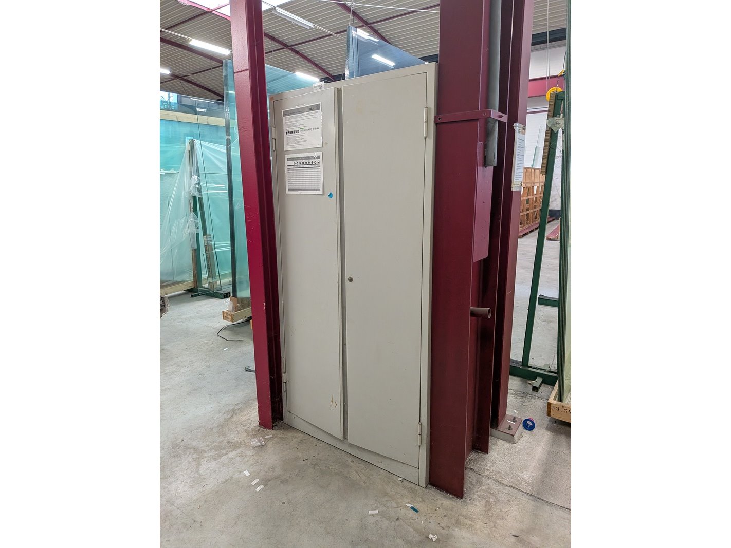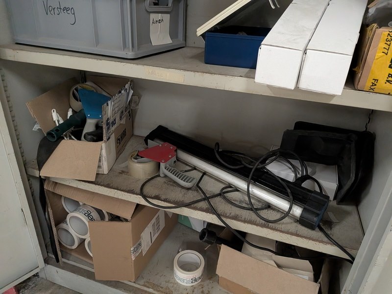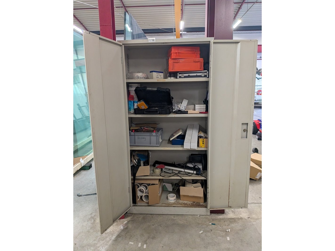 Product: Werkplaatskast met inhoud Materiaal: metaal Afmeting: hxbxd ca. 200x100x40cm Specificaties: inhoud: o.a. taperolhouders, glaslichters, schuurblokken, rollen tape etc.