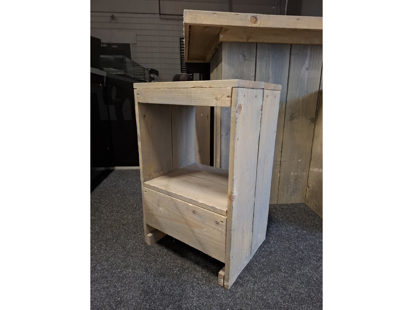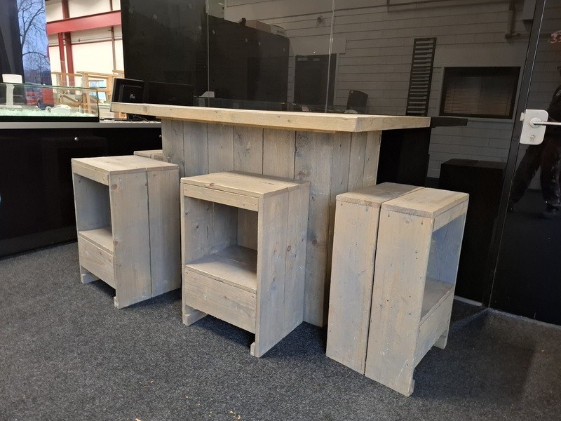 Product: Steigerhouten bartafel met 4x kruk Specificaties: tafel lxbxh ca. 165x106x110cm, kruk zithoogte ca. 78cnm