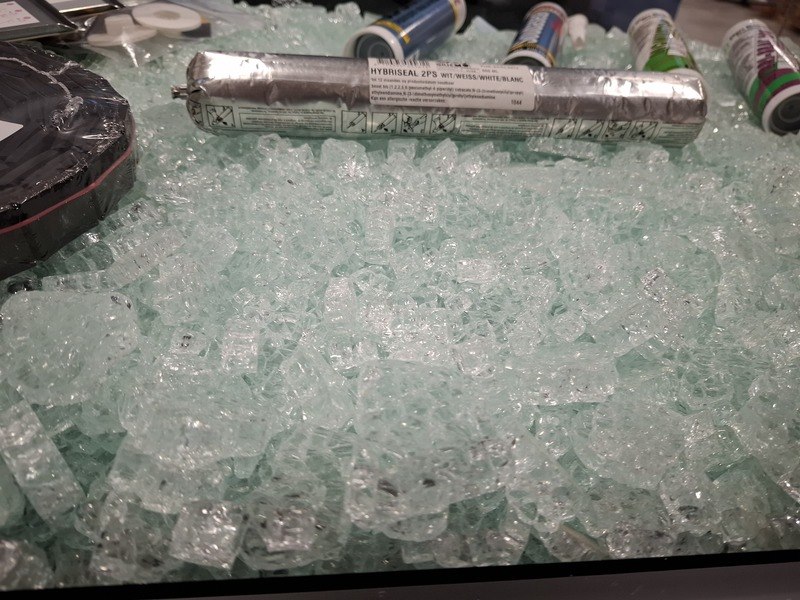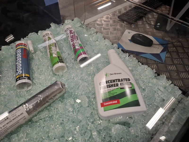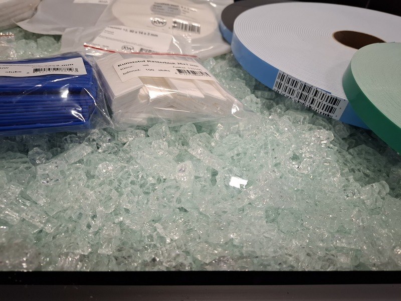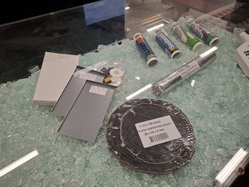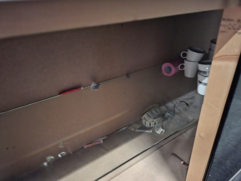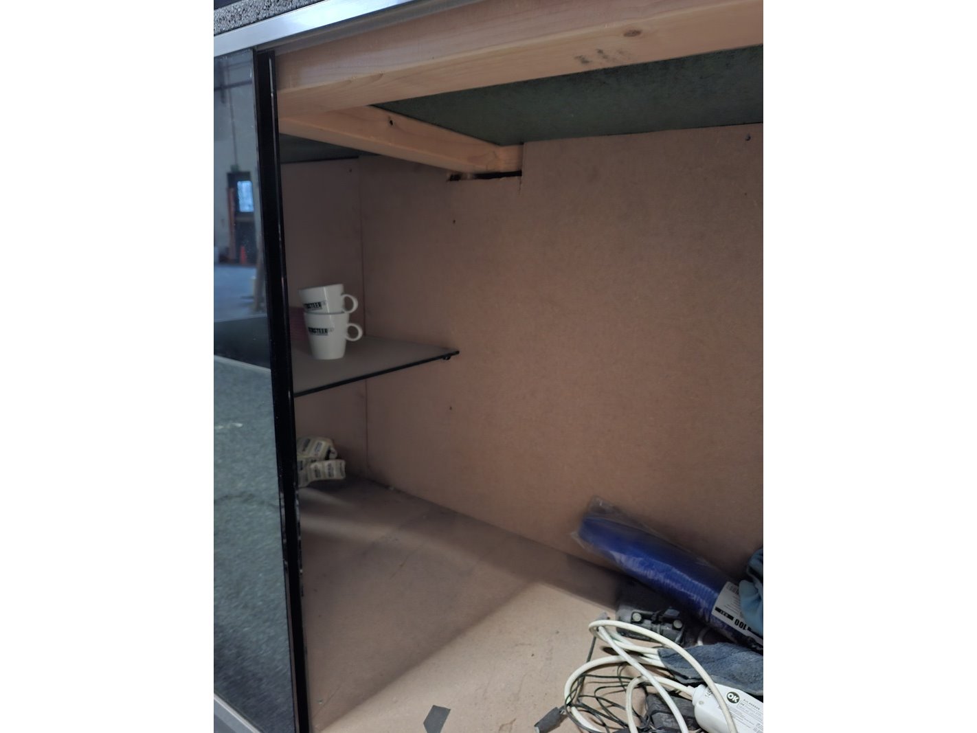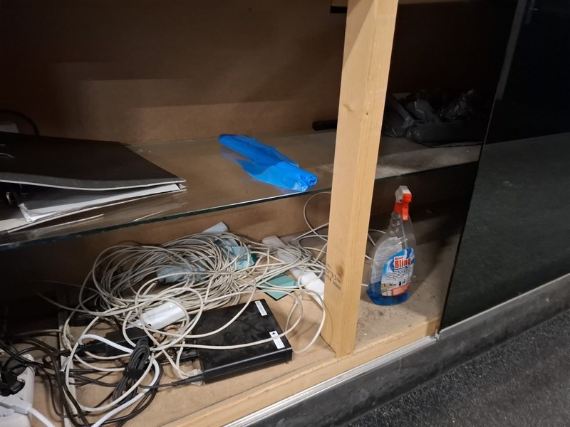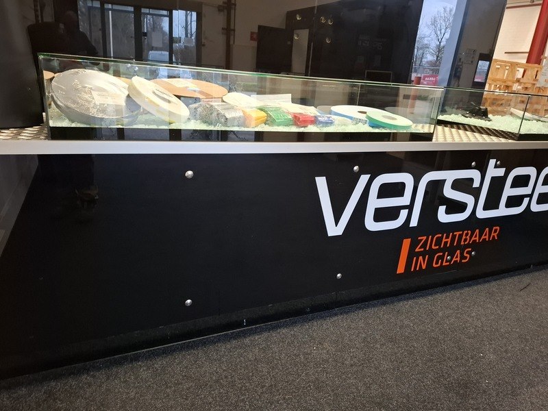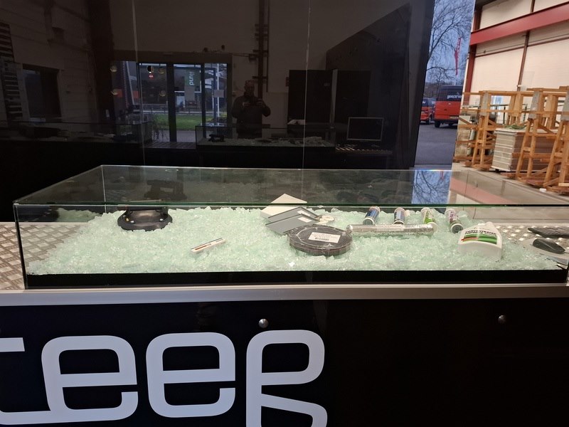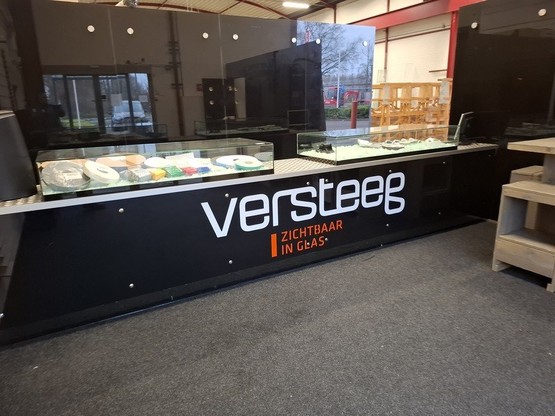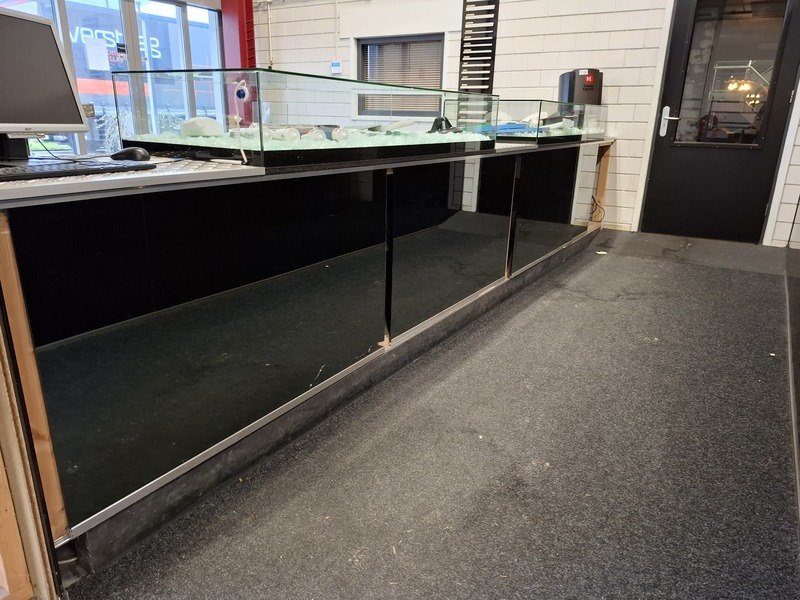 Product: Winkelbalie v.v. 2x vitrinekast Afmeting: lxbxh ca. 512x70x95/122cm Specificaties: inclusief inhoud schuifdeuren beschadigd