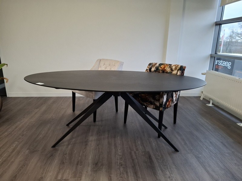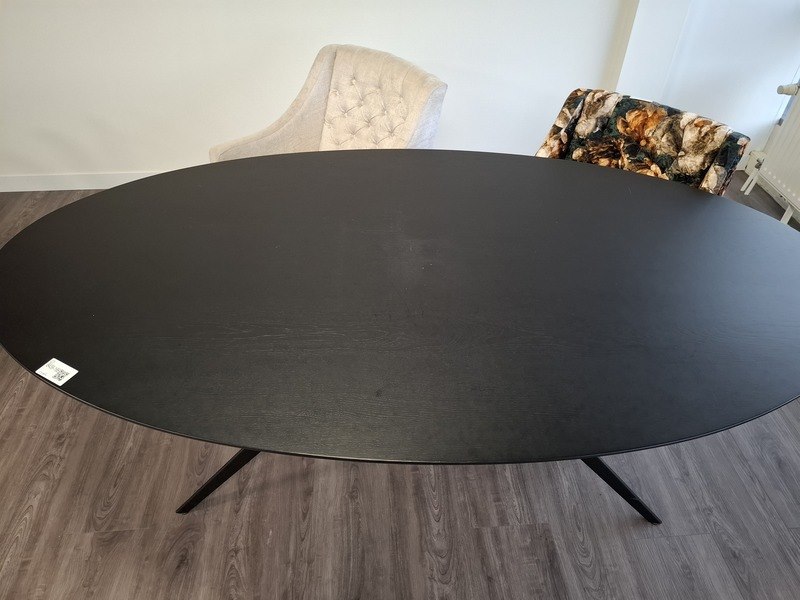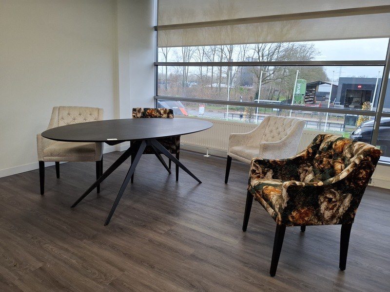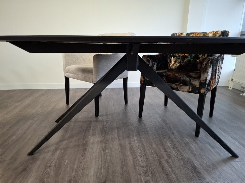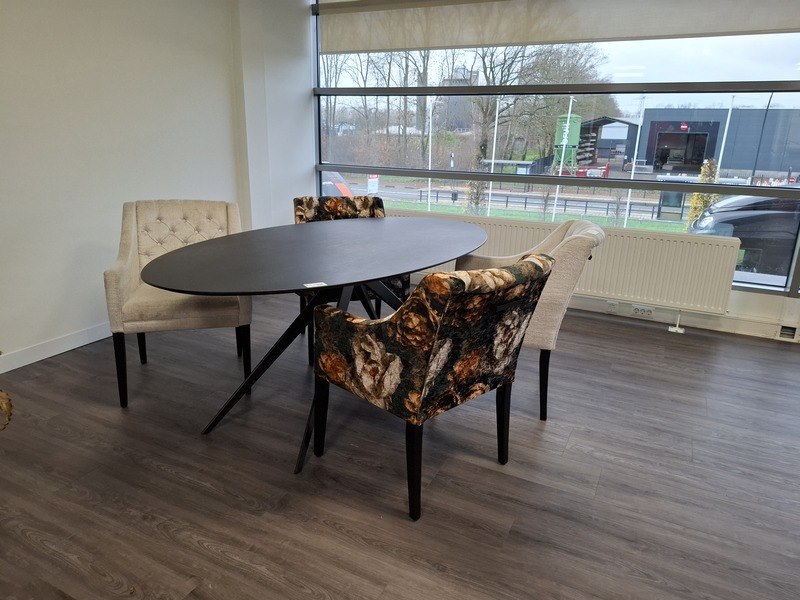 Product: Eetkamertafel met 4x stoel Specificaties: tafel houten blad, metalen poot, lxbxh ca. 200x110x75cm stoel zithoogte ca. 49cm