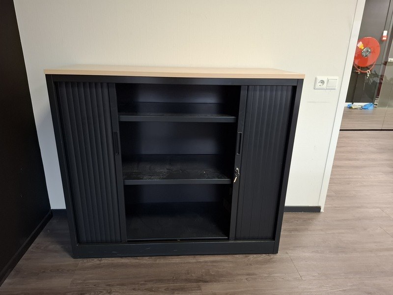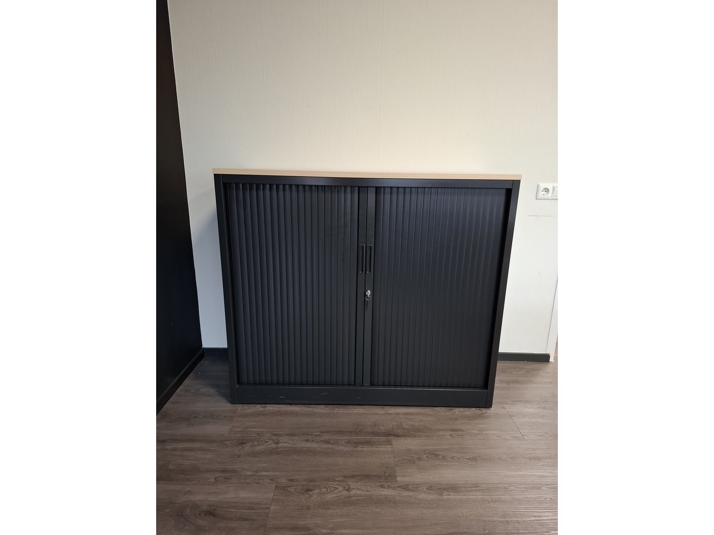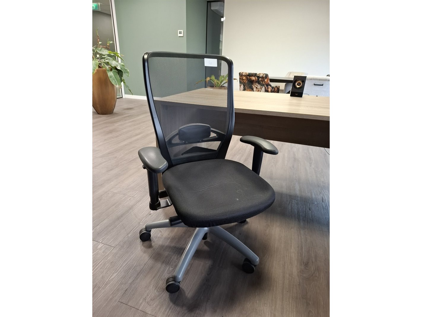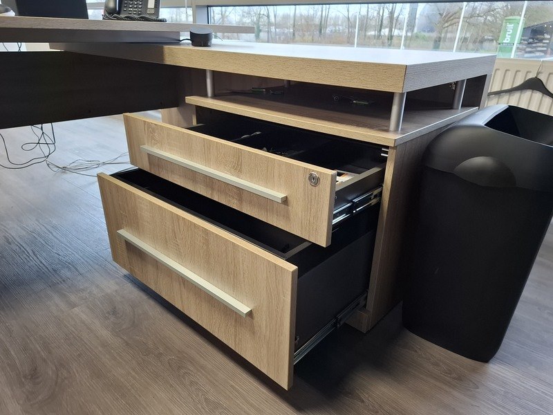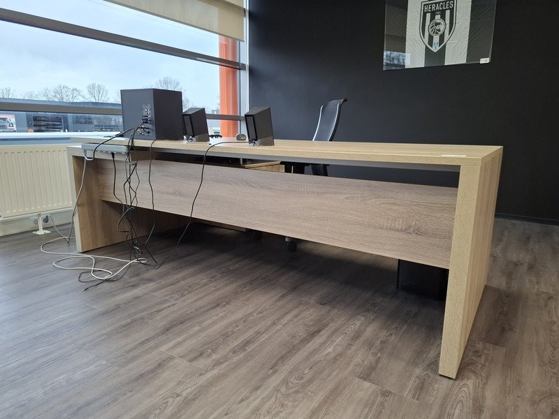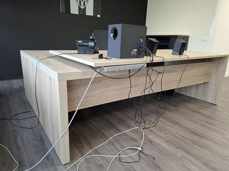 Product: Bureauopstelling Specificaties: bureau lxbxh ca. 230/180x60/100x68/74cm inclusief bureaustoel, speakerset en lameldeurkast hxbxd ca. 105x120x45cm met sleutel