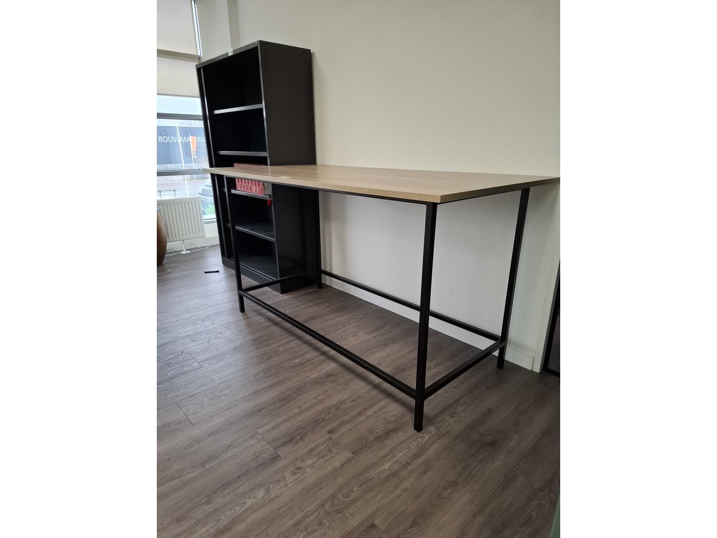 Product: Bartafel Materiaal: metalen onderstel, houten blad Afmeting: lxbxh ca. 200x100x110cm