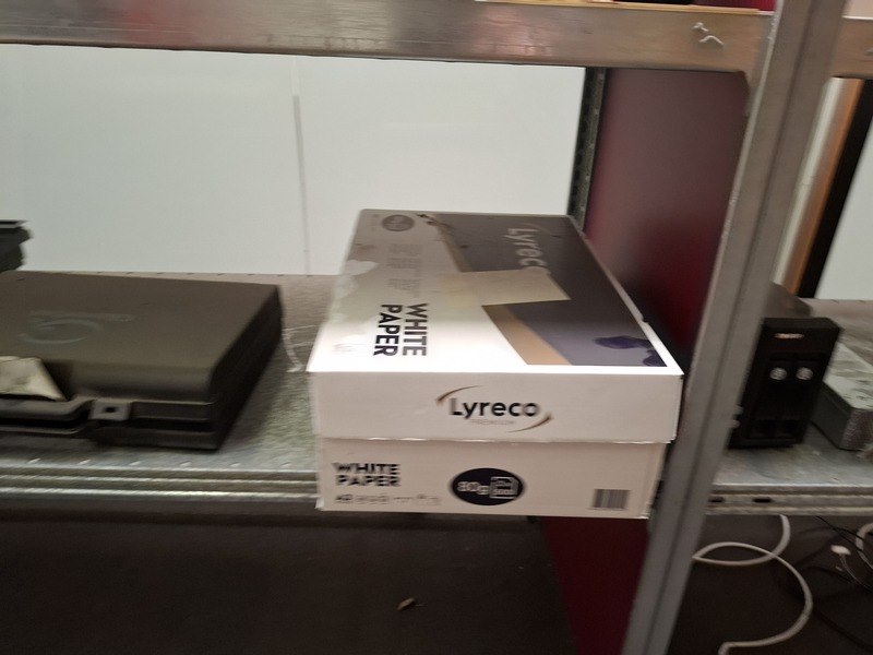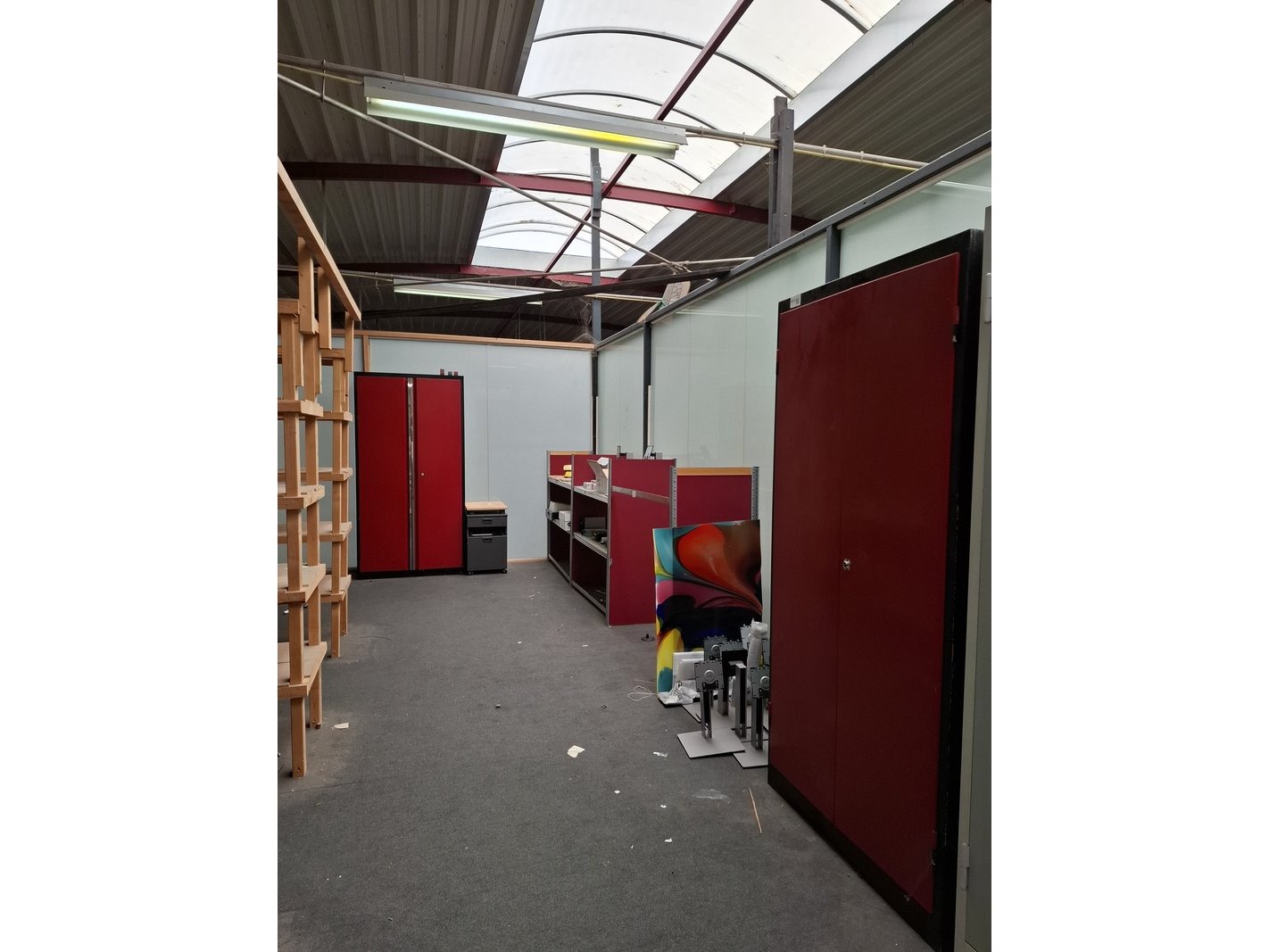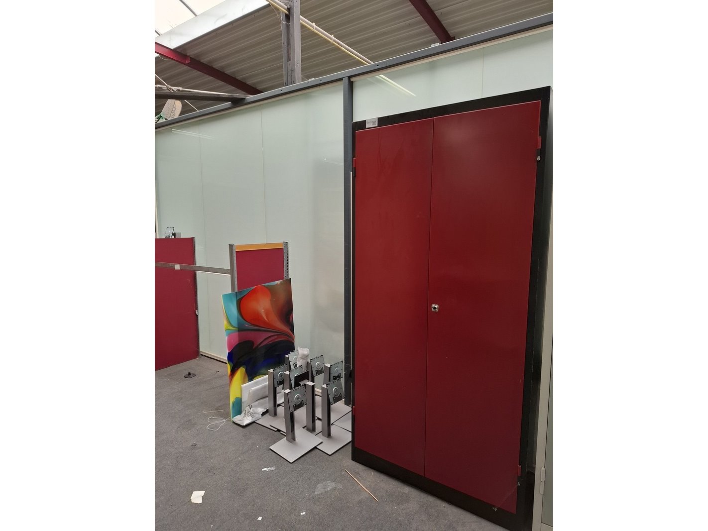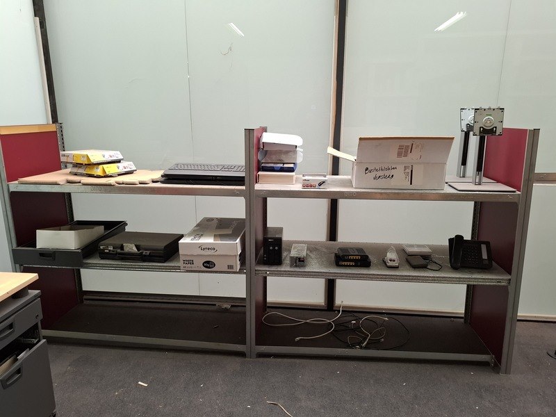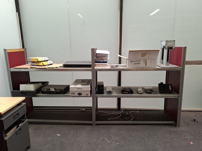 Product: Divers magazijn inventaris Specificaties: bestaande uit o.a. : 2x magazijnkast hxbxd ca. 195x95x45cm, exclusief sleutel stelling lxbxh ca. 397x52x125cm ladeblok, monitor steunen, toetsenborden, papier, etc.