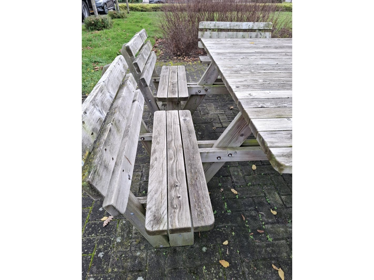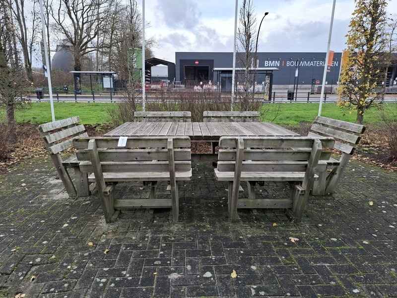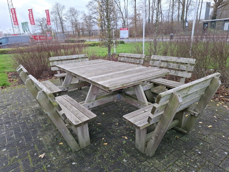 Product: Picknick tafel Materiaal: hout Afmeting: opstelling lxbxh ca. 375x270x90cm Specificaties: 1 geheel tafel lxbxh ca. 220x120x78cm