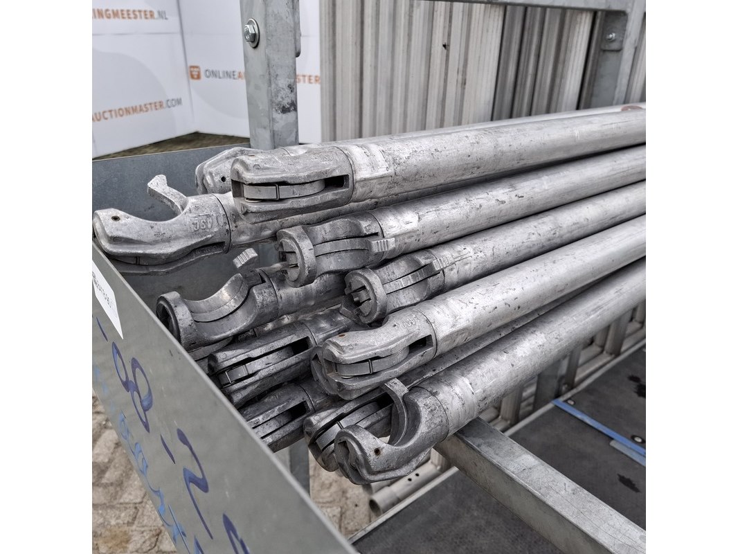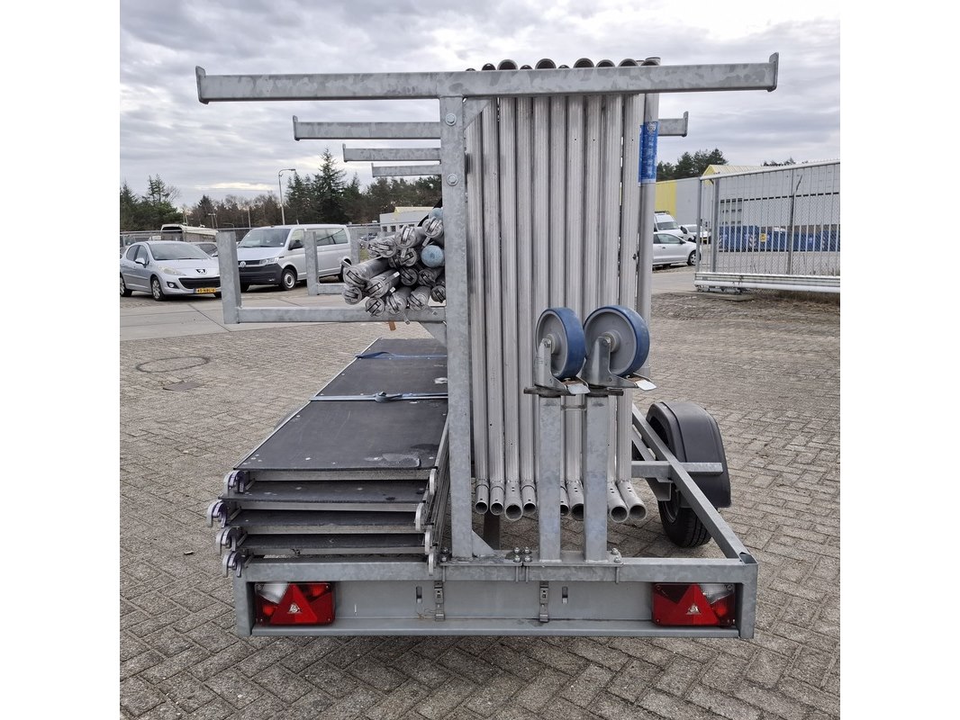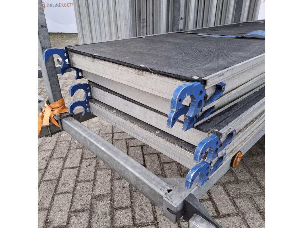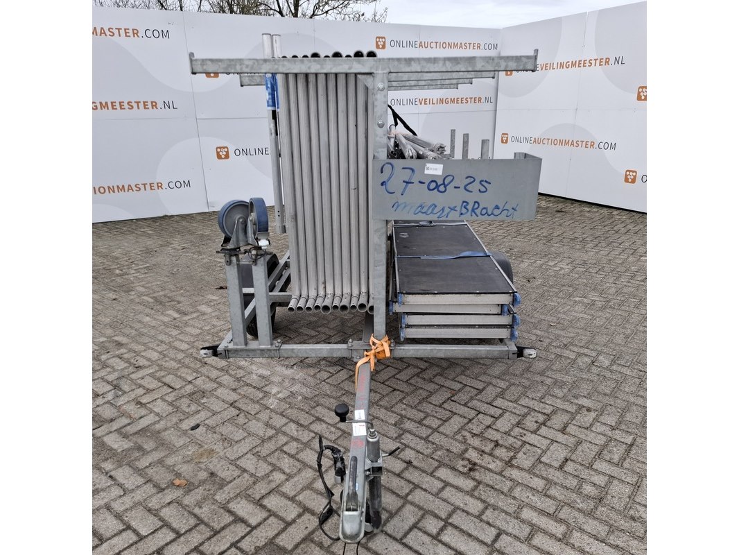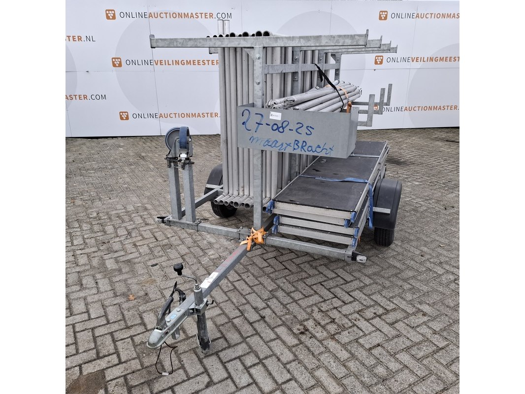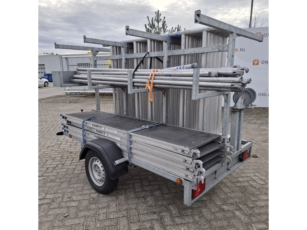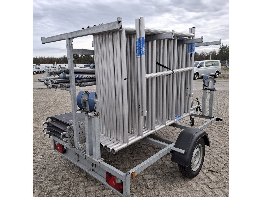 Merk: o.a Alumexx Product: Steiger op aanhanger Afmeting: Diverse maten Conditie: gebruikt Specificaties: De aanhanger is beladen met steiger delen met een hoogte van 8 a 10 meter. Steiger met rolwielen en 4 bladen De aanhanger is ongeremd, geen kenteken Stekker aanhangerverlichting kapot