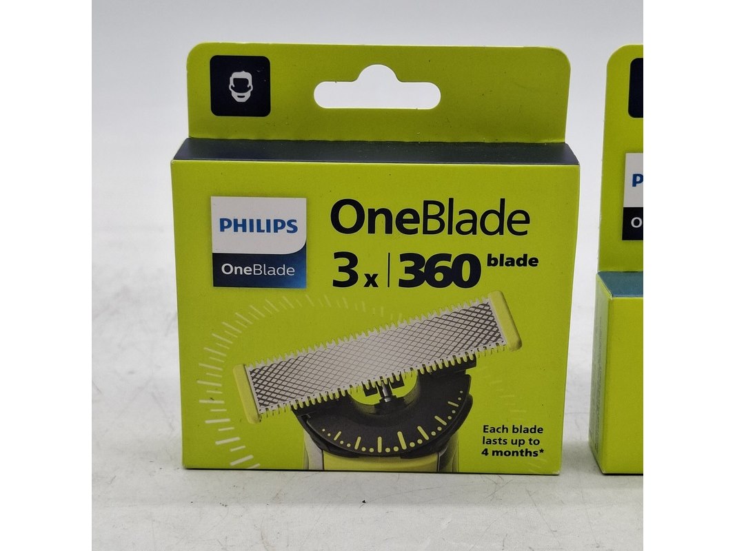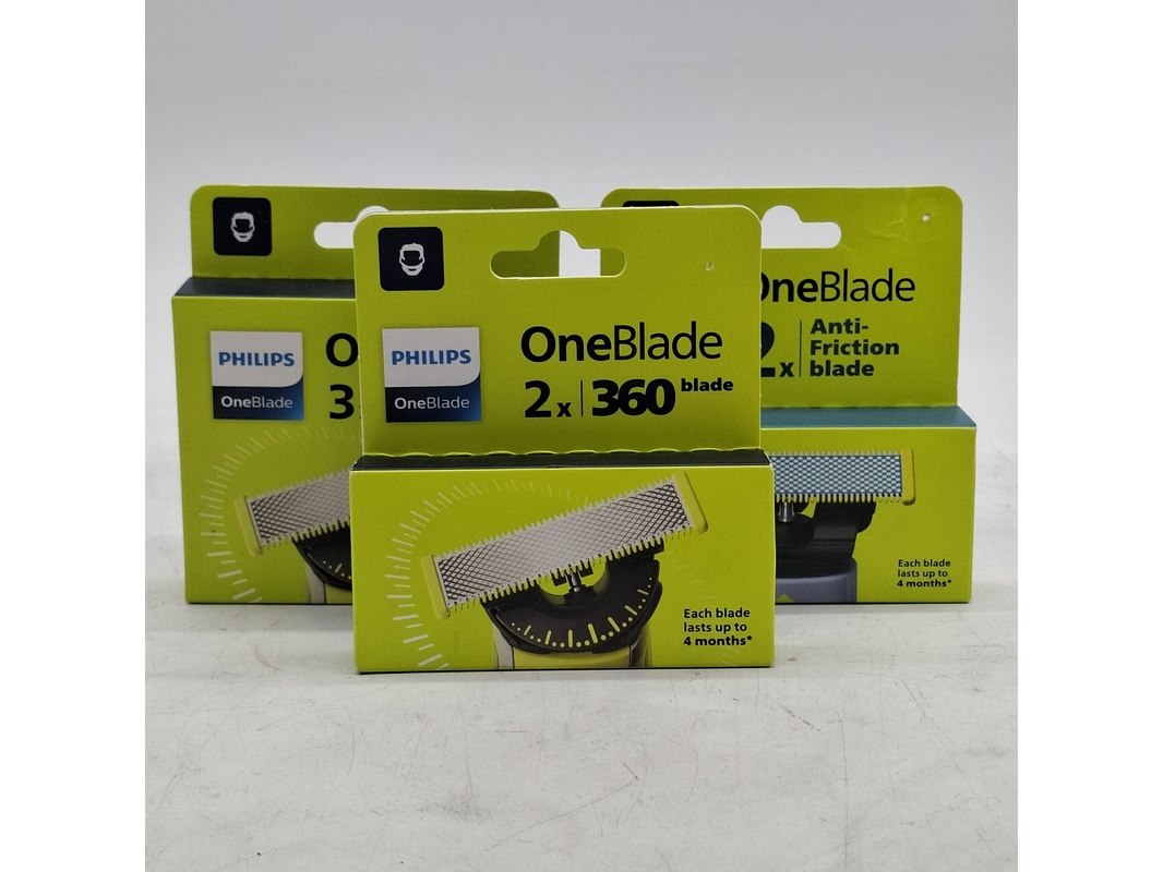 Merk: Phillips Product: Opzetstuk t.b.v scheerapparaat Afmeting: Diverse maten Specificaties: Zit in 3x doosje, bestaande uit: 1x Phillips Oneblade 360 Blade (3x) 1x Phillips Oneblade Anti Friction blade (2x) 1x Phillips Oneblade 360 Blade (2x)