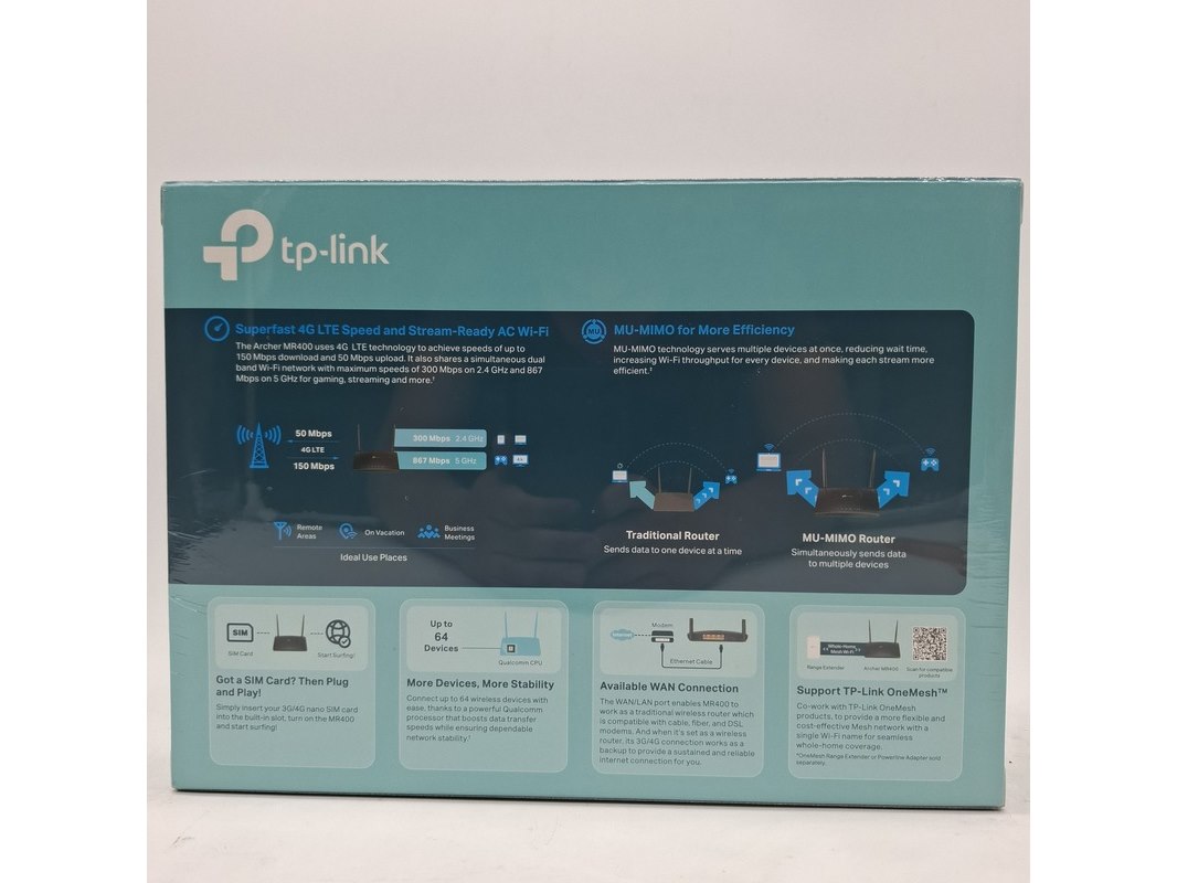 Merk: TP-Link Product: Router Specificaties: Archer MR400 Doosje is geseald.