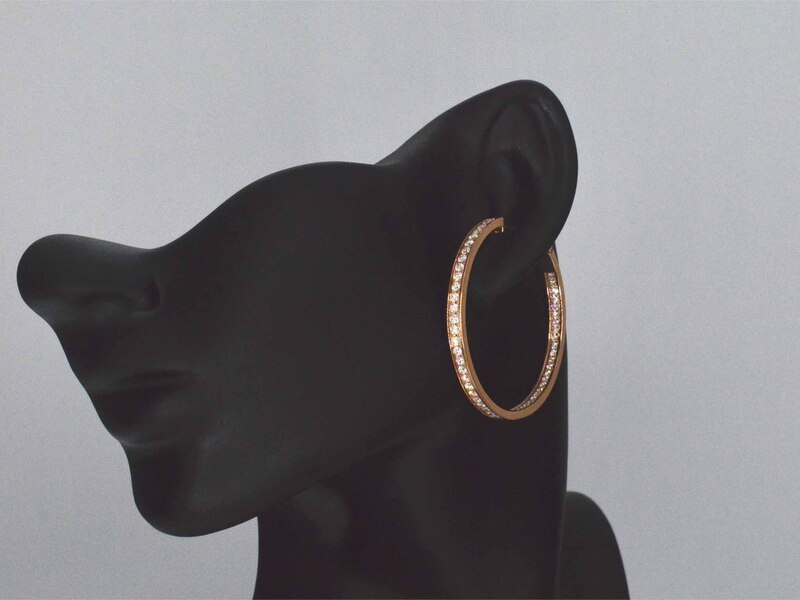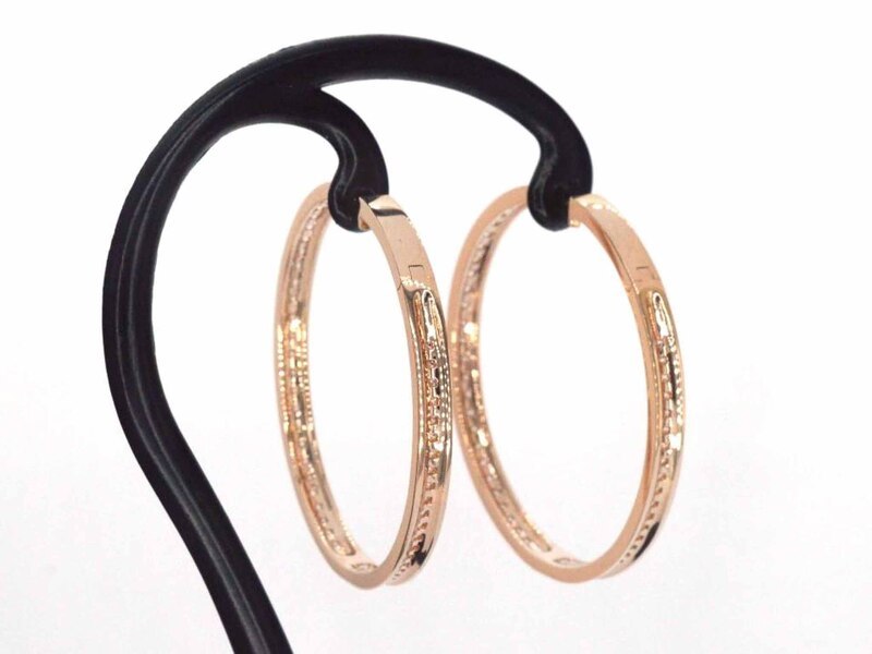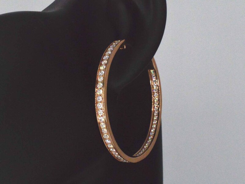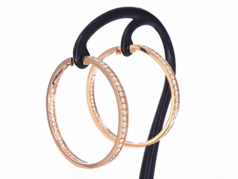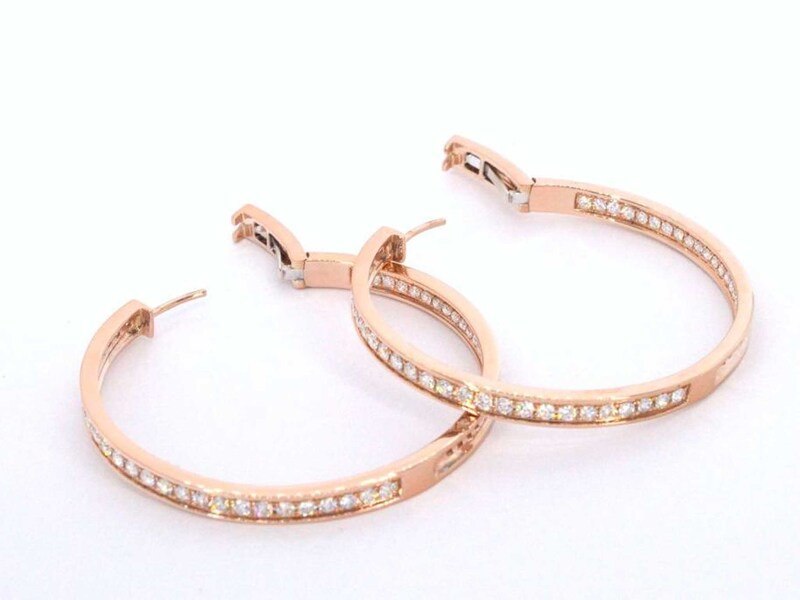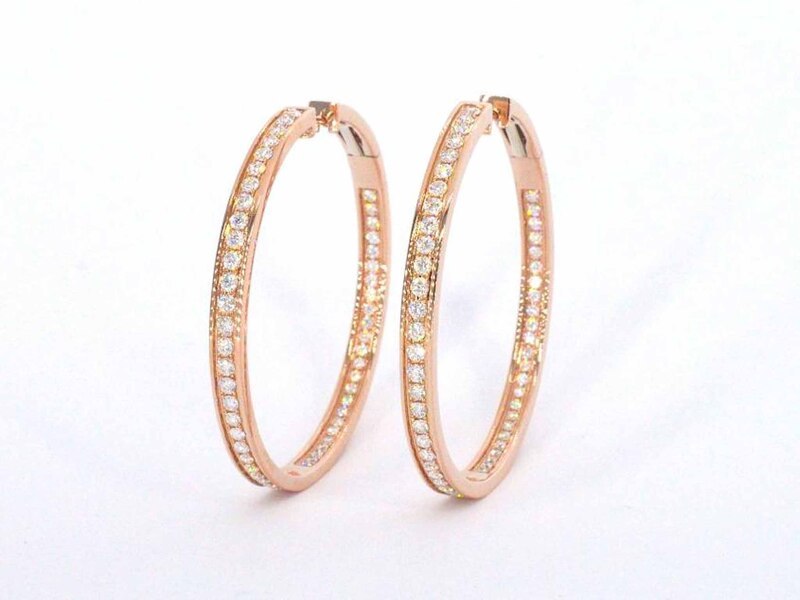 Product: Rosegouden creolen met diamanten Specificaties: Diamant: Natuurlijk Aantal: 102 stuks Slijpvorm: Briljant geslepen Gewicht (carat): 4.00 carat Kleur: D-E Zuiverheid: VVS Slijpkwaliteit: Zeer mooi Juweel: Oorbellen Gewicht: 22.2 gram Materiaal: 14k goud (585) Conditie: Zo goed als nieuw Verpakking: Luxe sieradendoos Toelichting: De kwaliteit is overgenomen van het rapport behorend bij item. De waardebepaling is een beoordeling van een gecertificeerde diamantair, gebaseerd op consumentenprijzen. Consumentenprijs: € 24.000,-