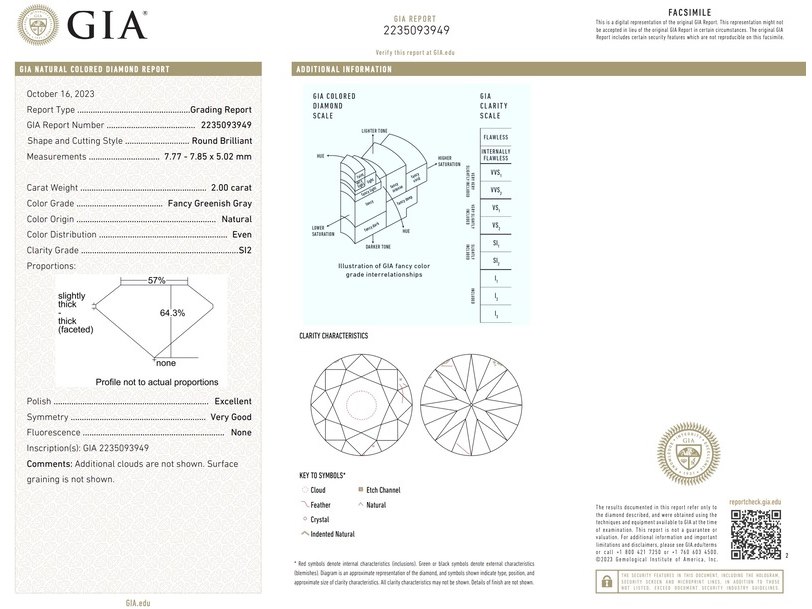Product: Diamant - 2.00 carat natuurlijke briljant geslepen diamant (gecertificeerd) Specificaties: Diamant: Natuurlijk Aantal: 1 stuk Slijpvorm: Briljant geslepen Gewicht (carat): 2.00 carat Kleur: natural fancy greenish gray Zuiverheid: SI2 Slijpkwaliteit: Excellent Certificaat: GIA Certificaat nummer: 2235093949 Conditie: Nieuw Verpakking: Edelsteendoos Toelichting: De kwaliteit is overgenomen van het rapport behorend bij item. De waardebepaling is een beoordeling van een gecertificeerde diamantair, gebaseerd op consumentenprijzen. Consumentenprijs: € 35.000,-