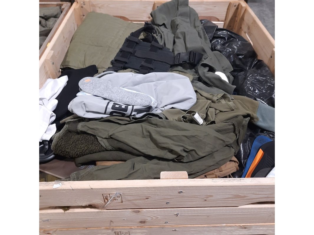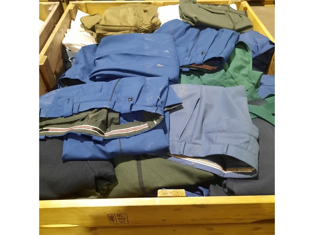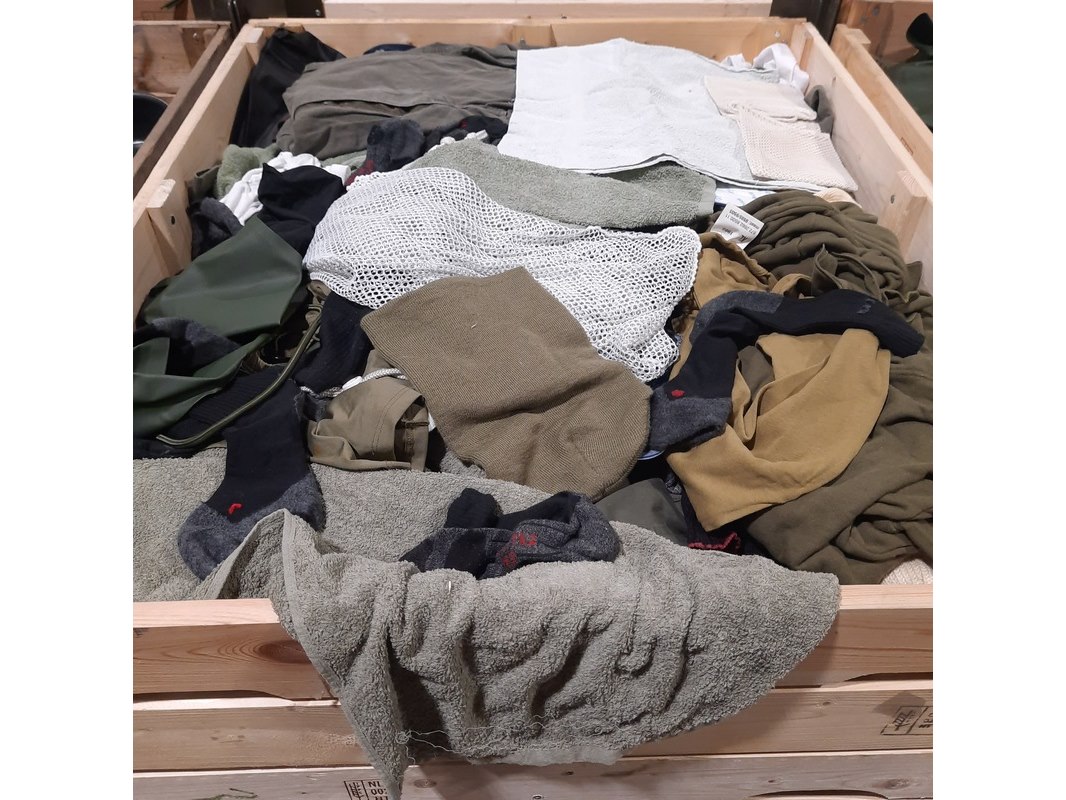 Product: Persoonlijke uitrusting en kleding Defensie Afmeting: Diverse maten Conditie: gebruikt Specificaties: Bestaande uit ca. 38x palletbox ongesorteerde artikelen.