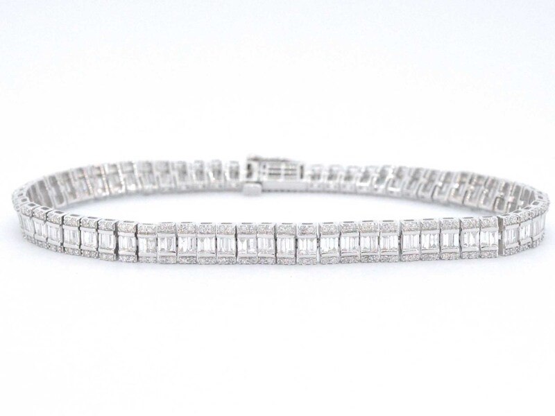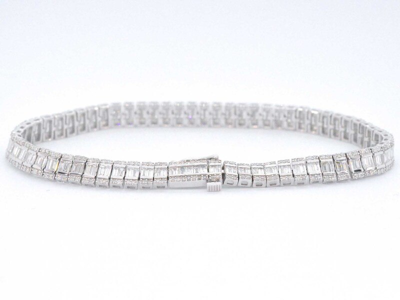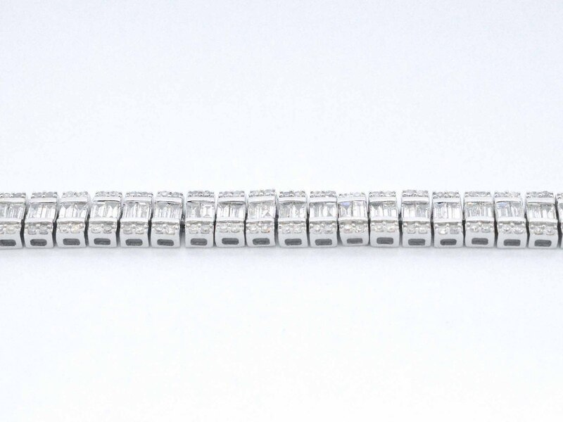 Product: Witgouden armband met volledig gezet met diamanten 4.50 carat Specificaties: Diamant: Natuurlijk Slijpvorm: Baguette geslepen en swiss geslepen Gewicht (carat): 4.50 carat Kleur: F-G Zuiverheid: VS-SI Juweel: Armband Gewicht: 15 gram Afmetingen/lengte: 18 cm Materiaal: 14 karaat (585) Conditie: Nieuw Verpakking: Luxe sieradendoos Toelichting: De kwaliteit is overgenomen van het rapport behorend bij item. De waardebepaling is een beoordeling van een gecertificeerde diamantair, gebaseerd op consumentenprijzen. Consumentenprijs: € 17.500,-