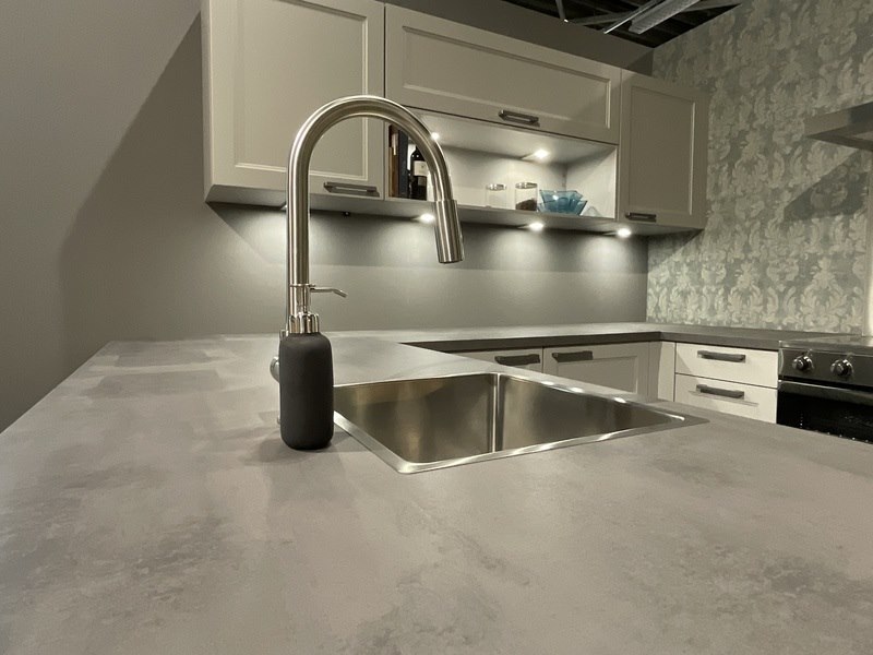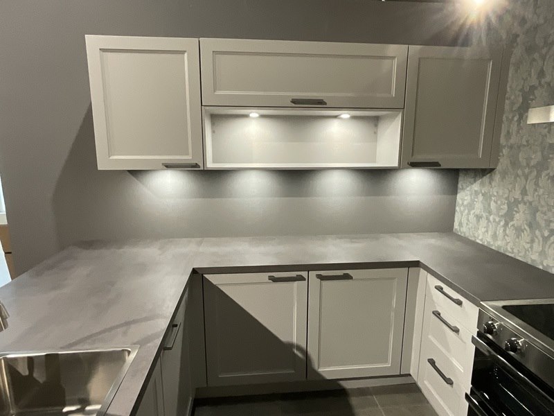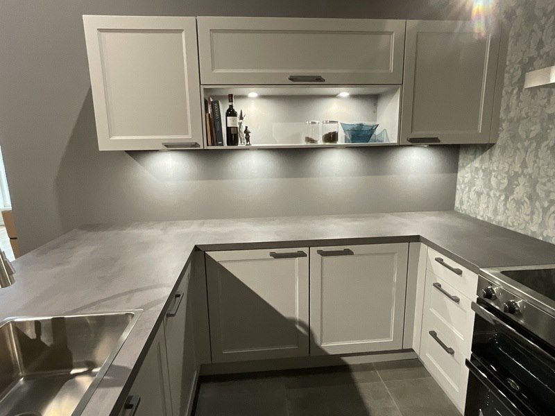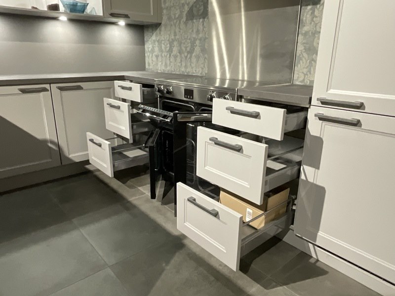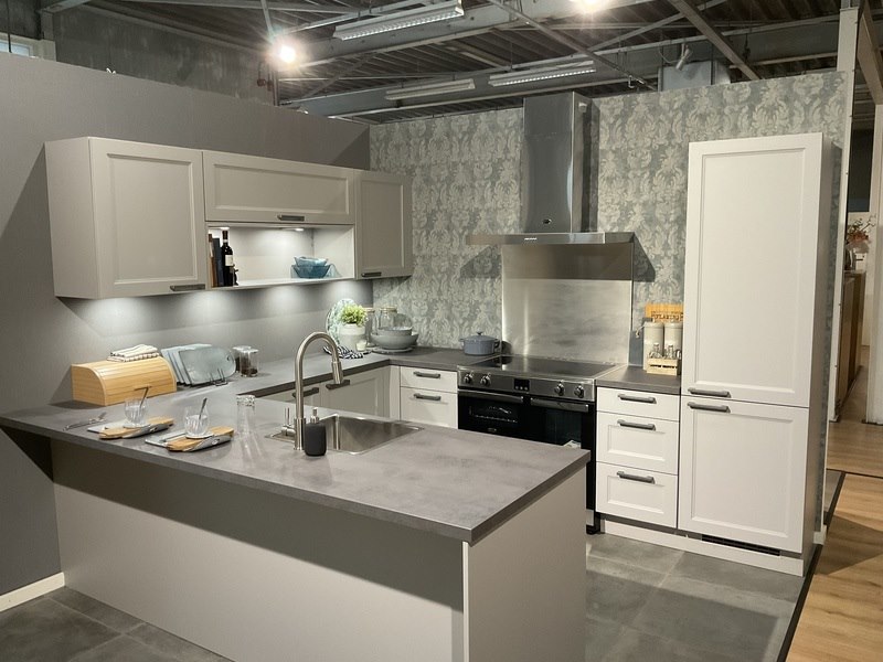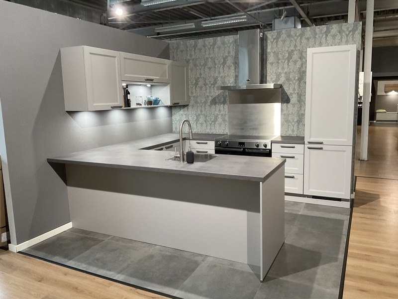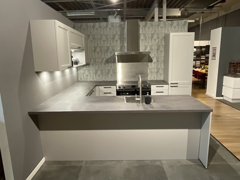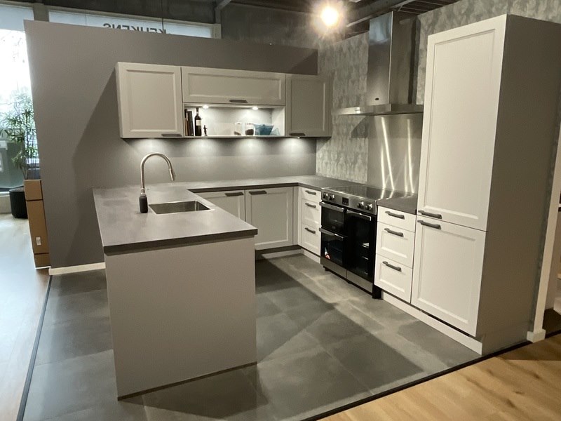 Merk: Nobilia Product: Keuken met inbouwapparatuur Kleur: steengrijs Conditie: nieuw Specificaties: U Keuken Maatvoering: 215 x 277x305 Hoogte: 215 Kraan: Lanesto handdouche Gootsteen: Lanesto SDE0024 Aanrechthoogte: 91cm Keukenblad: Nobilia laminaat Kookplaat: in fornuis Koel-vriescombinatie : Zanussi ZNLN18FS1 Inductiefornuis: Belling Gourmet 900 RVS Afzuigkap: Belling cookcentre 90 flat Vaatwasser: Zanussi ZDLN 1510 Inclusief RVS achterwand Exclusief accessoires