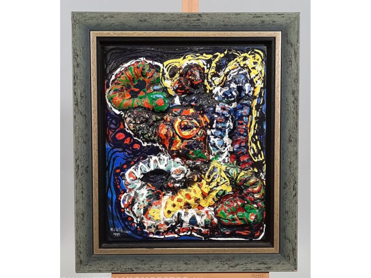 Product: Maya Wildevuur (1944-2023) "Pur" 3D kunstwerk Conditie: Gebruikt Specificaties: Een van de weinige 3D kunstwerken van Maya Wildevuur getiteld "Pur" Maya Wildevuur (1944-2023) - Abstract 3D Maten: 78,5h x 68,5b cm Dagmaat (zichtmaat): 63,5h x 53,5b cm Olieverf op paneel Gesigneerd: Linksonder Martje Lammigje (Maya) Wildevuur (Deventer, 24 juli 1944 – Midwolda, 11 april 2023) was een Nederlands textielkunstenares en kunstschilderes. Wildevuur volgde haar opleiding aan de Academie voor Kunst en Industrie in Enschede. Ze woonde eerst enkele jaren in Enschede waarna ze verhuisde naar de stad Delden, waar haar kinderen werden geboren. Daarna vestigde Maya zich wederom in Enschede. Ze werd in de jaren 1980–1985 vooral bekend om haar 'zijdecollages', geinspireerd door de Engelse landschappen. De zijdetechniek die zij in haar eerste werken gebruikte, straalde zowel eenvoud als ook complexiteit. Hierdoor kreeg ze grote naamsbekendheid in binnen- en buitenland. Het werk van Maya Wildevuur kenmerkt zich door het gebruik van sterke contrasterende kleuren, strakke maar ook grillige vormen. De laatste jaren werkte ze in verschillende stijlen en technieken. Maya Wildevuur schilderde vooral bloemen, landschappen en dieren. Haar karakteristieke portretten van mensen hebben een eigen stijl. Zo maakte ze o.a. een portret van Prins Willem-Alexander en prinses Máxima, maar ook van Paul van Vliet en van vele andere bekende Nederlanders. In 1984 opende ze de galerie “Maya Wildevuur” in Hooghalen. Sinds 1992 woont en werkt ze op de Ennemaborgh te Midwolde in het noorden van de provincie Groningen waarheen ook de galerie verplaatst werd. Ze overleed op 11 april 2023 in haar woonplaats Midwolda op 78-jarige leeftijd. Bron: Timmer, S. (2010) De wereld van Maya Wildevuur. D33 Publicaties