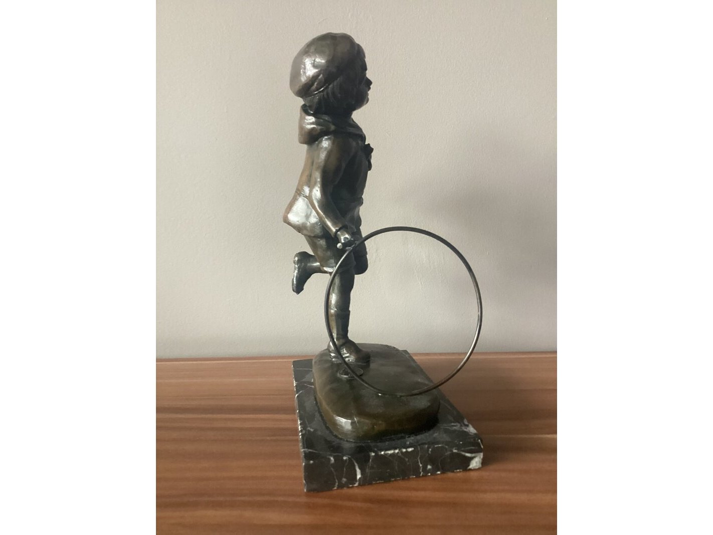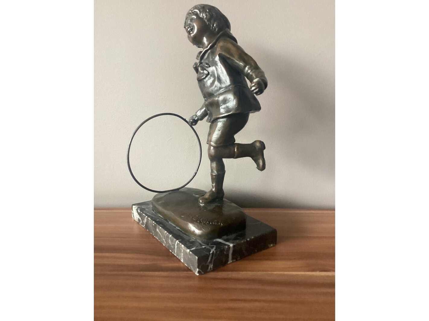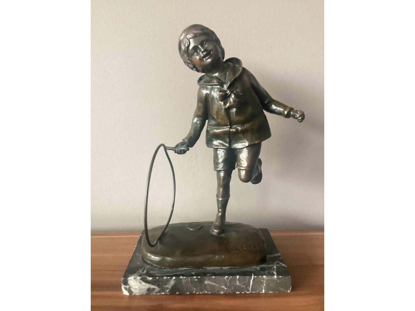 Product: Chiparus - 'Jongen speelt met hoepel' - Brons Conditie: Gebruikt Specificaties: Bronzen Beeld 'Jongen speelt met hoepel' Brons naar Demetre Harlamb Chiparus (1886-1947) Gesigneerd op de basement Gietersmerk op de basement "Deposée Garanti" Geheel op marmeren voet. In uitstekende conditie. H 23 cm x B 15 cm x D 9 cm. Totaal gewicht 1,7 KG (1700 Gram) Demetre Haralamb Chiparus (Dorohoi, 16 september 1886 - Parijs, 22 januari 1947) was een Roemeens art-deco-beeldhouwer die het grootste deel van zijn leven in Parijs werkte. Chiparus werd geboren in Roemenië in 1886 en reisde in 1912 naar Parijs.[1] Hij volgde school in Italië en aan de École des Beaux Arts in Parijs, en hij exposeerde op de Salon in 1914. Chiparus was bijzonder bedreven in de techniek van chryselephantine, de combinatie van brons en ivoor tot dramatische, gestileerde sculptuur te produceren. Hij produceerde de meeste van zijn beroemde werken tussen 1914 en 1933 in Parijs: het was een spannende plek in de jaren voorafgaand aan de Tweede Wereldoorlog, toen art-decostijl en swingende goede tijden in de mode waren net als in de Verenigde Staten. Zijn latere werk in de jaren 1920 werden beïnvloed door zijn interesse in Egypte, na de ontdekking van het graf van farao Toetanchamon. Enkele van zijn meest opwindende werken zijn dansers uit het Russische ballet, Franse theater, en het begin van bewegende beelden. Lange en magere danseressen werden uitgebeeld in beweging, gekleed in hoge art-decostijl. Chiparus werkte voornamelijk met de Etling Foundry in Parijs. Hij stierf in 1947.
