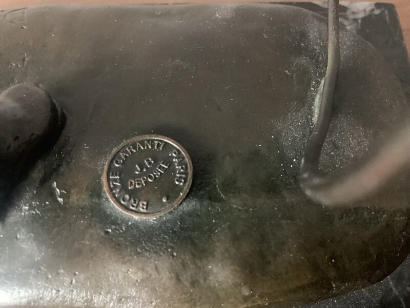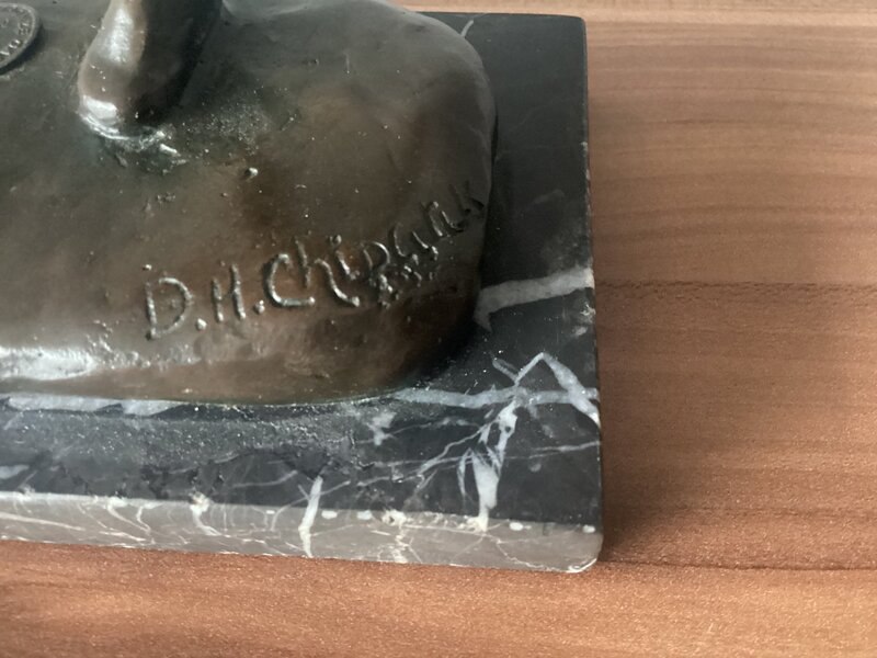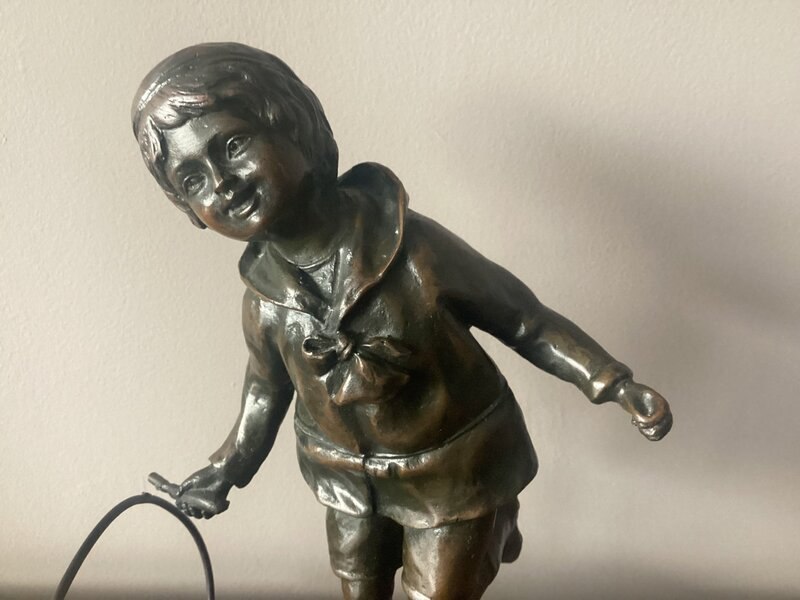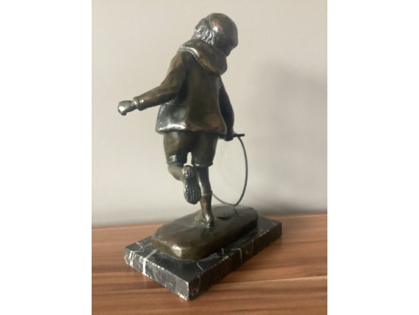 Product: Chiparus - 'Jongen speelt met hoepel' - Brons Conditie: Gebruikt Specificaties: Bronzen Beeld 'Jongen speelt met hoepel' Brons naar Demetre Harlamb Chiparus (1886-1947) Gesigneerd op de basement Gietersmerk op de basement "Deposée Garanti" Geheel op marmeren voet. In uitstekende conditie. H 23 cm x B 15 cm x D 9 cm. Totaal gewicht 1,7 KG (1700 Gram) Demetre Haralamb Chiparus (Dorohoi, 16 september 1886 - Parijs, 22 januari 1947) was een Roemeens art-deco-beeldhouwer die het grootste deel van zijn leven in Parijs werkte. Chiparus werd geboren in Roemenië in 1886 en reisde in 1912 naar Parijs.[1] Hij volgde school in Italië en aan de École des Beaux Arts in Parijs, en hij exposeerde op de Salon in 1914. Chiparus was bijzonder bedreven in de techniek van chryselephantine, de combinatie van brons en ivoor tot dramatische, gestileerde sculptuur te produceren. Hij produceerde de meeste van zijn beroemde werken tussen 1914 en 1933 in Parijs: het was een spannende plek in de jaren voorafgaand aan de Tweede Wereldoorlog, toen art-decostijl en swingende goede tijden in de mode waren net als in de Verenigde Staten. Zijn latere werk in de jaren 1920 werden beïnvloed door zijn interesse in Egypte, na de ontdekking van het graf van farao Toetanchamon. Enkele van zijn meest opwindende werken zijn dansers uit het Russische ballet, Franse theater, en het begin van bewegende beelden. Lange en magere danseressen werden uitgebeeld in beweging, gekleed in hoge art-decostijl. Chiparus werkte voornamelijk met de Etling Foundry in Parijs. Hij stierf in 1947.