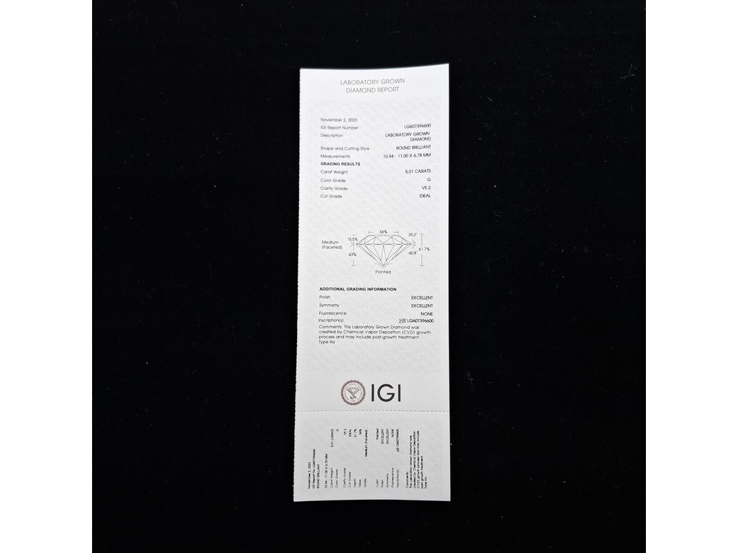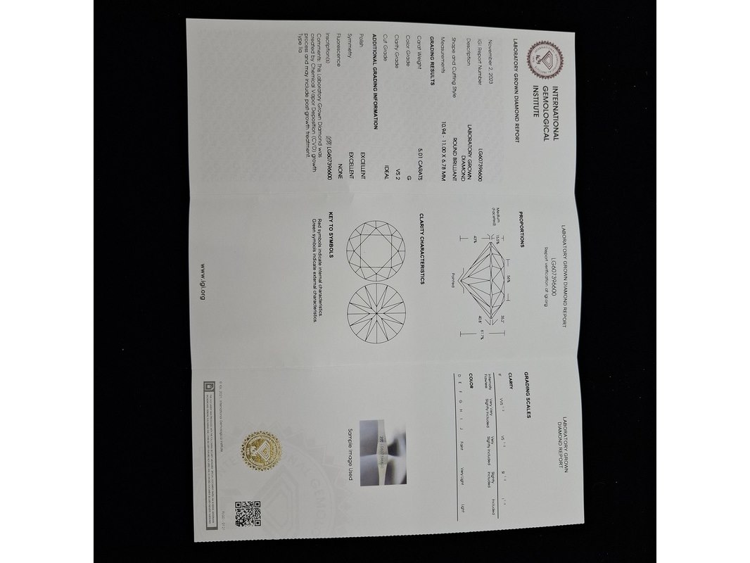 Product: 5.01 karaat diamant (gecertificeerd) Conditie: Nieuw Specificaties: Eco (lab-grown) Gewicht: 5.01 karaat Kleur: G Zuiverte: VS2 Slijpvorm: Excellent Certificaat: IGI (LG607396600)