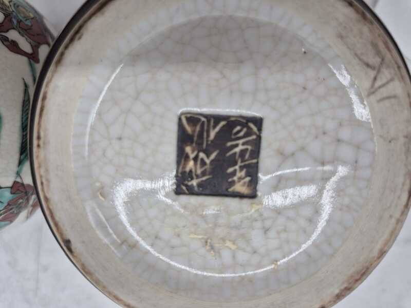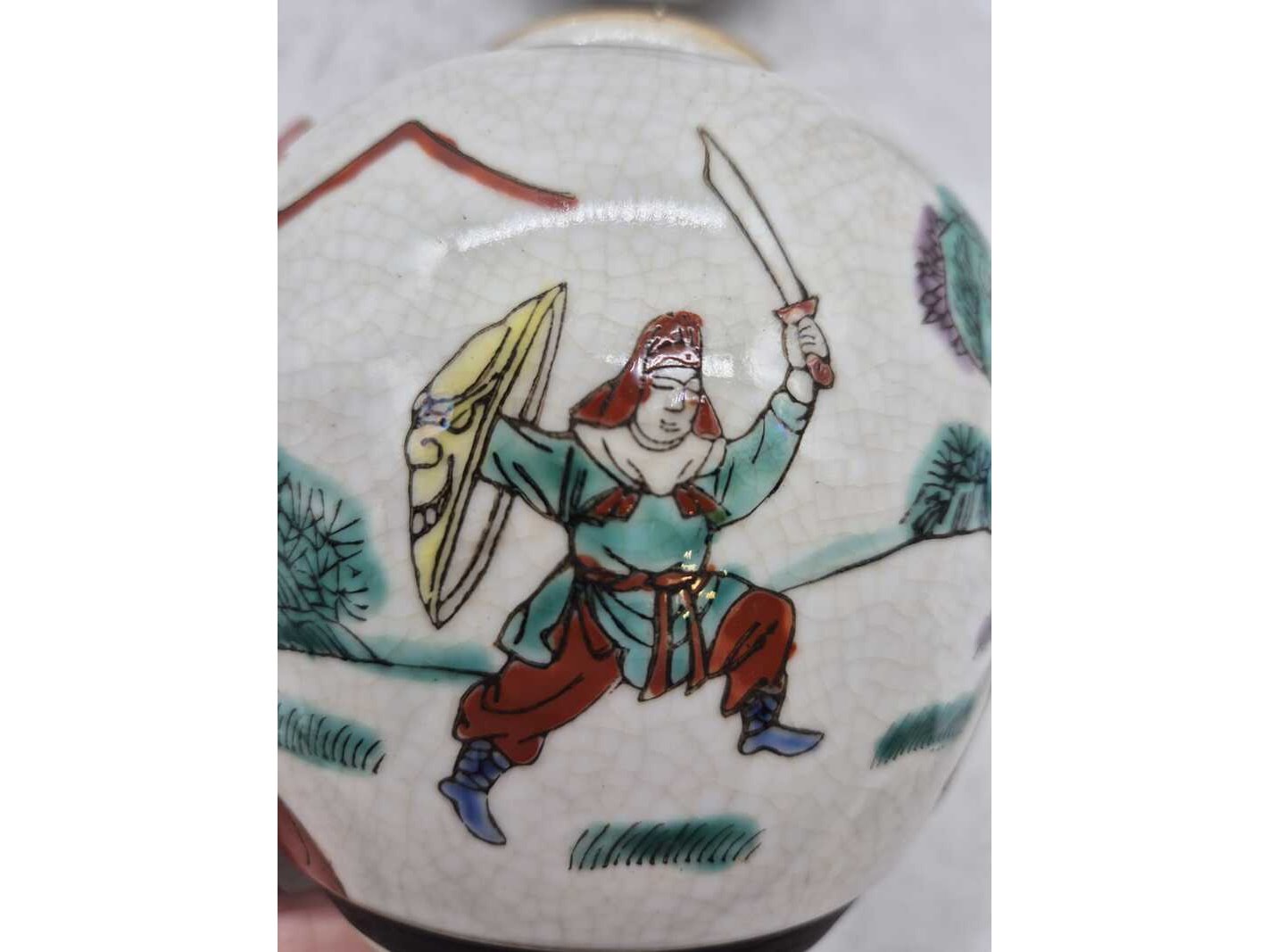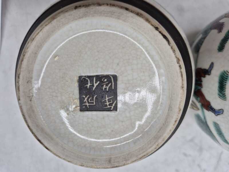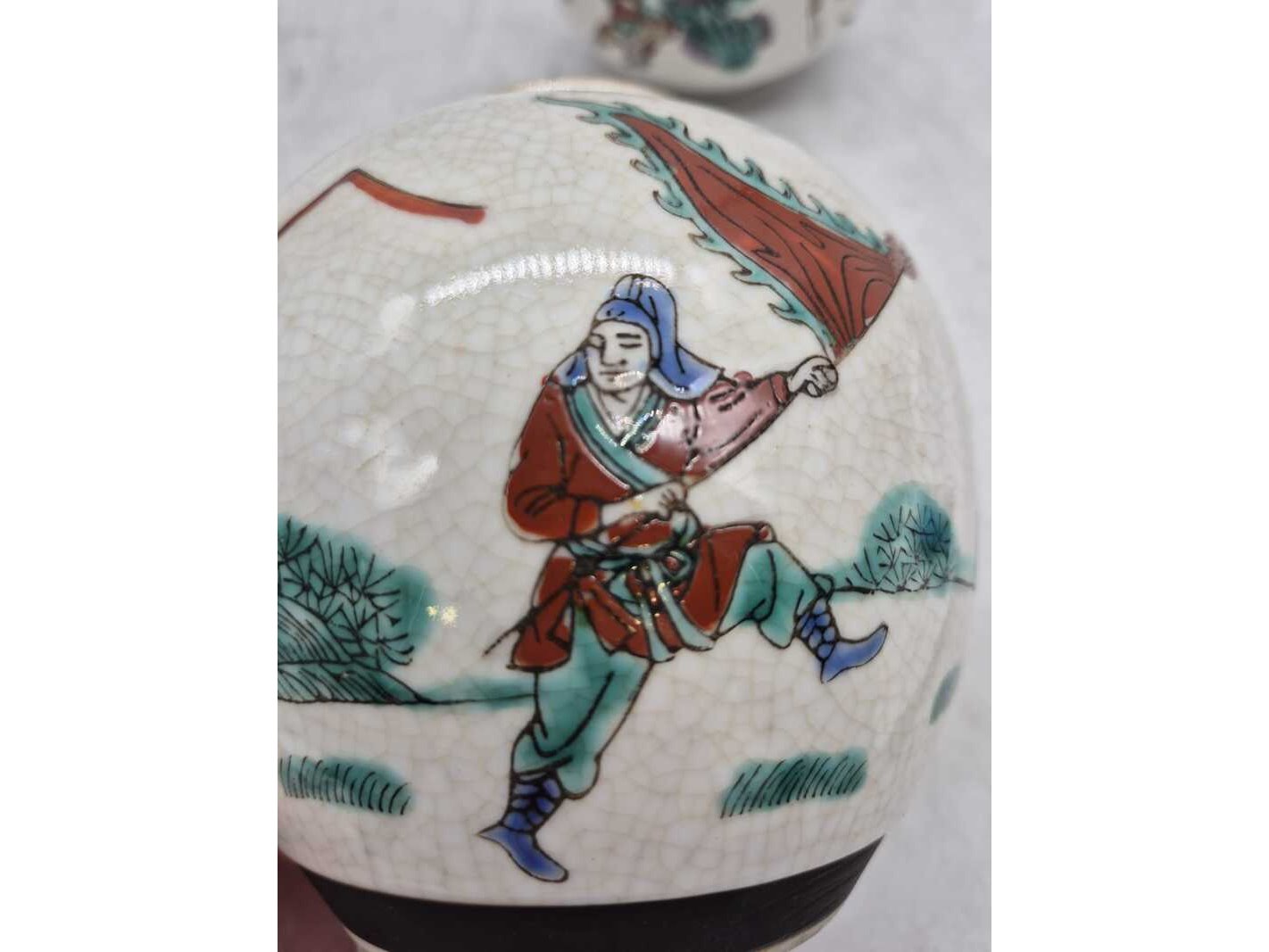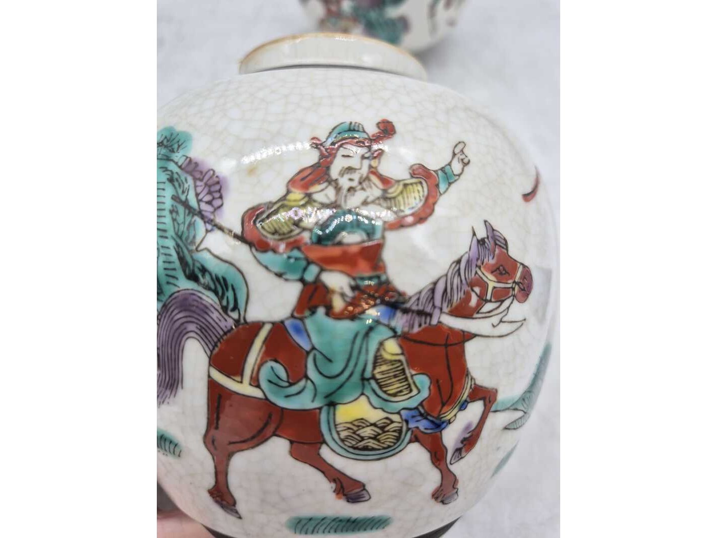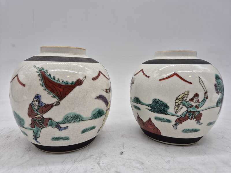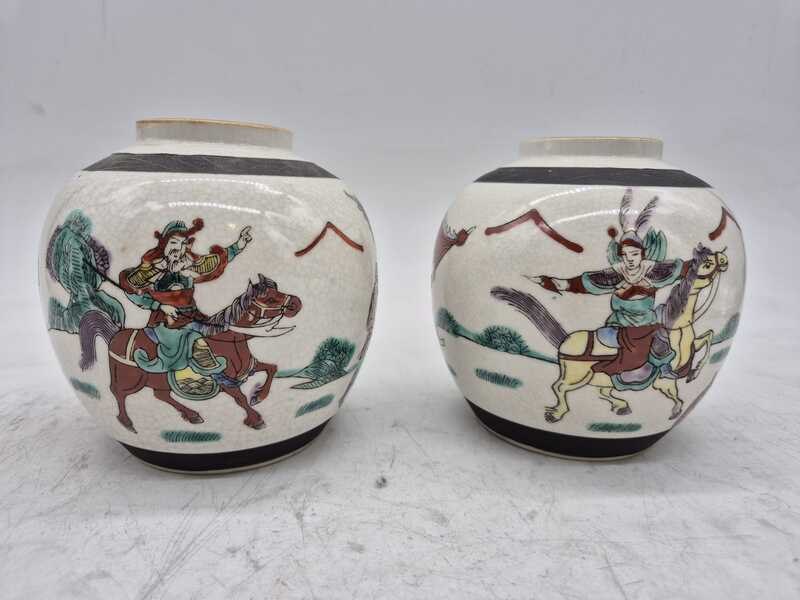 Product: Gemberpotten Materiaal: Keramiek en aardewerk Specificaties: Decoratieve set van twee gemberpotten in Aziatische stijl met craquelé glazuur, rondom beschilderd met dynamische krijgersvoorstellingen in een gestileerd landschap
